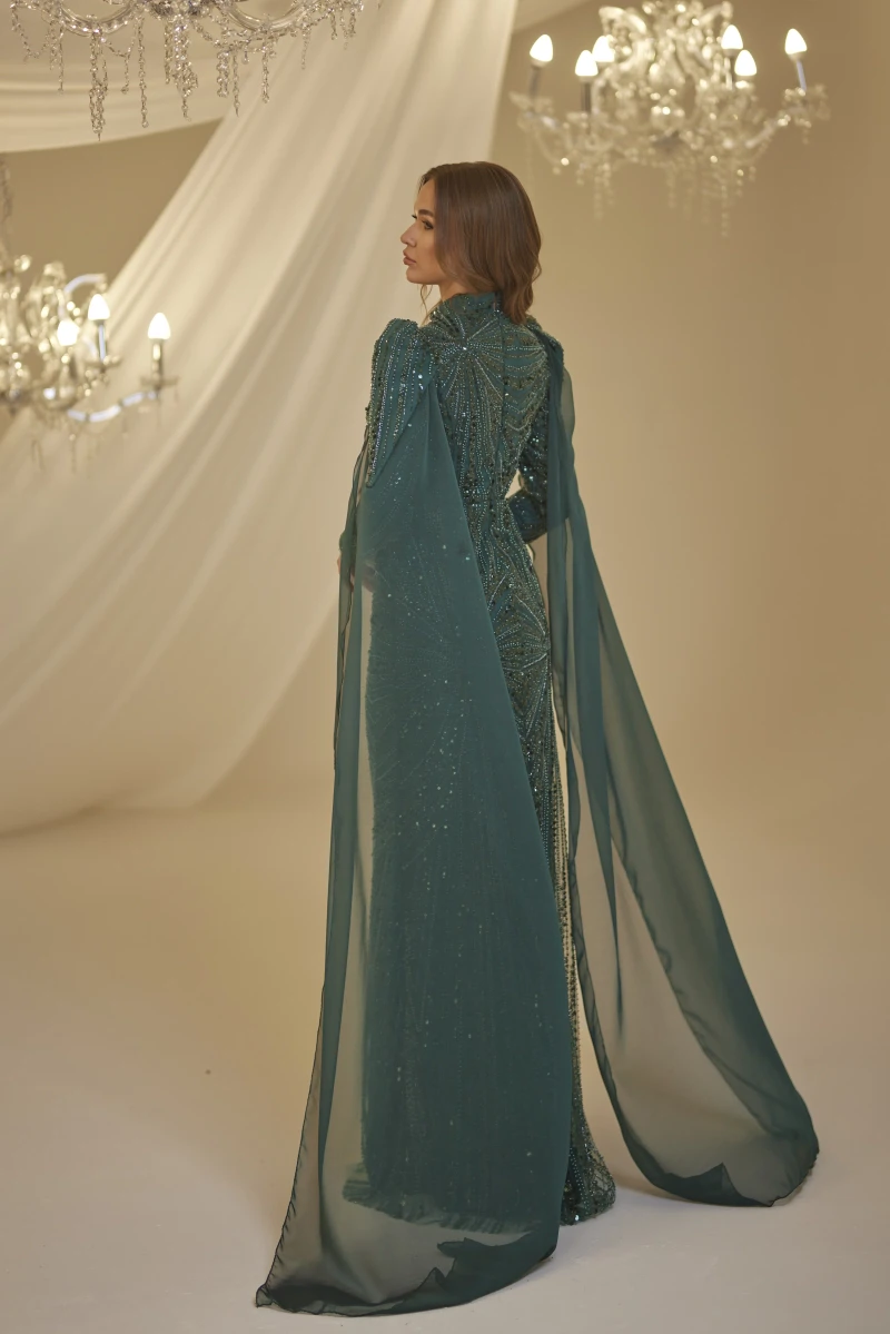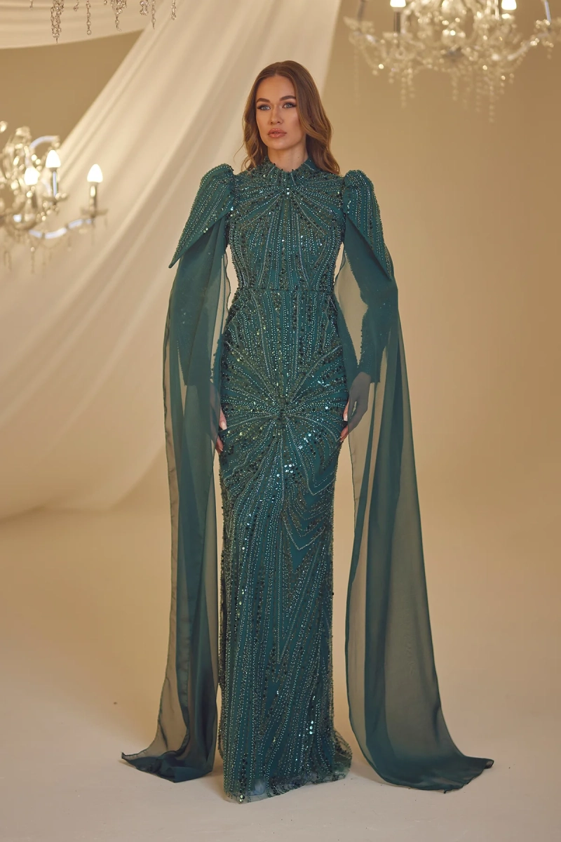 Designed with elegant tulle shoulder accents and fully embellished with shimmering beadwork, our Işıl evening gown brings radiant glamour to any formal occasion. This modest gown features a hidden zipper closure at the back and comes fully lined for comfort and coverage.