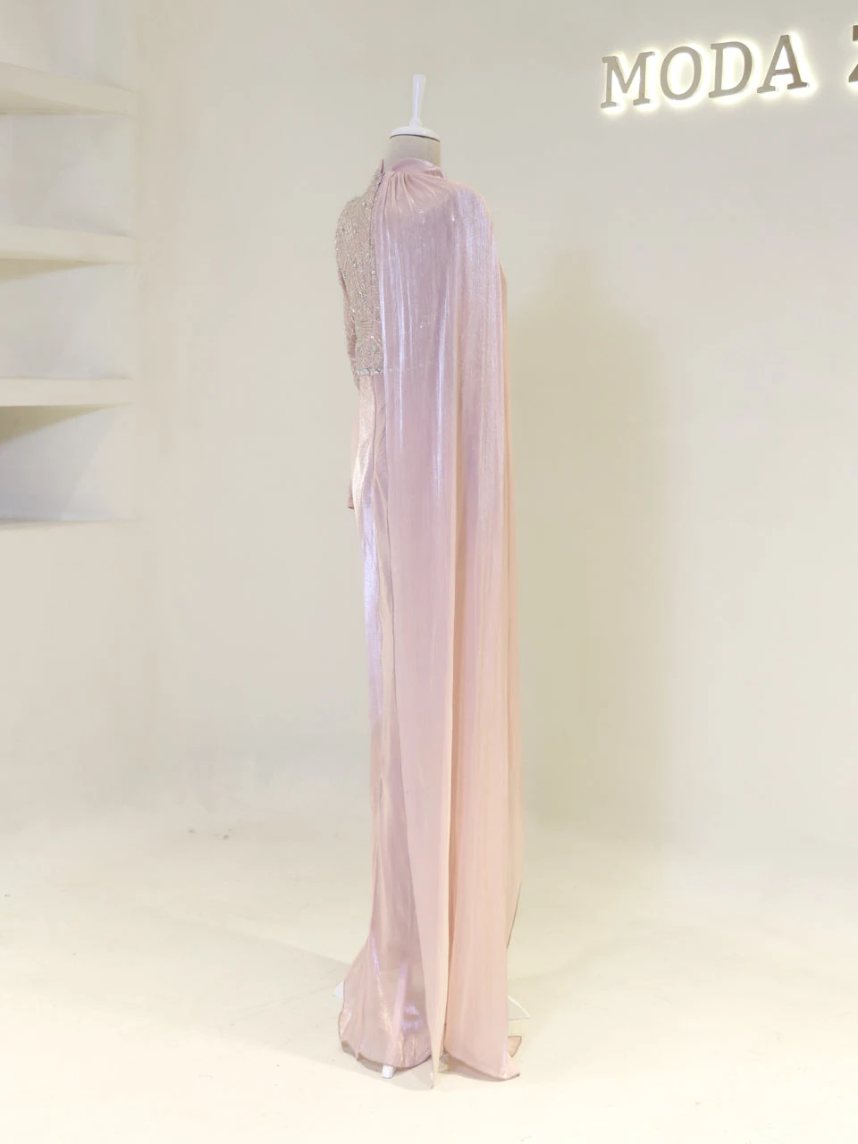 The Serein Modest Evening Dress is designed with precision, offering a true-to-size fit. The front length of the dress is 150 cm, with an additional 15 cm at the back. Made from orchid fabric, it features a zipper closure at the back for easy wear. The dress includes a built-in chest pad and is fully lined for comfort. A distinctive cape detail extends from the right shoulder to the hemline, adding a touch of sophistication. The embellishments are securely stitched and adhered, ensuring durability. The dress has a straight skirt form, providing a sleek silhouette.