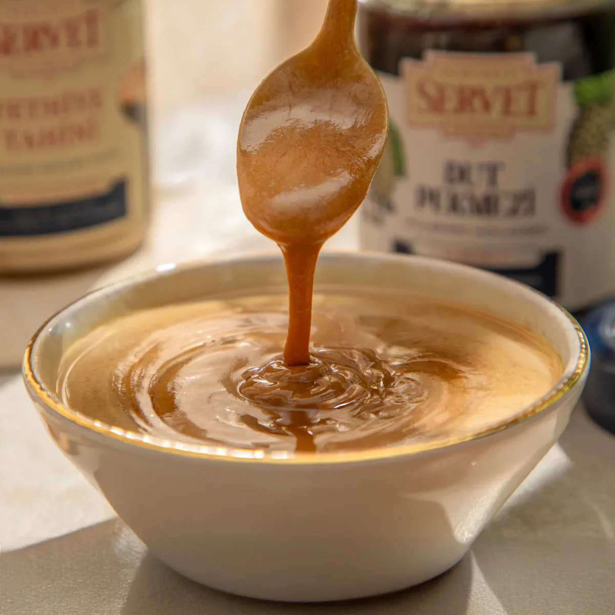 Servet Tahini 300g and Dut Pekmezi 400g are offered together at a competitive price. The tahini is made from stone-milled local sesame, while the pekmez is gluten-free and produced without added sugar.
