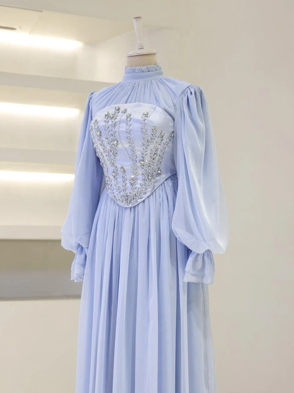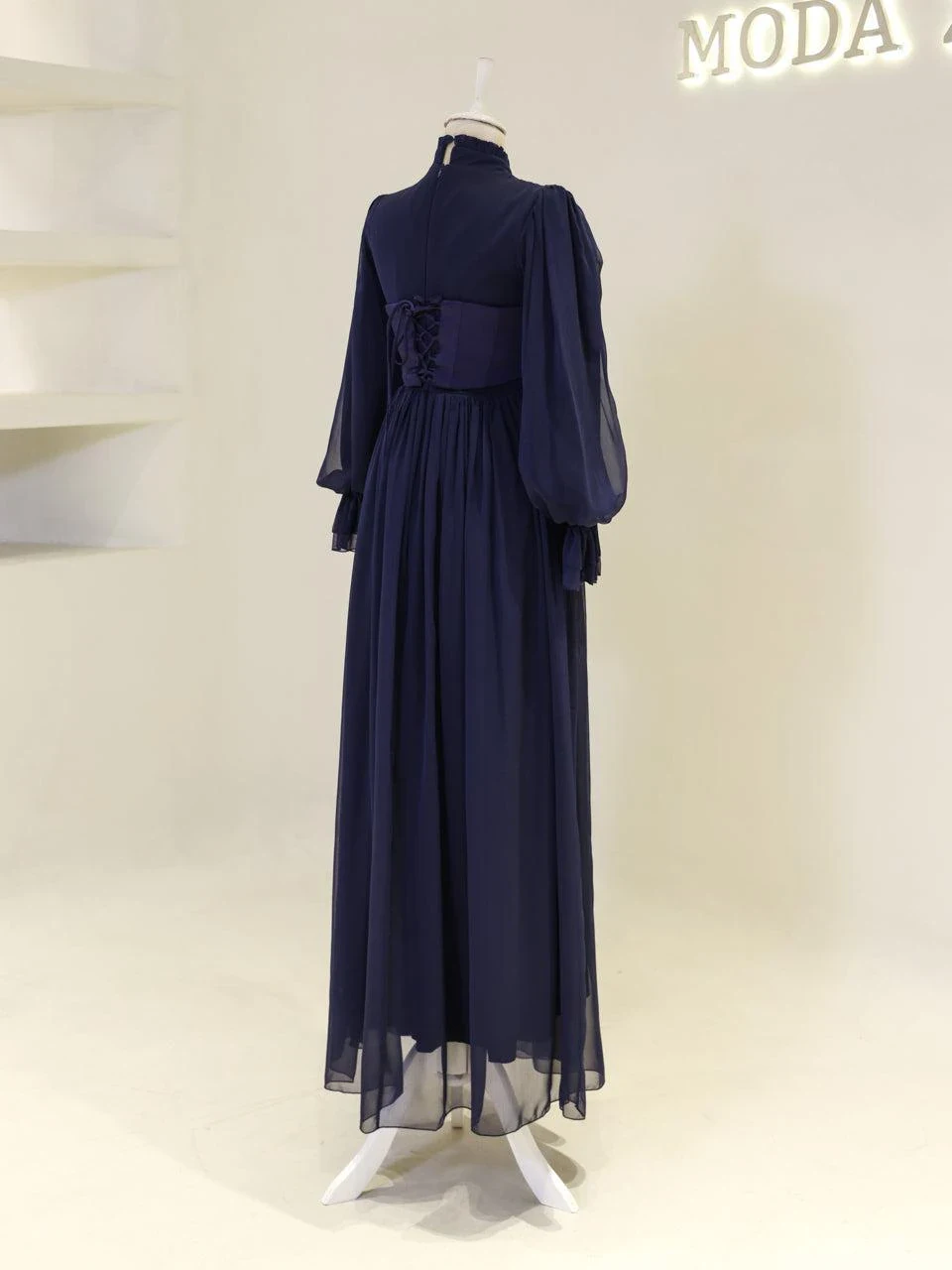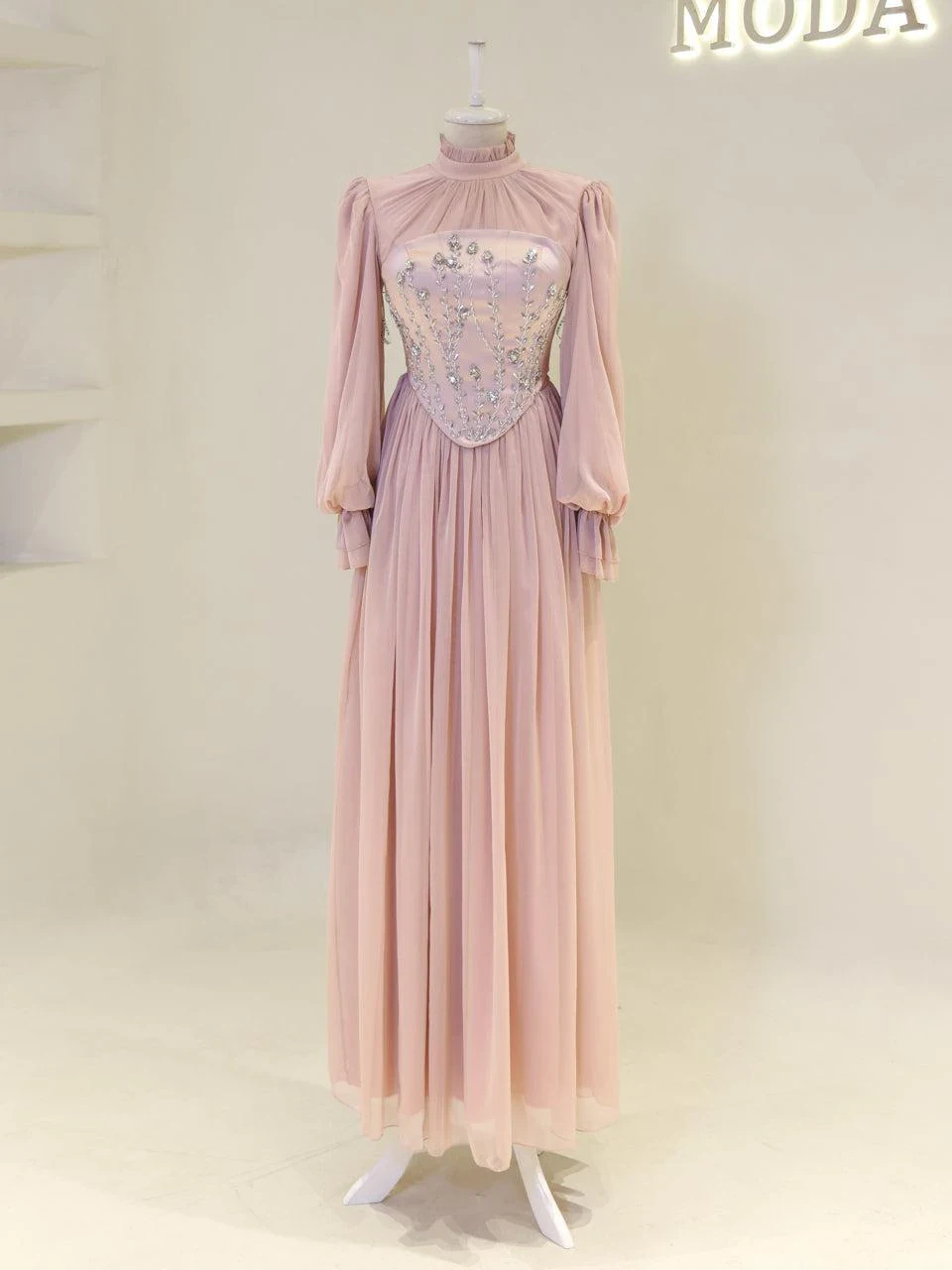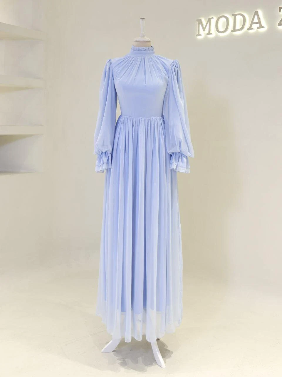 The Shirin Modest Evening Dress is designed with a full-length fit, measuring approximately 155 cm. Made from chiffon fabric, it features a lining for added comfort. The dress is equipped with a back zipper for easy wear and showcases balloon sleeves for a touch of elegance. It includes a detachable corset detail and is crafted with non-adhesive embellishments. The dress has a flared skirt design.