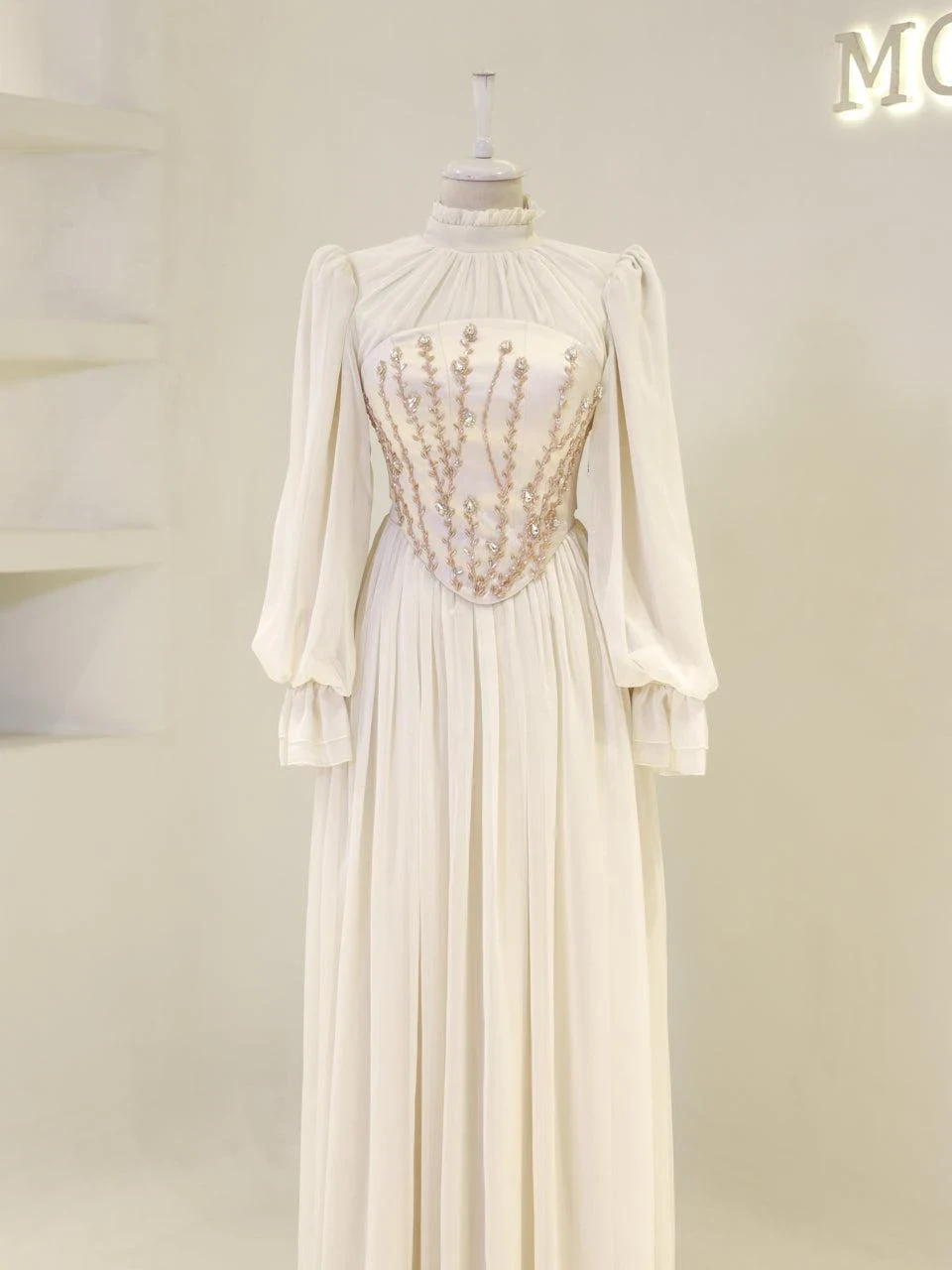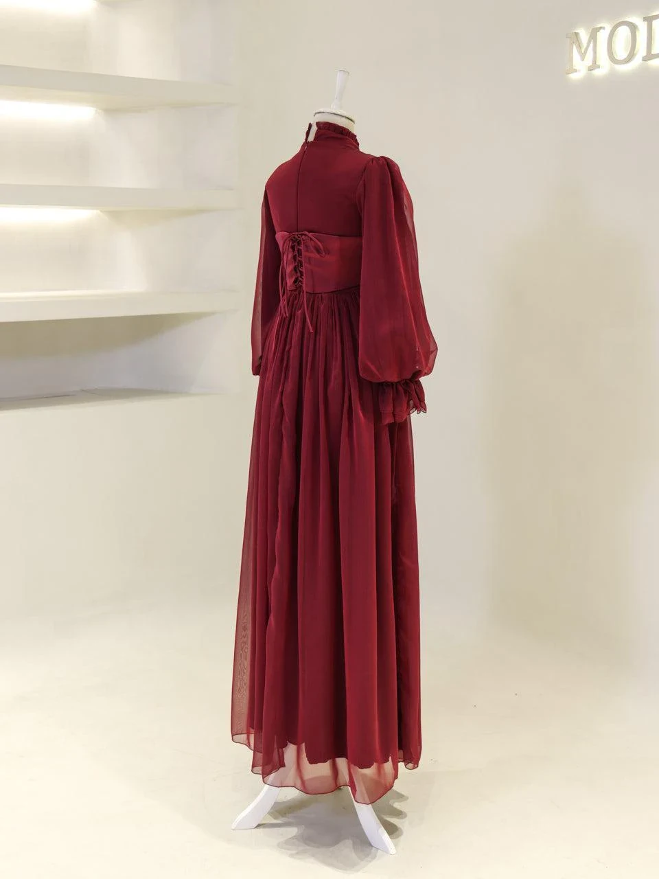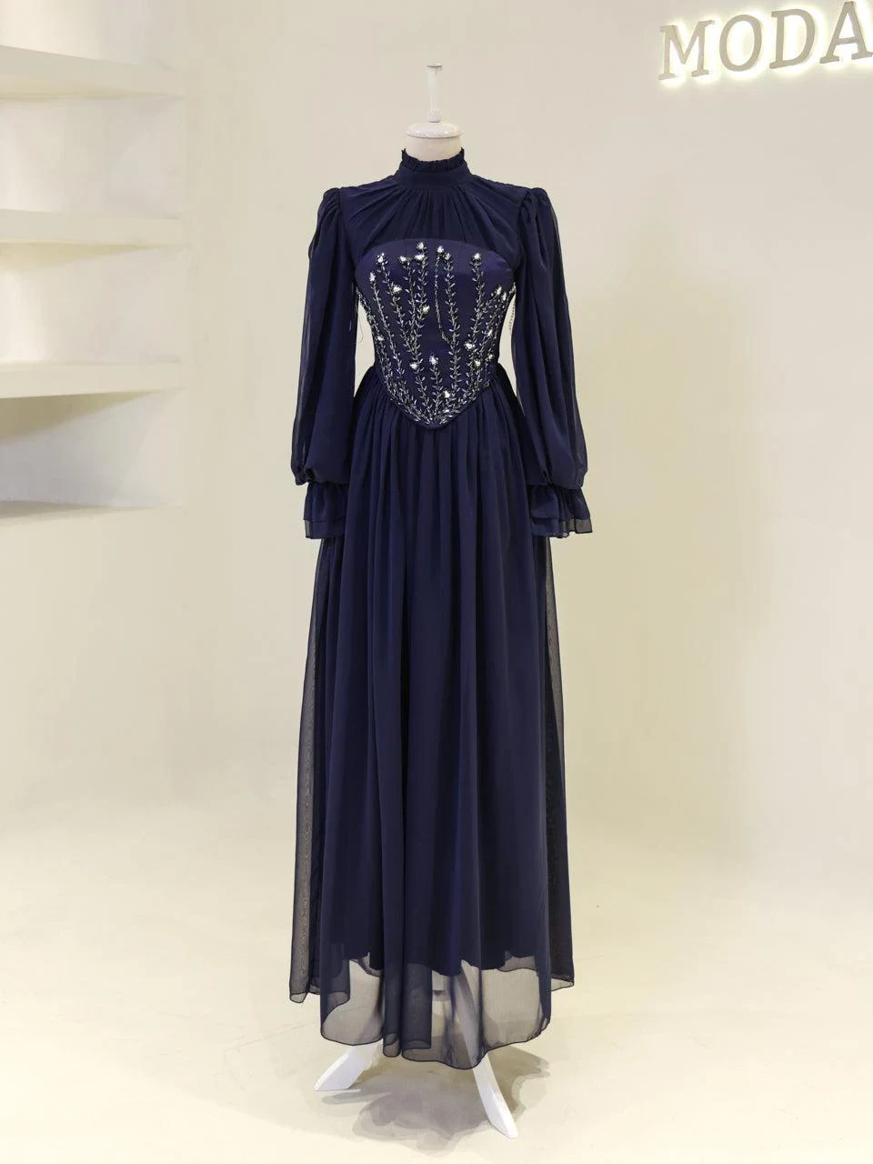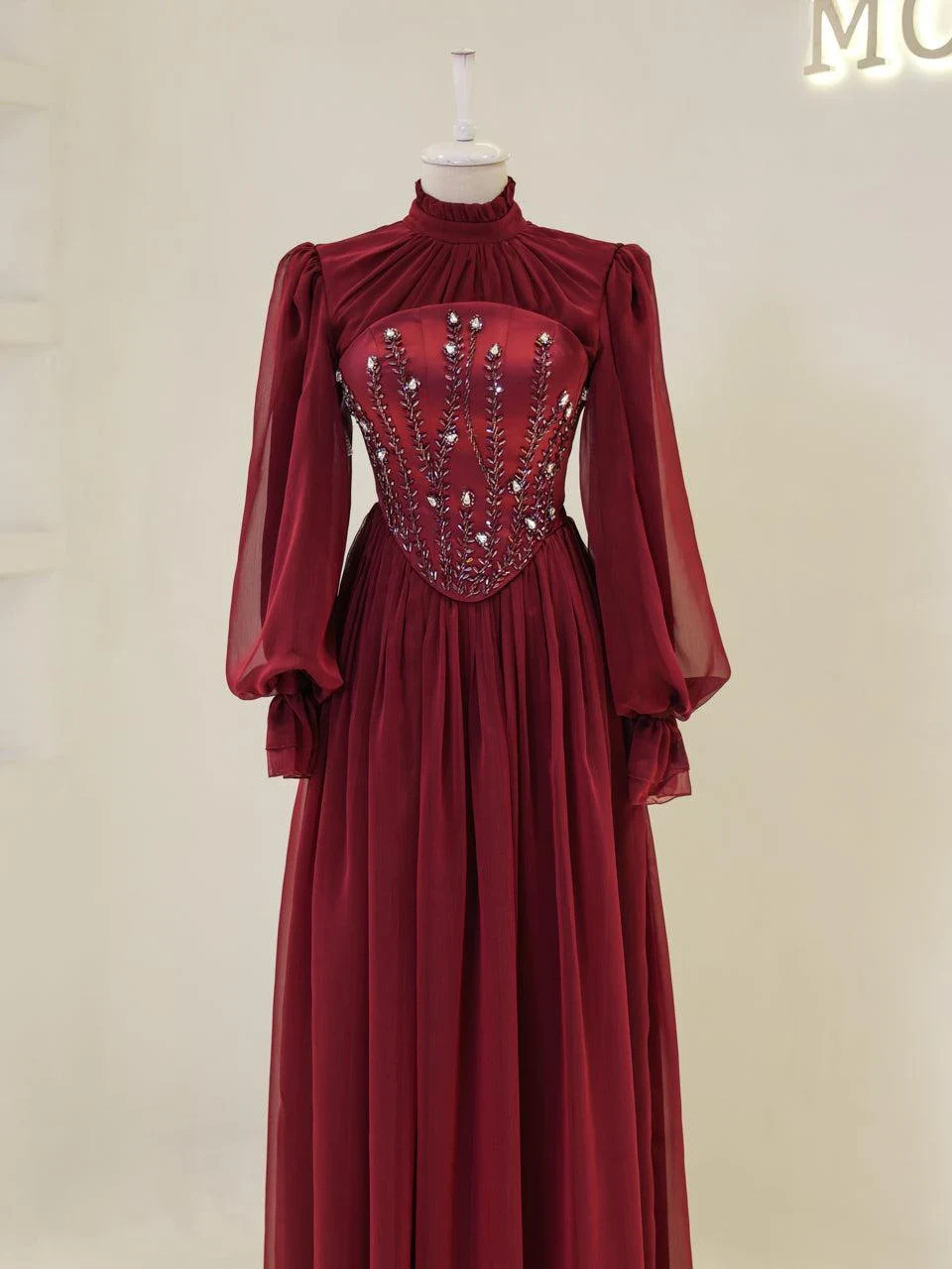 The Shirin Modest Evening Dress is designed with a full-length fit, measuring approximately 155 cm. Made from chiffon fabric, it features a lining for added comfort. The dress is equipped with a back zipper for easy wear and showcases balloon sleeves for a touch of elegance. It includes a detachable corset detail and is crafted with non-adhesive embellishments. The dress has a flared skirt design.