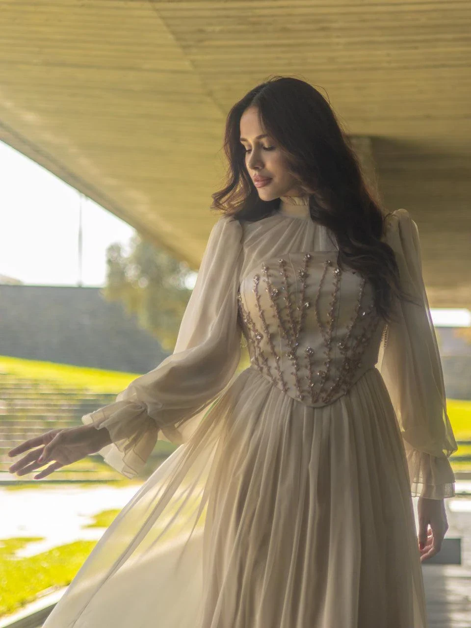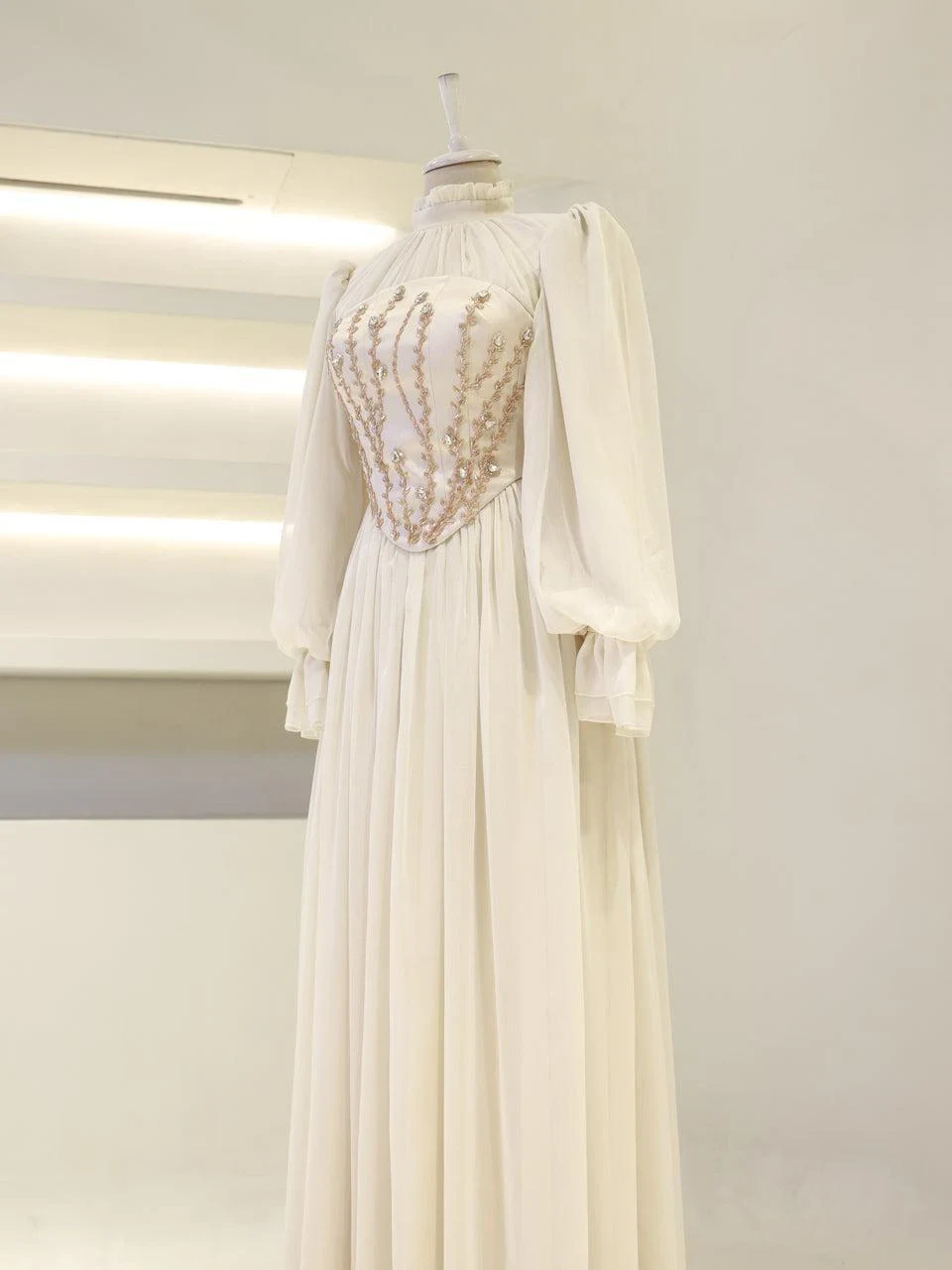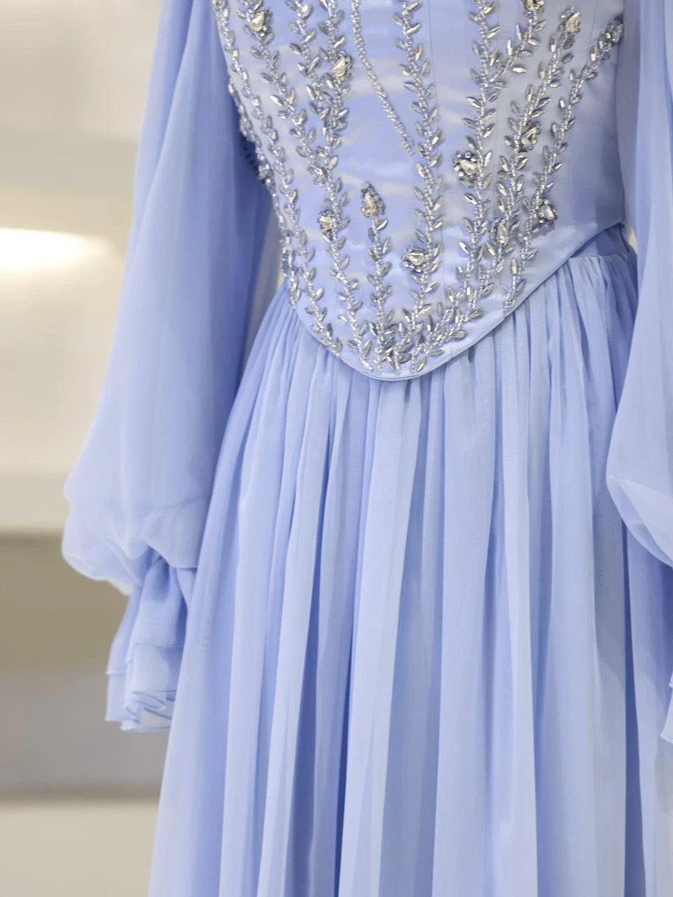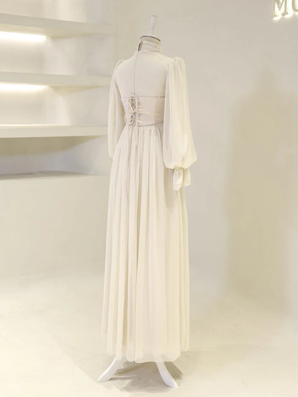 The Shirin Modest Evening Dress is designed with a full-length fit, measuring approximately 155 cm. Made from chiffon fabric, it features a lining for added comfort. The dress is equipped with a back zipper for easy wear and showcases balloon sleeves for a touch of elegance. It includes a detachable corset detail and is crafted with non-adhesive embellishments. The dress has a flared skirt design.