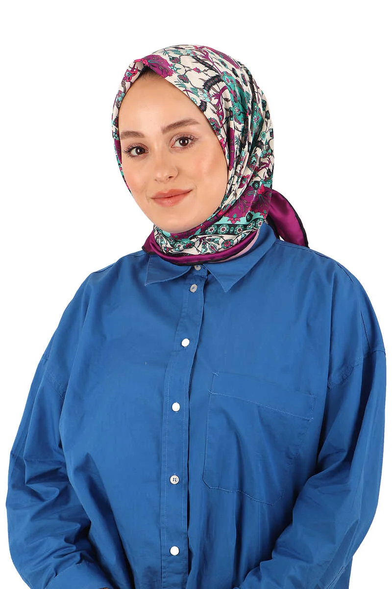 The Mürdüm Çini Lale Desen İpeksi Eşarp is made from 100% silky rayon fabric and measures 90×90 cm. It features vibrant floral patterns and originates from Bursa, Turkey.