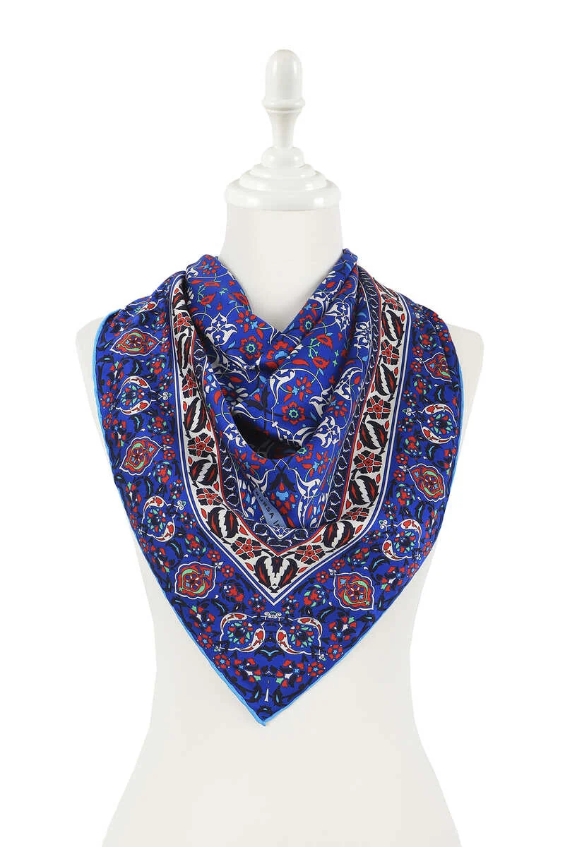 The Saks Türk Motifli Çini Desen İpeksi Eşarp is made from 100% silky rayon fabric and measures 90×90 cm. It features vibrant colors with a traditional pattern, originating from Bursa, Turkey.