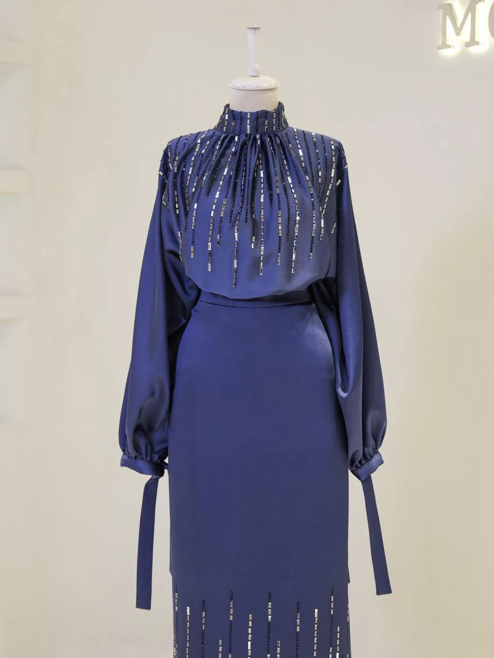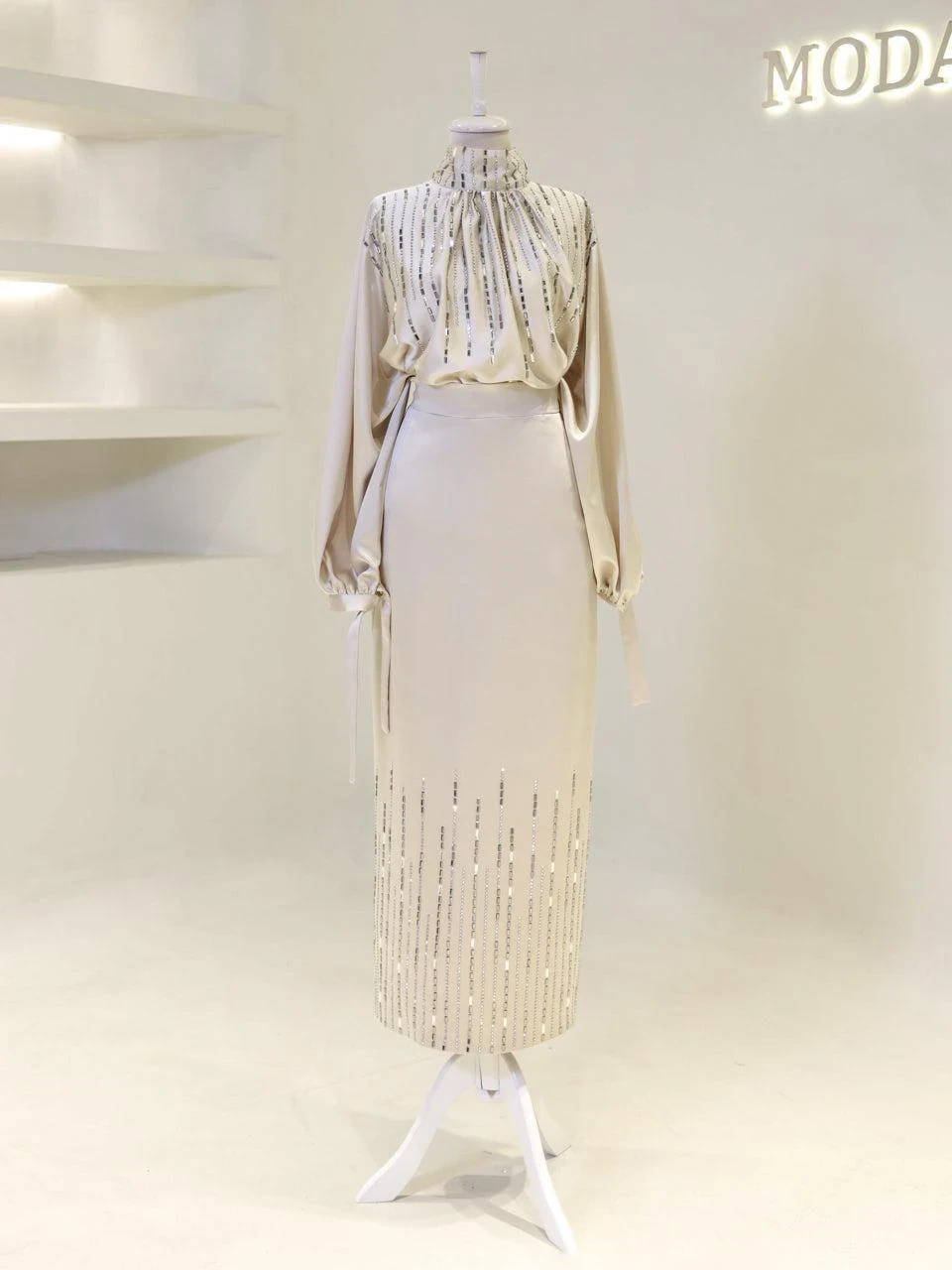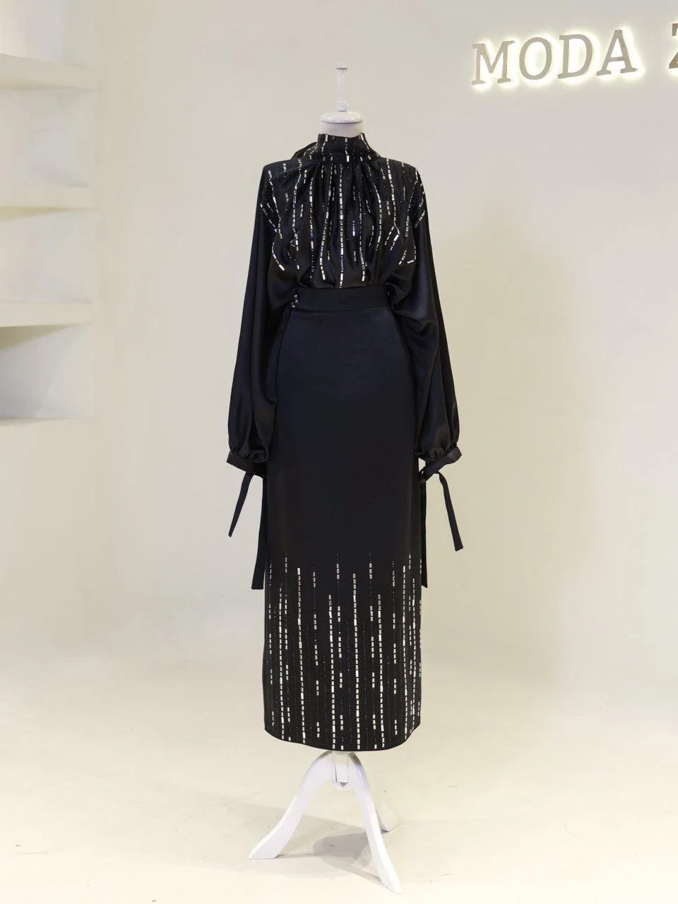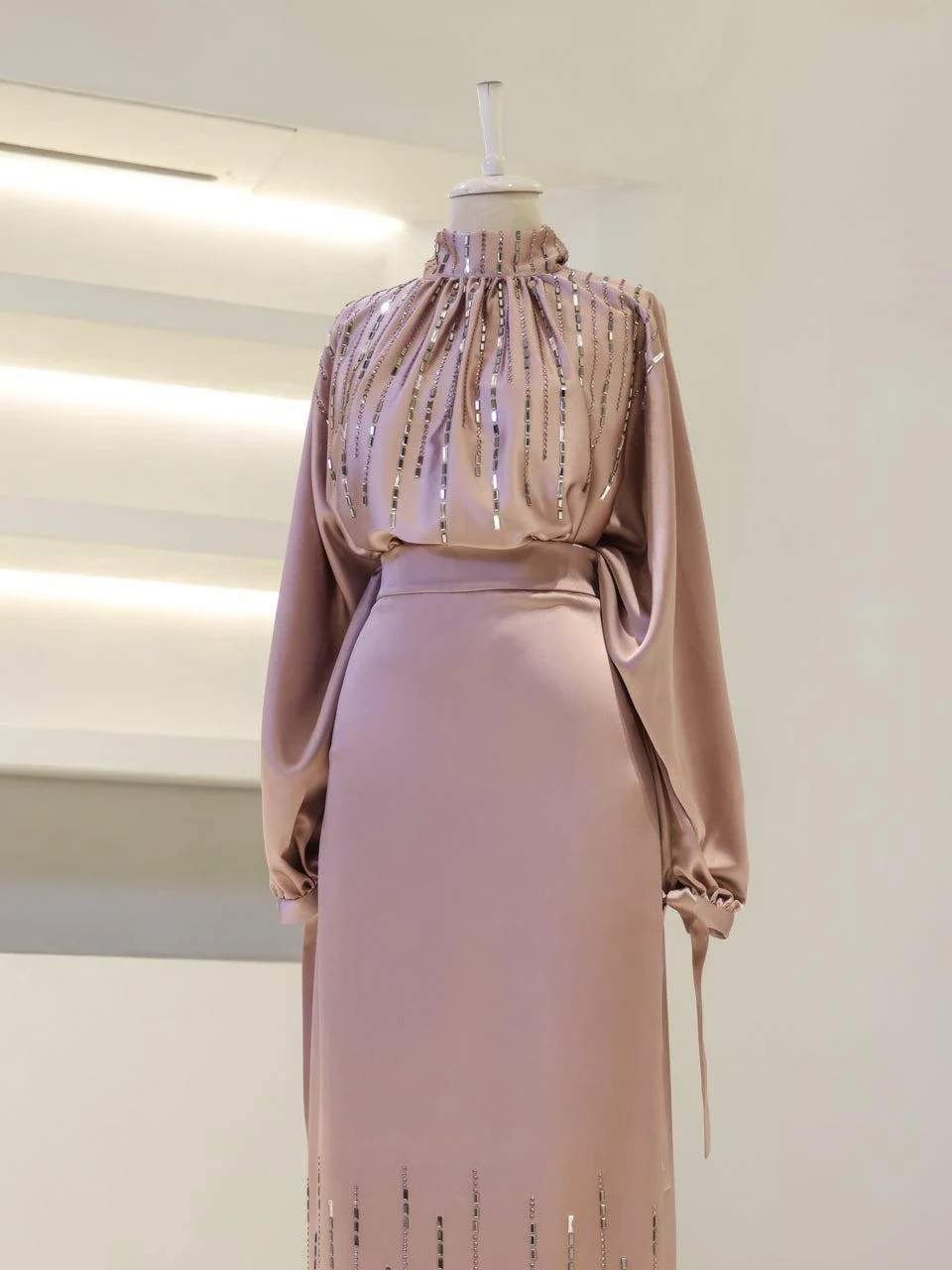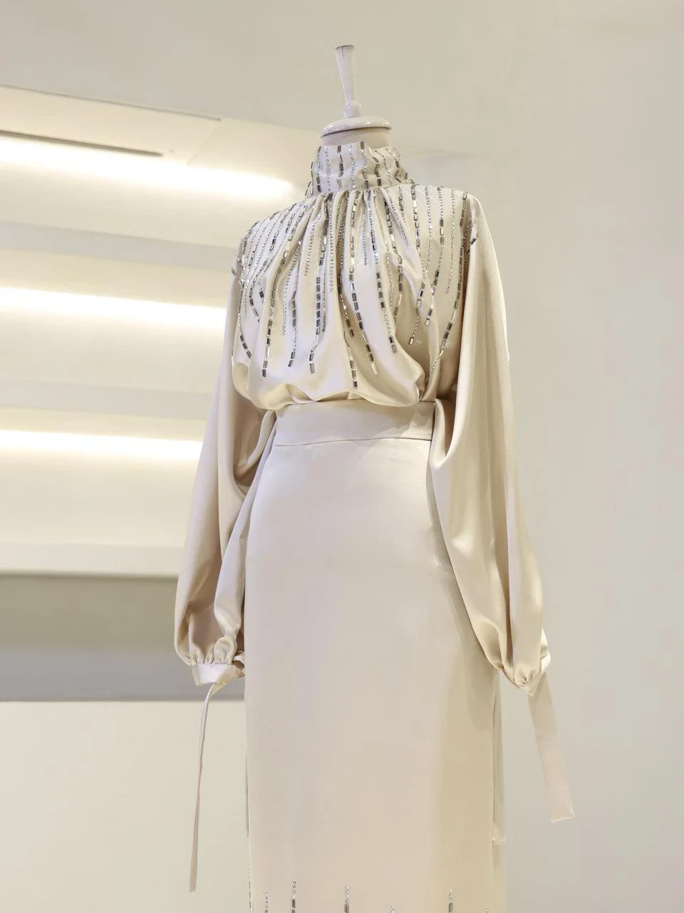 The Sintra Modest Set is designed with a precise fit, offering a sophisticated look with its satin fabric. The skirt length averages 105 cm, while the top measures approximately 65 cm. This set includes a lined interior for added comfort and features a back zipper closure. The balloon sleeves and tie cuffs add a distinct touch, and the set is accented with adhesive embellishments. The skirt has a pencil form, enhancing its elegant silhouette.