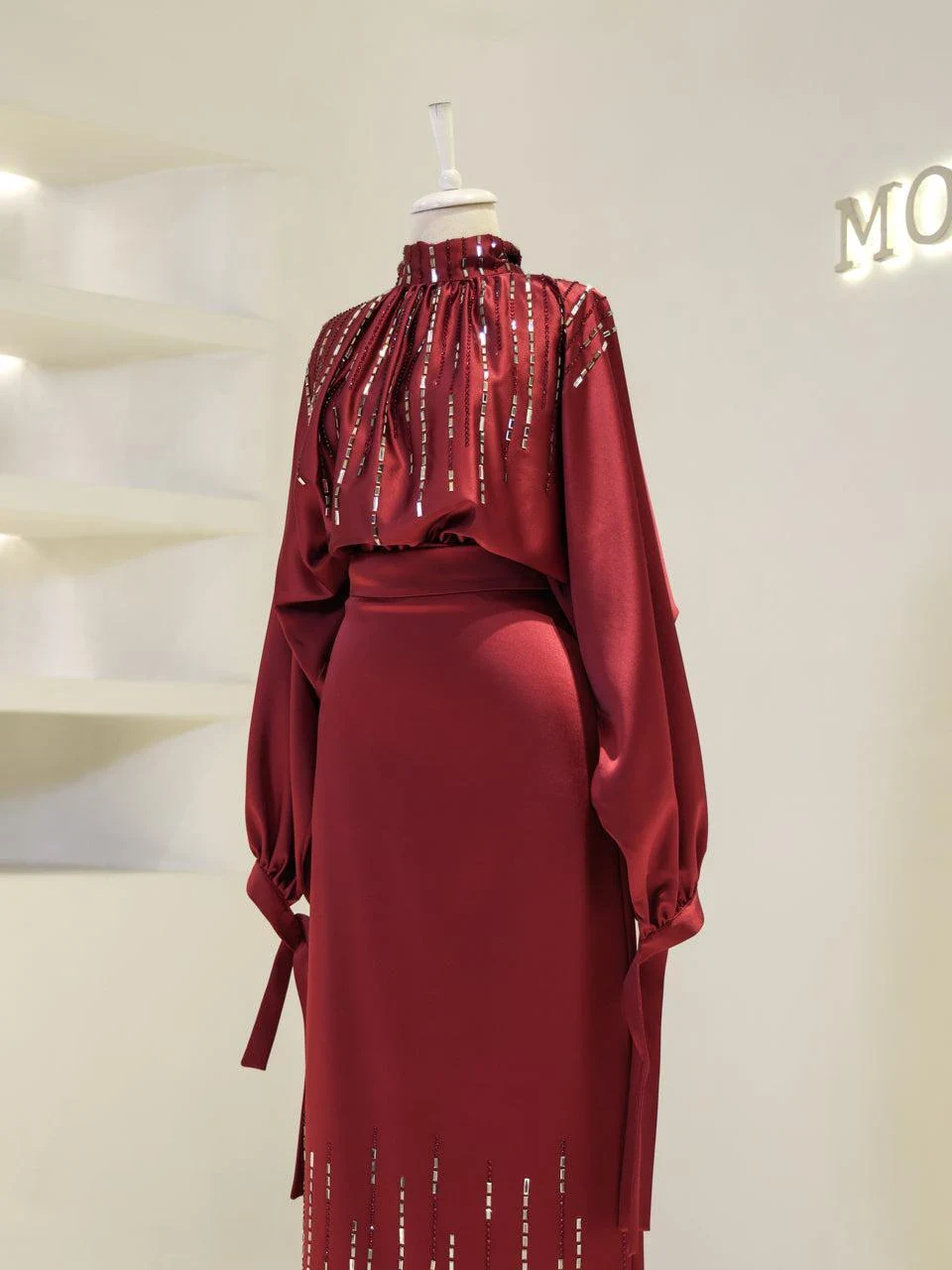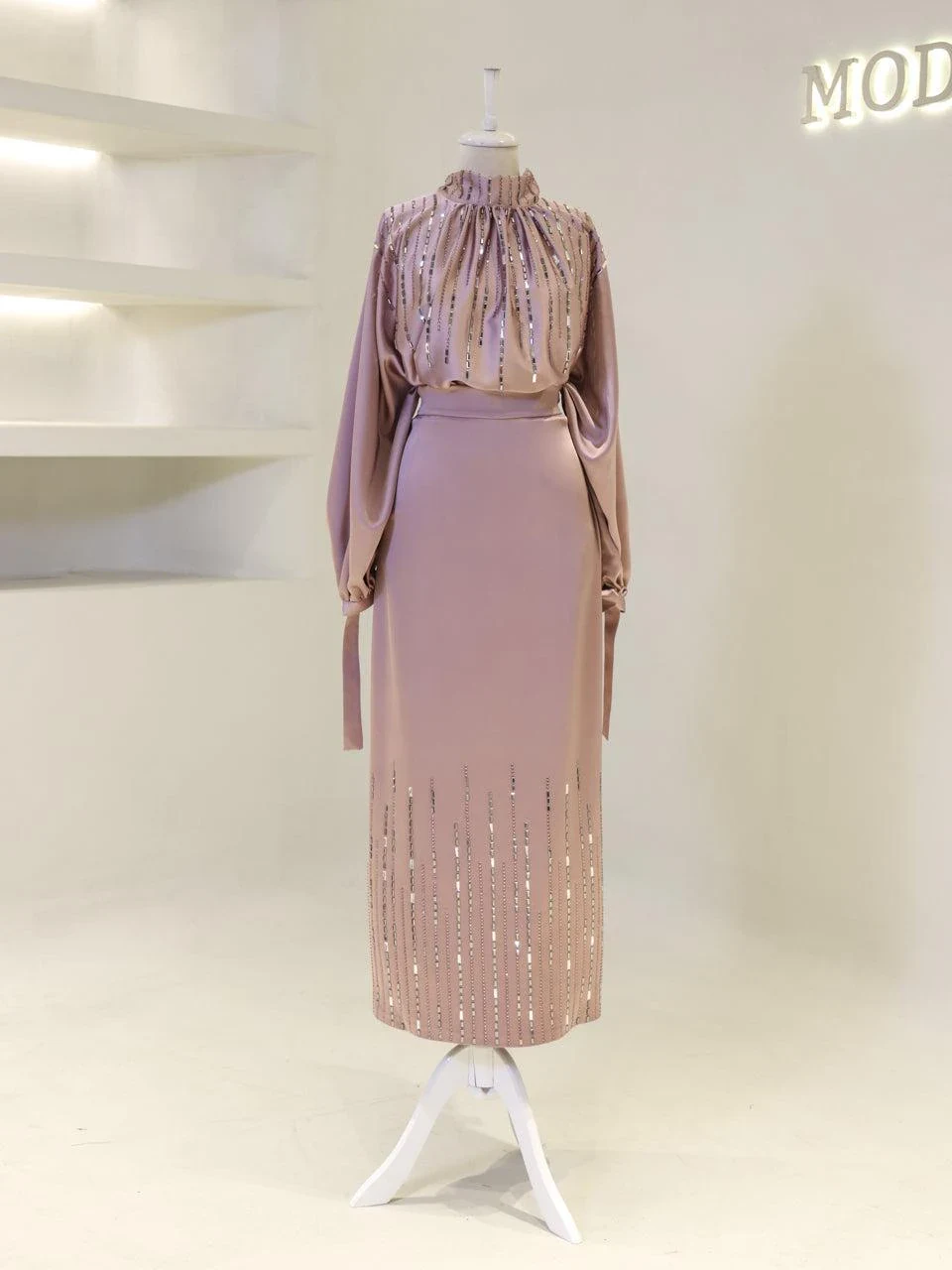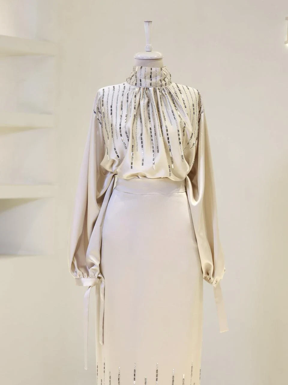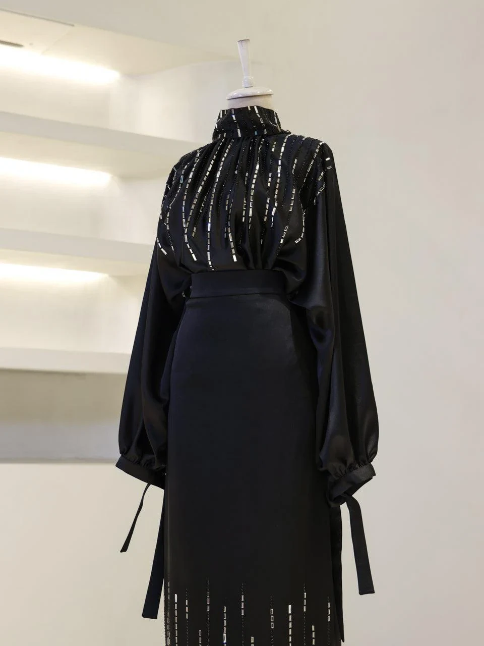The Sintra Modest Set is designed with a precise fit, offering a sophisticated look with its satin fabric. The skirt length averages 105 cm, while the top measures approximately 65 cm. This set includes a lined interior for added comfort and features a back zipper closure. The balloon sleeves and tie cuffs add a distinct touch, and the set is accented with adhesive embellishments. The skirt has a pencil form, enhancing its elegant silhouette.