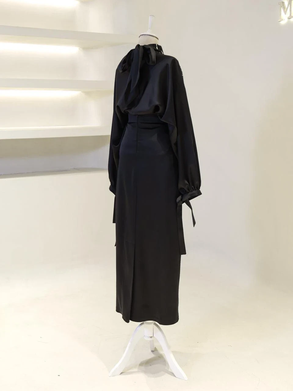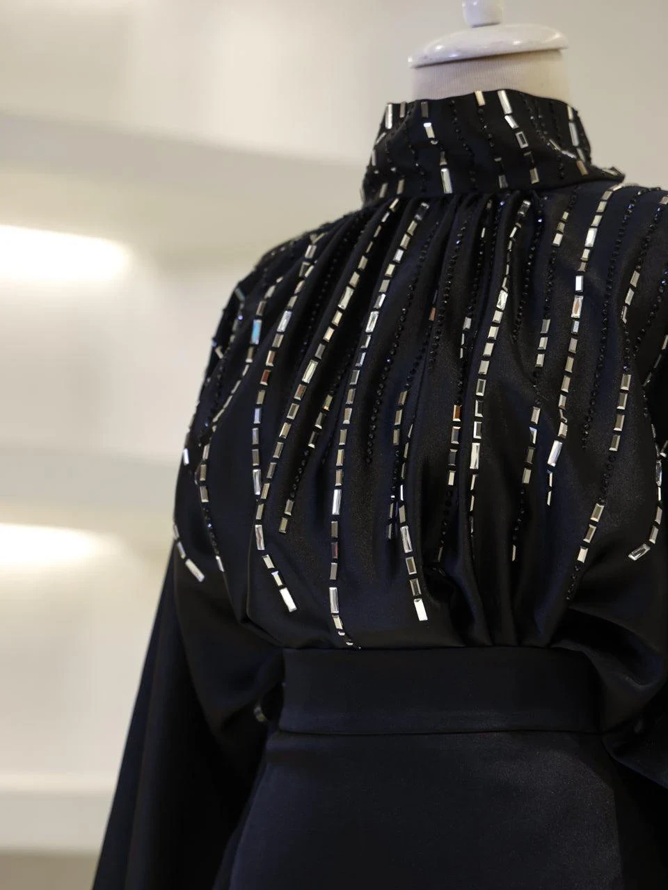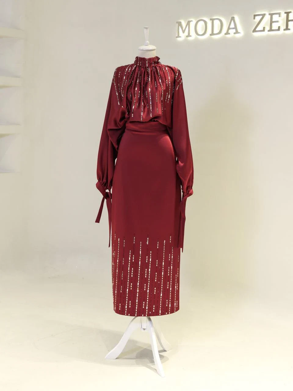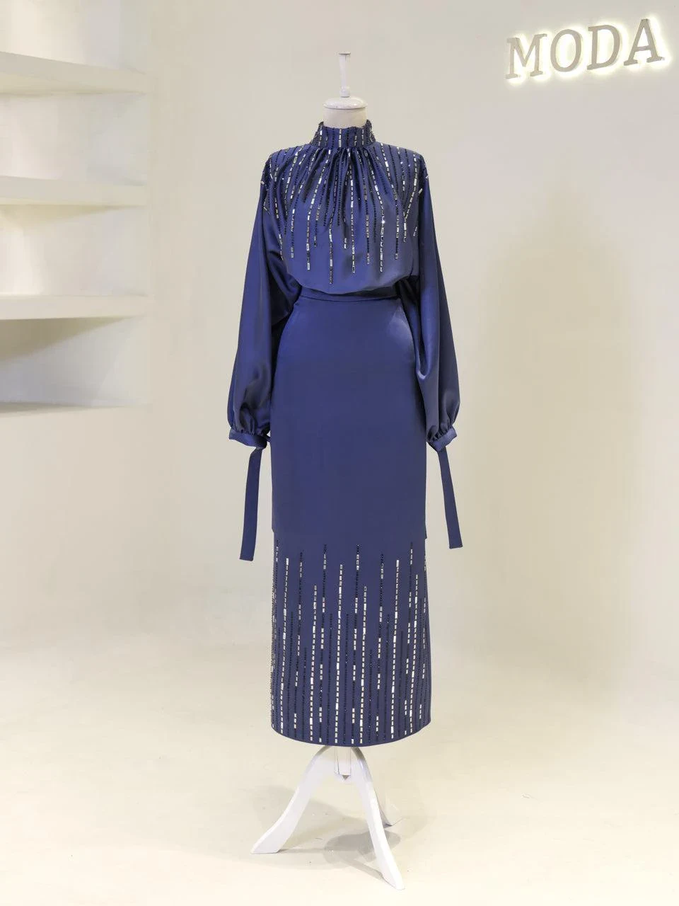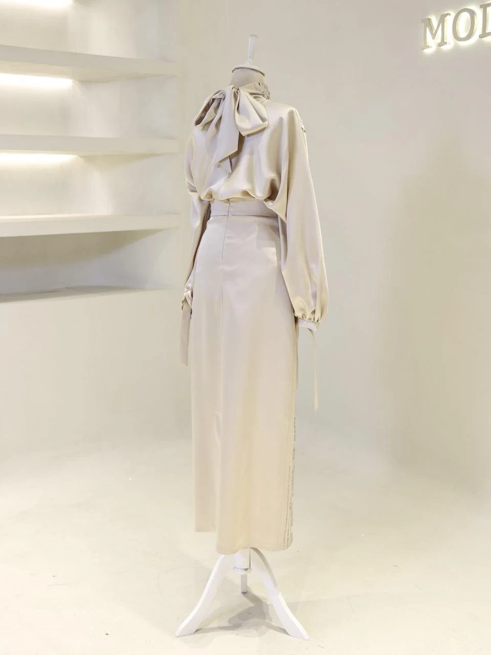 The Sintra Modest Set is designed with a precise fit, offering a sophisticated look with its satin fabric. The skirt length averages 105 cm, while the top measures approximately 65 cm. This set includes a lined interior for added comfort and features a back zipper closure. The balloon sleeves and tie cuffs add a distinct touch, and the set is accented with adhesive embellishments. The skirt has a pencil form, enhancing its elegant silhouette.
