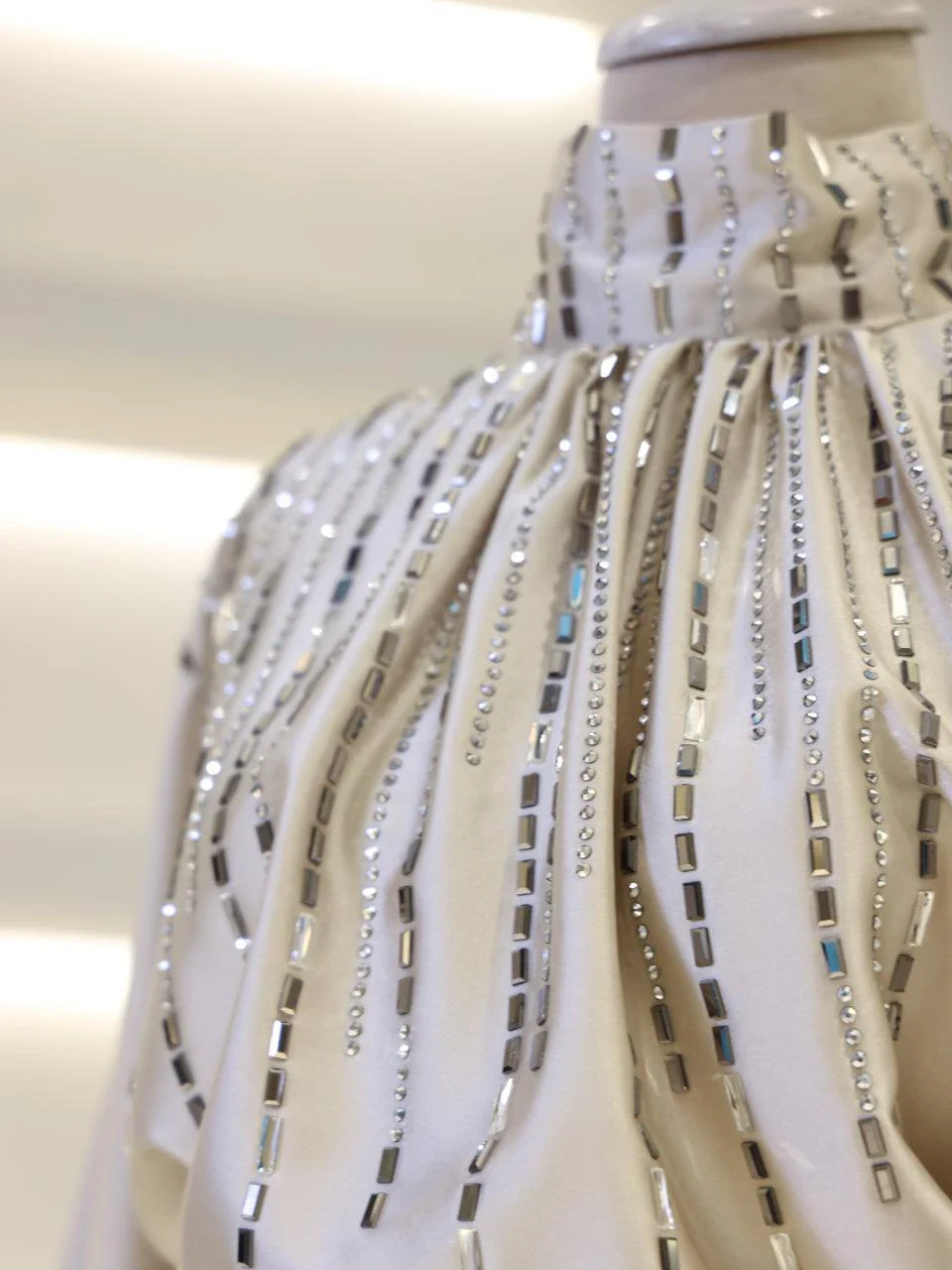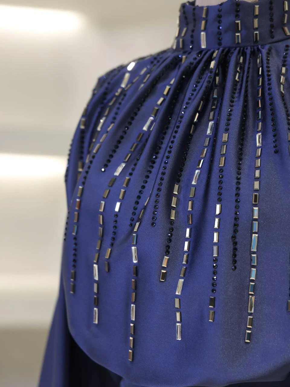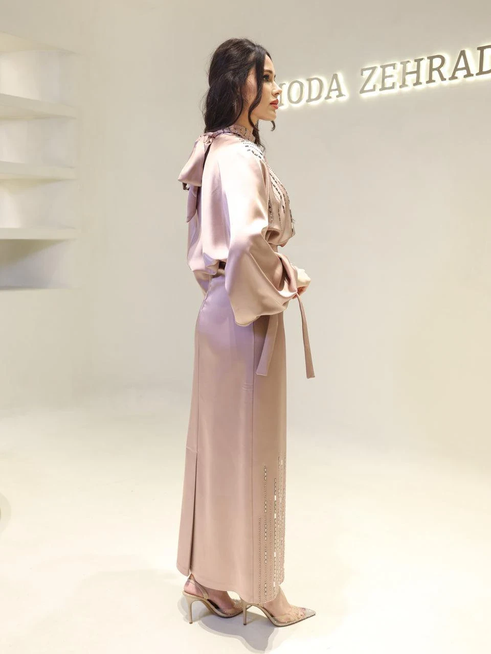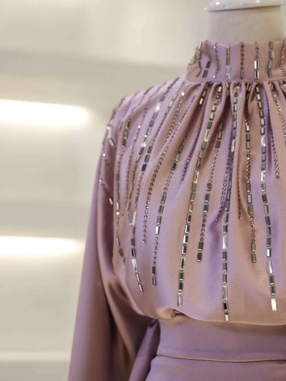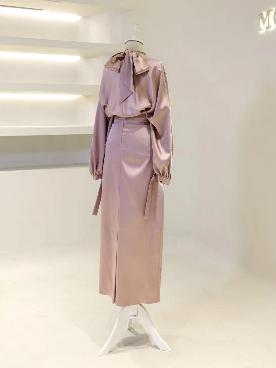 The Sintra Modest Set is designed with a precise fit, offering a sophisticated look with its satin fabric. The skirt length averages 105 cm, while the top measures approximately 65 cm. This set includes a lined interior for added comfort and features a back zipper closure. The balloon sleeves and tie cuffs add a distinct touch, and the set is accented with adhesive embellishments. The skirt has a pencil form, enhancing its elegant silhouette.