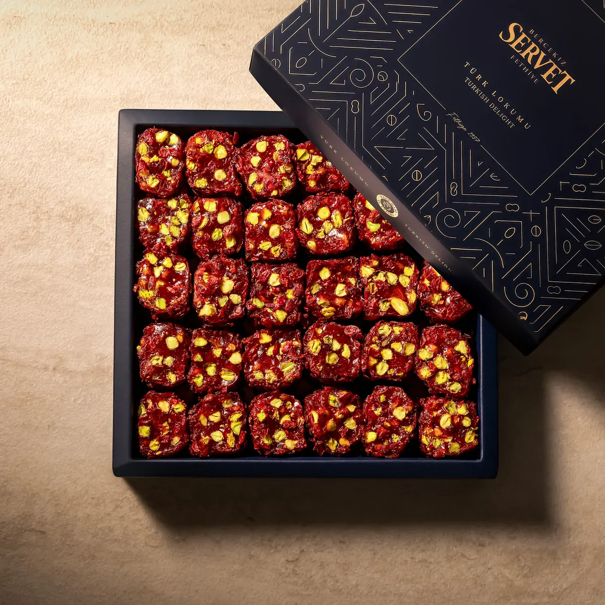 The "Şeker İlavesiz Narlı Antep Fıstıklı Zereşkli Lokum" is a 1250g fruit snack produced in Turkey. It is freshly made and packaged by Servet, who have been producing lokum for 30 years.