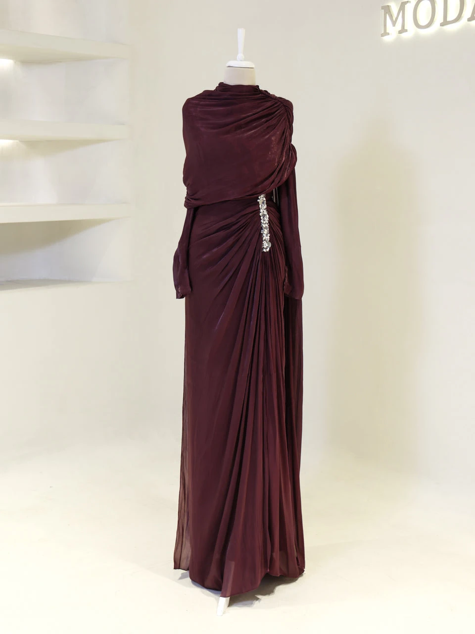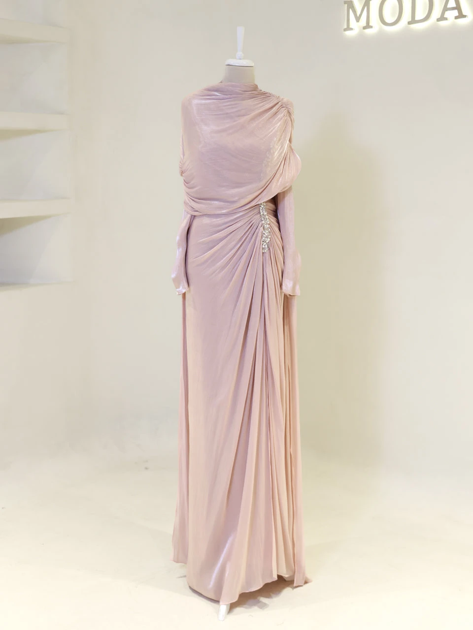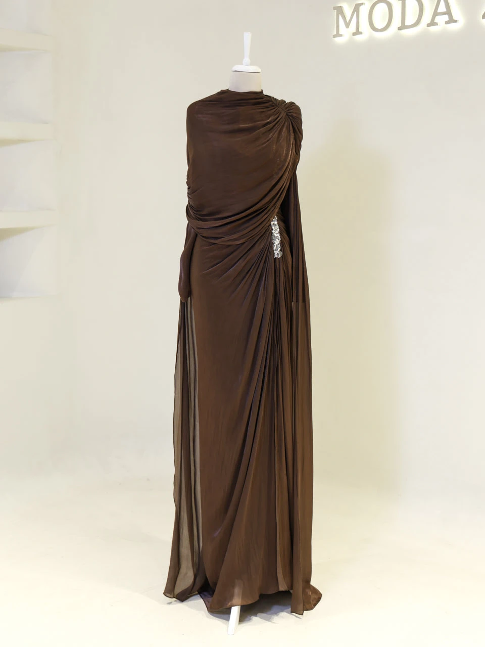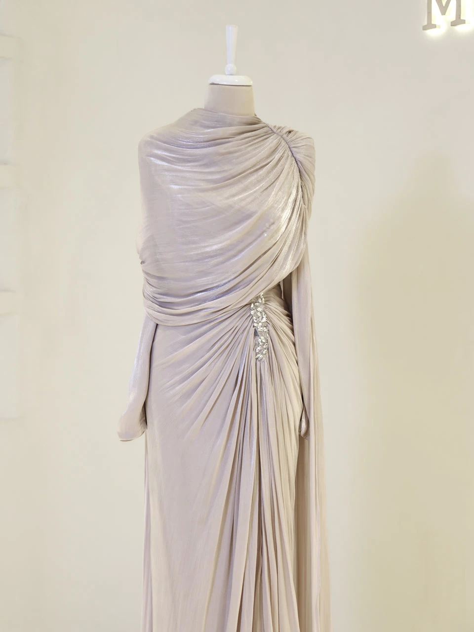 The Sureyya Modest Evening Dress is designed to offer a perfect fit with an average length of 165 cm. Made from orchid fabric, this dress includes a back zipper for easy wear. It is equipped with a chest pad and is fully lined for comfort. The detachable cape detail adds versatility to the dress, while the embellishments are securely attached. The dress features a straight skirt form, providing a classic silhouette.