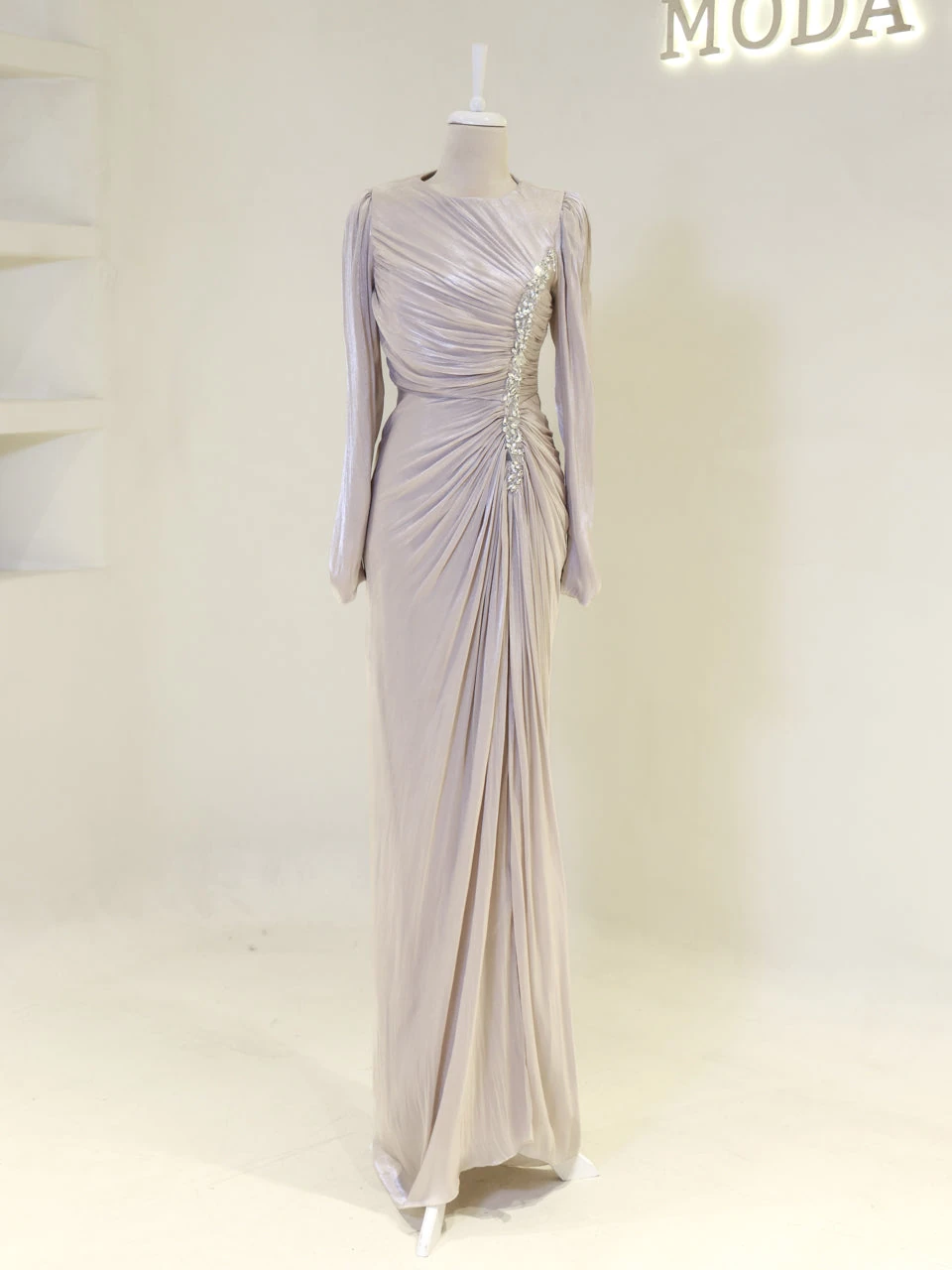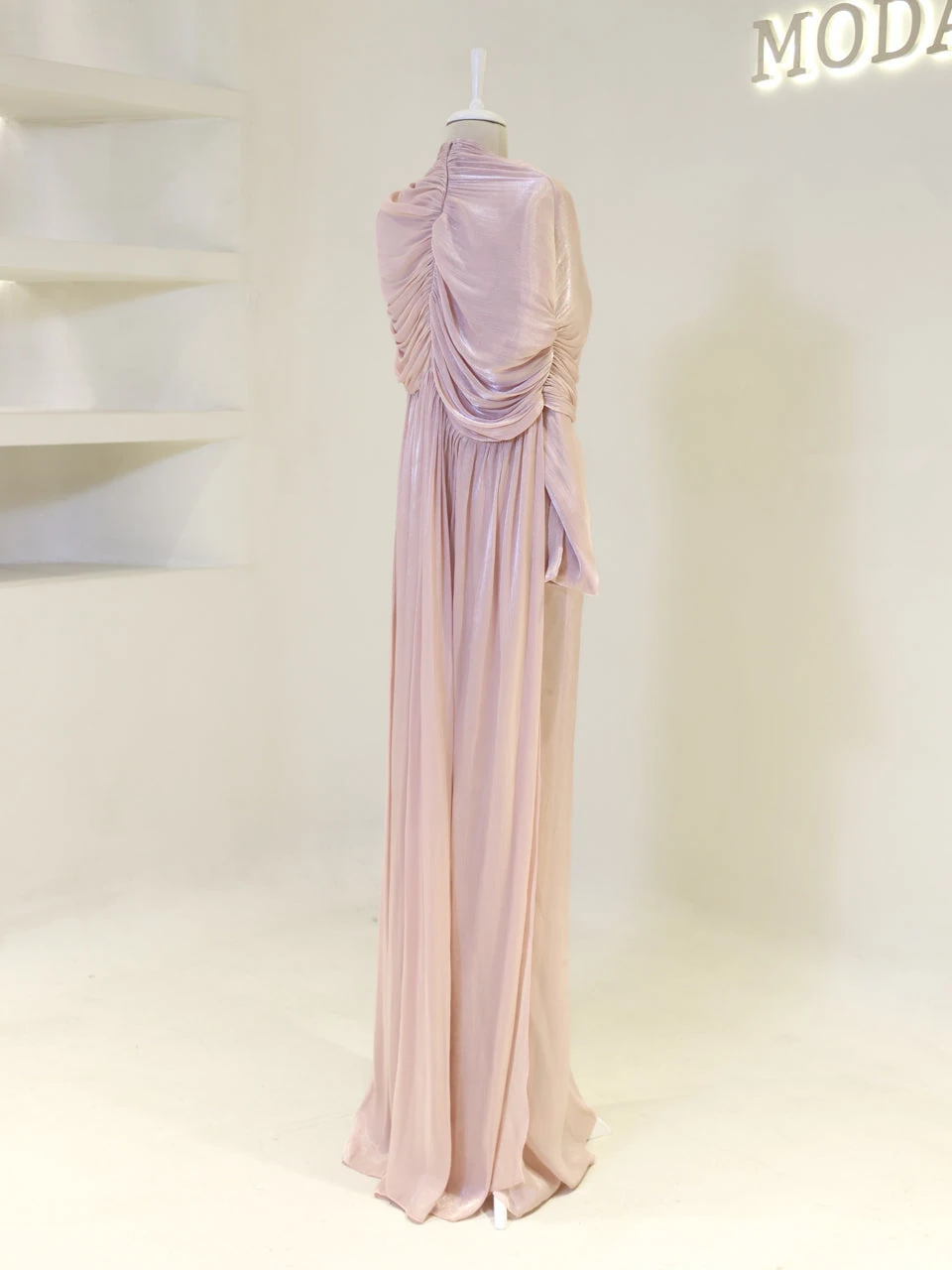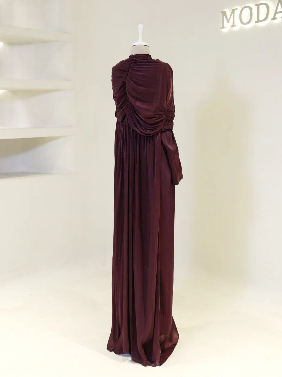 The Sureyya Modest Evening Dress is designed to offer a perfect fit with an average length of 165 cm. Made from orchid fabric, this dress includes a back zipper for easy wear. It is equipped with a chest pad and is fully lined for comfort. The detachable cape detail adds versatility to the dress, while the embellishments are securely attached. The dress features a straight skirt form, providing a classic silhouette.
