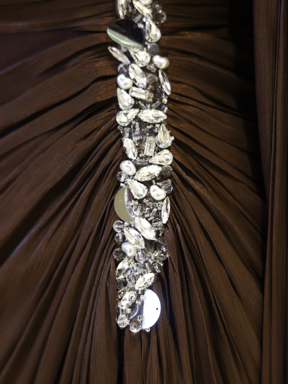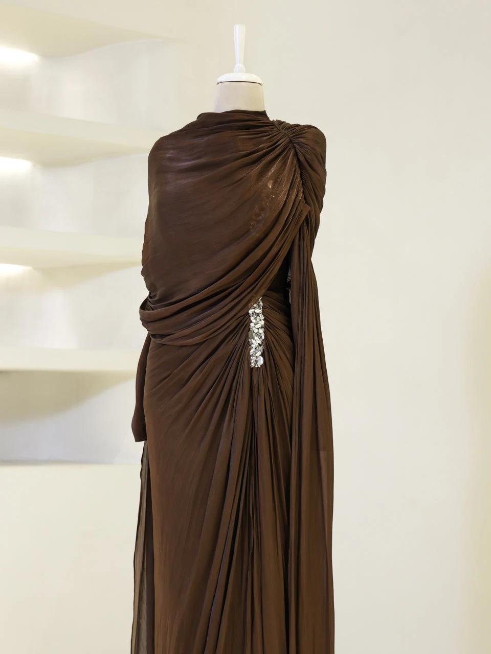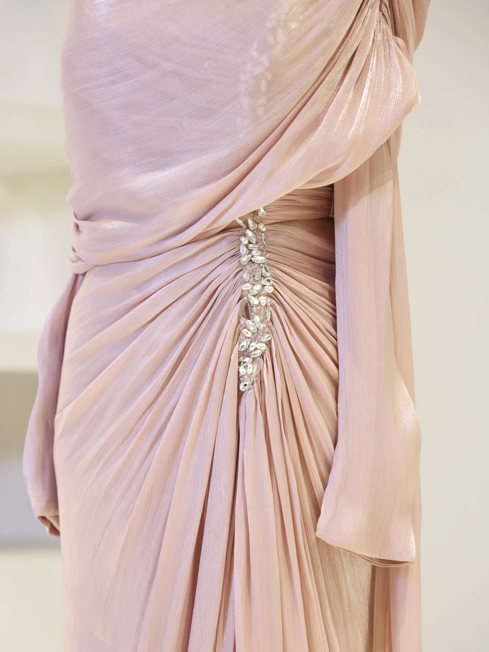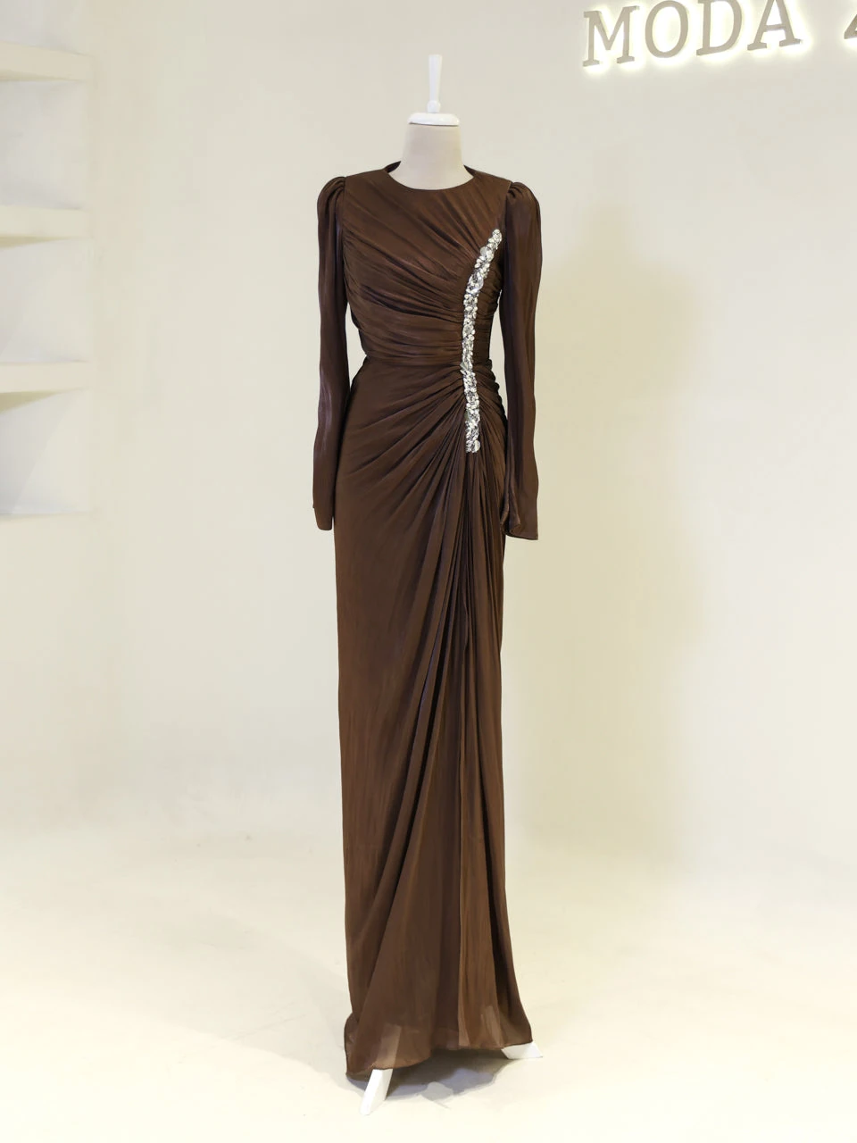 The Sureyya Modest Evening Dress is designed to offer a perfect fit with an average length of 165 cm. Made from orchid fabric, this dress includes a back zipper for easy wear. It is equipped with a chest pad and is fully lined for comfort. The detachable cape detail adds versatility to the dress, while the embellishments are securely attached. The dress features a straight skirt form, providing a classic silhouette.