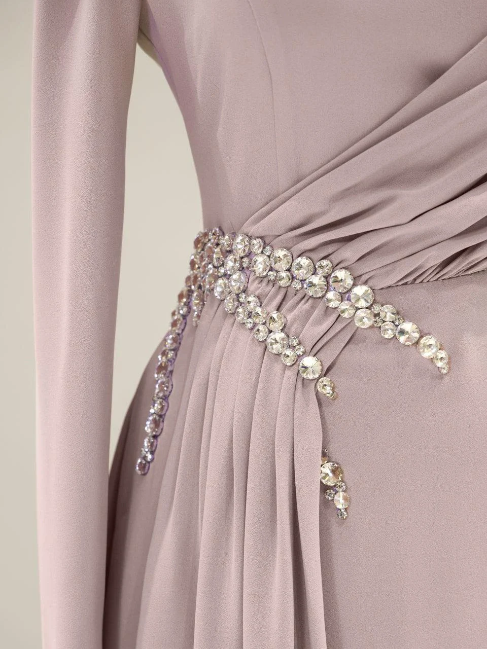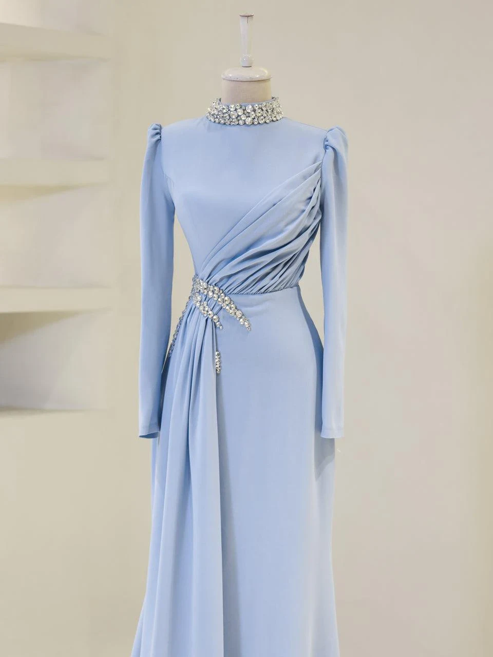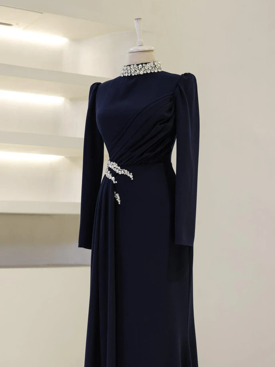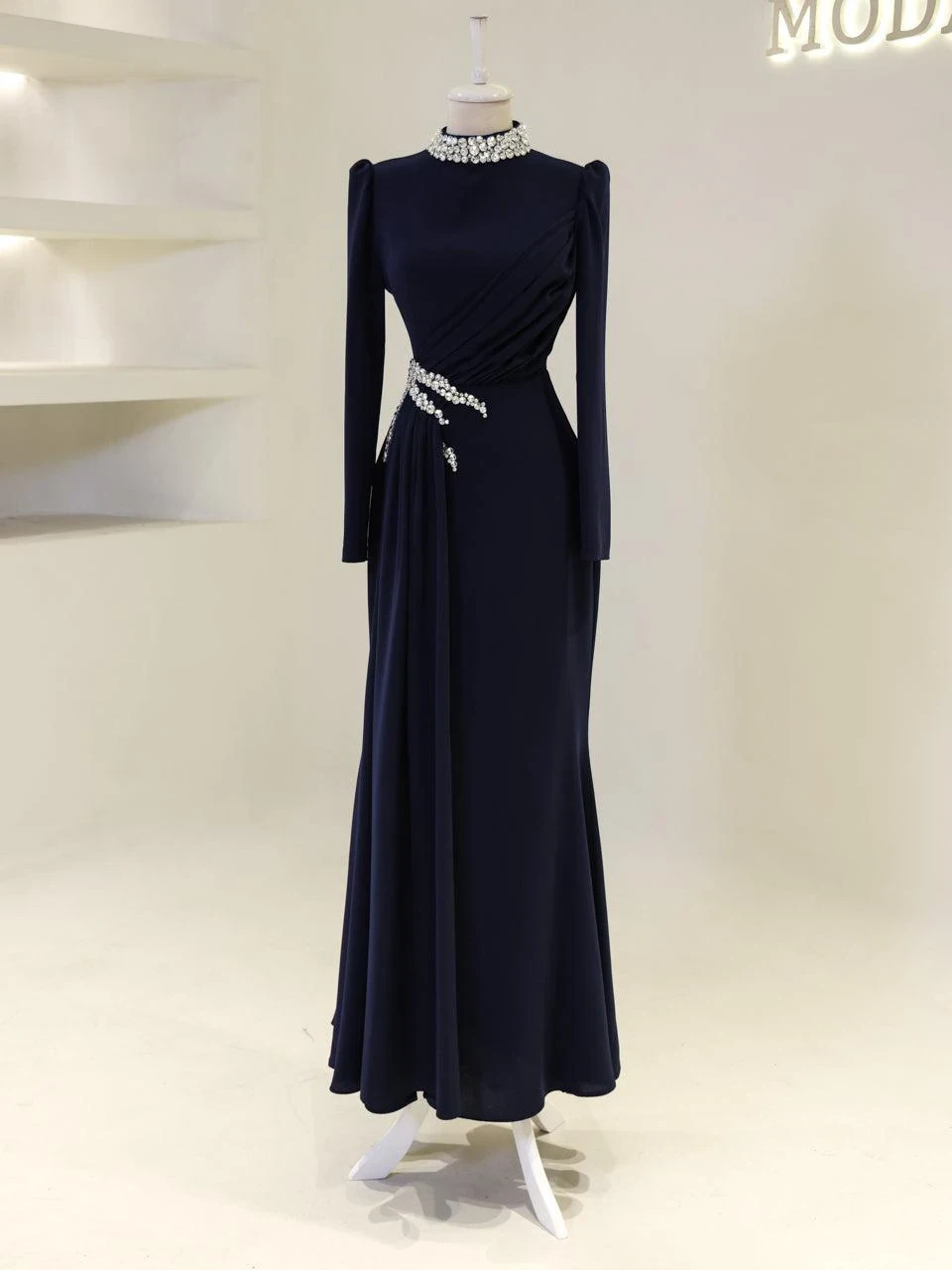 The Suzan Modest Evening Dress offers a sophisticated look with its 150 cm length and elegant crepe fabric. Designed with a full lining and a back zipper for easy wear, it includes a built-in chest pad for added comfort. The dress showcases adhesive embellishments and is styled in a flattering mermaid form.