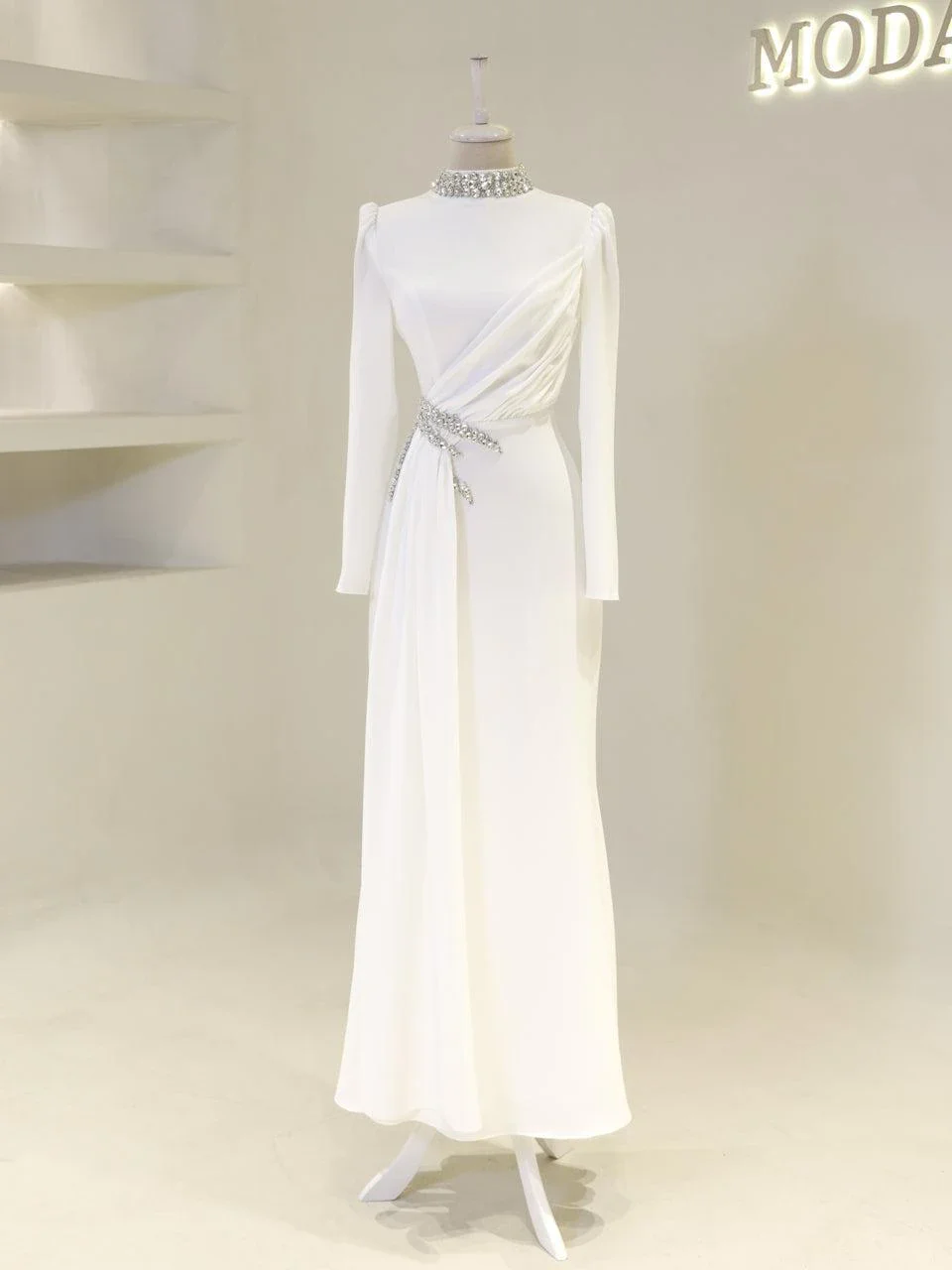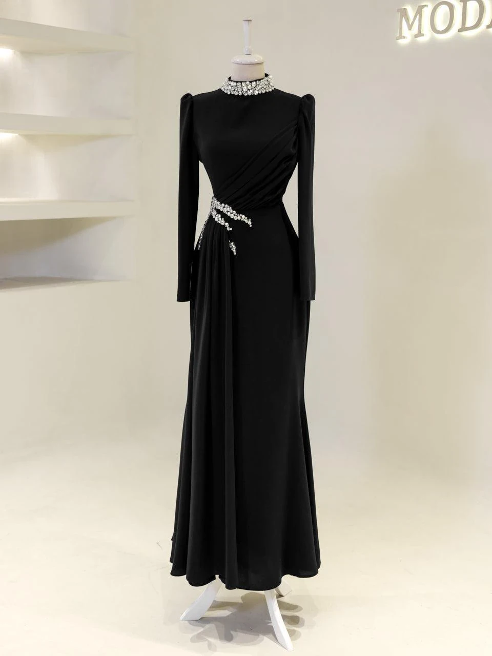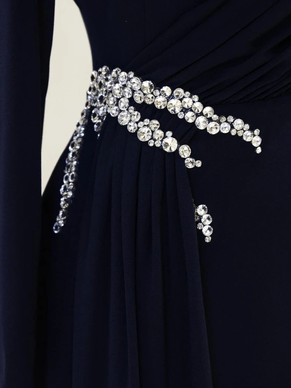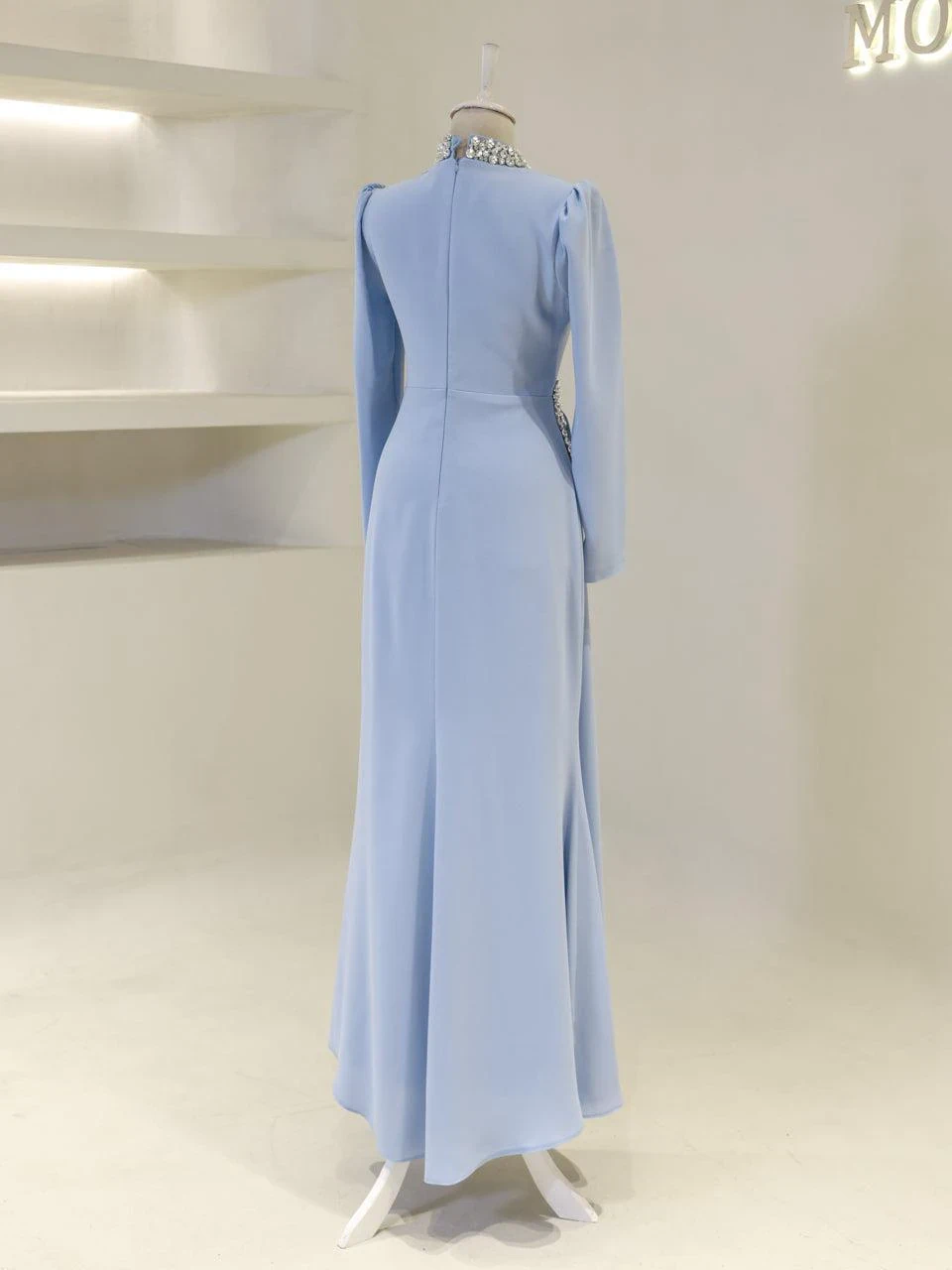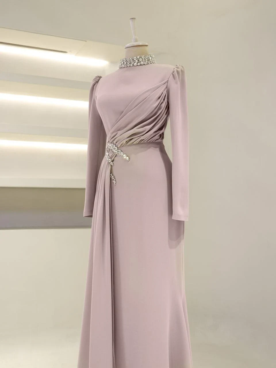 The Suzan Modest Evening Dress offers a sophisticated look with its 150 cm length and elegant crepe fabric. Designed with a full lining and a back zipper for easy wear, it includes a built-in chest pad for added comfort. The dress showcases adhesive embellishments and is styled in a flattering mermaid form.