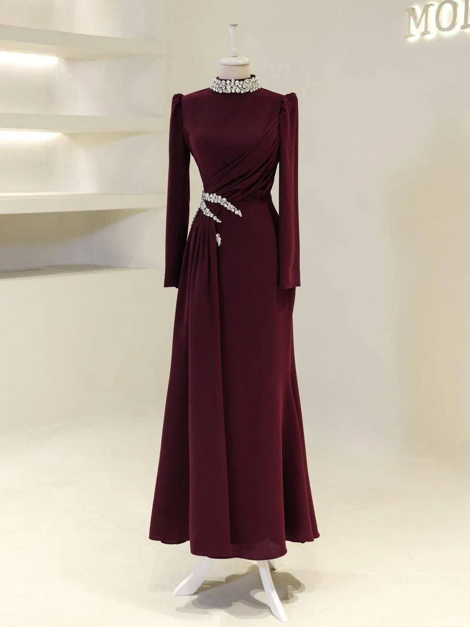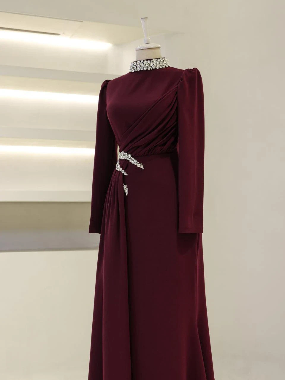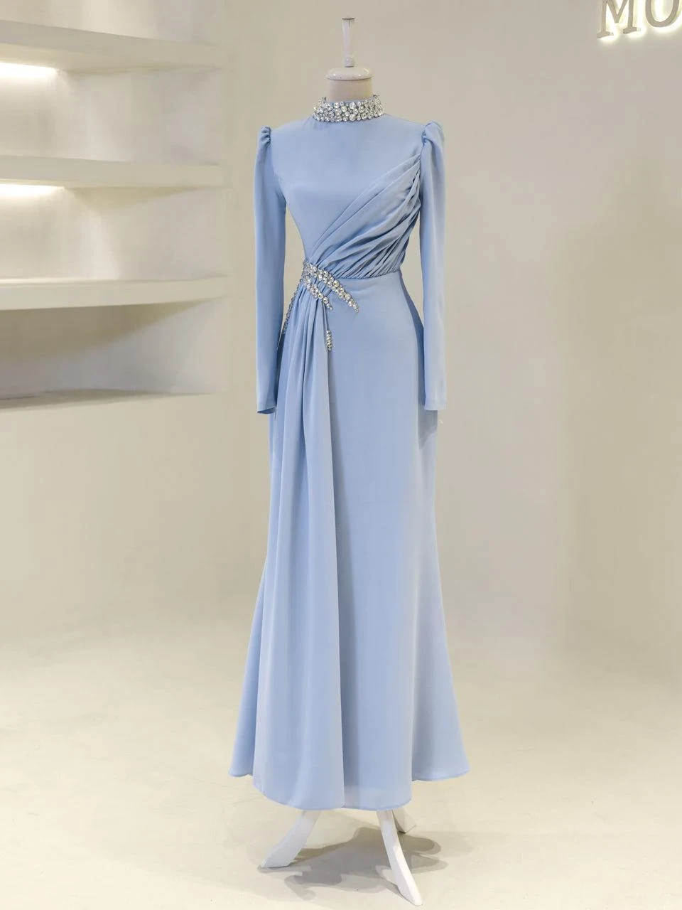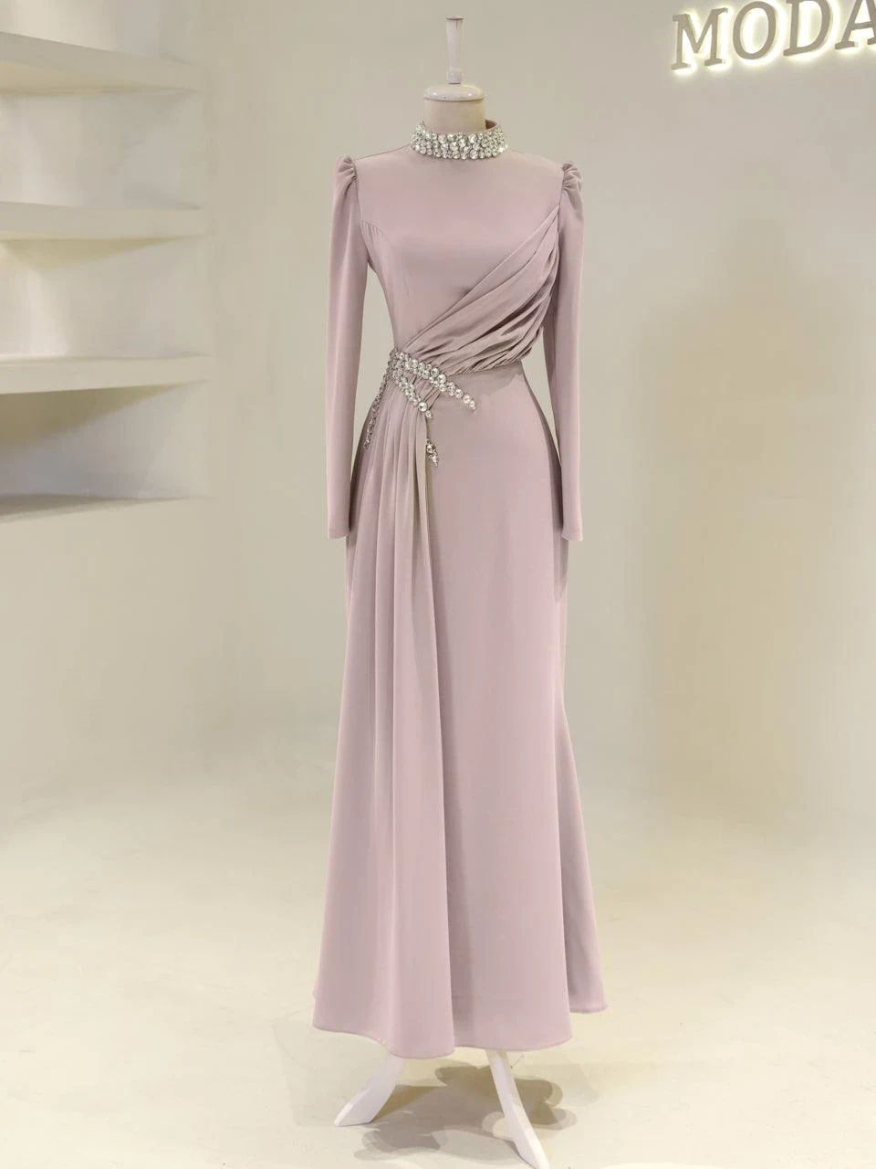 The Suzan Modest Evening Dress offers a sophisticated look with its 150 cm length and elegant crepe fabric. Designed with a full lining and a back zipper for easy wear, it includes a built-in chest pad for added comfort. The dress showcases adhesive embellishments and is styled in a flattering mermaid form.