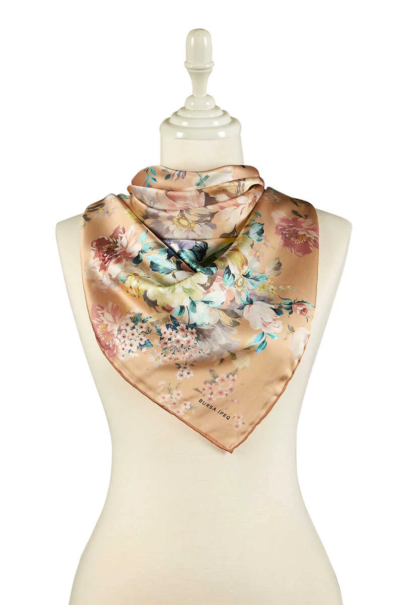 The Taba Dörtçiçek Desen İpeksi Eşarp is a silk-like scarf featuring vibrant floral patterns. Made from 100% silky rayon, it measures 90×90 cm and originates from Bursa, Turkey.