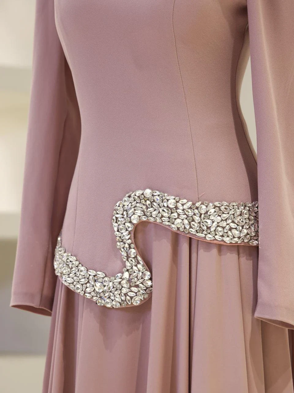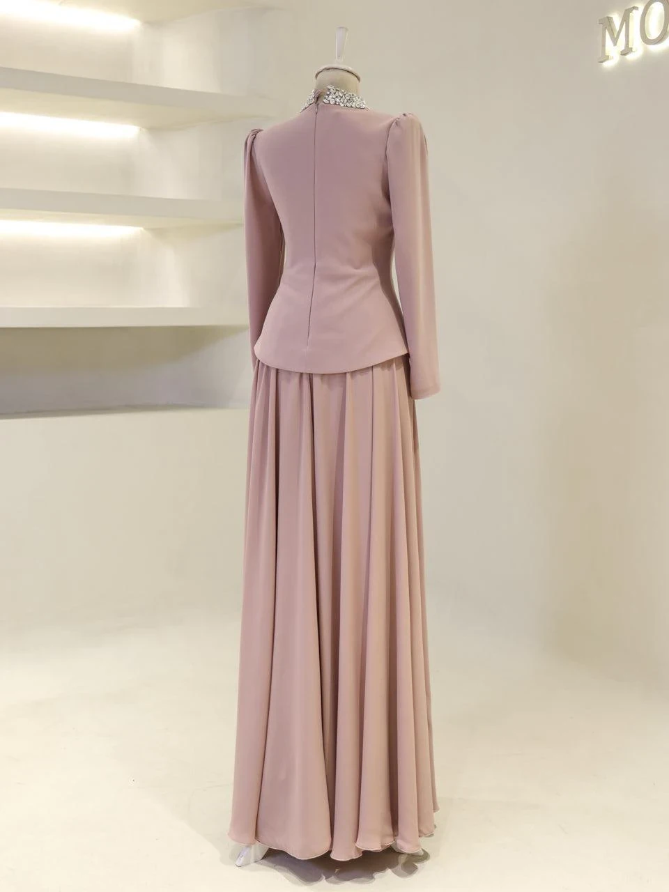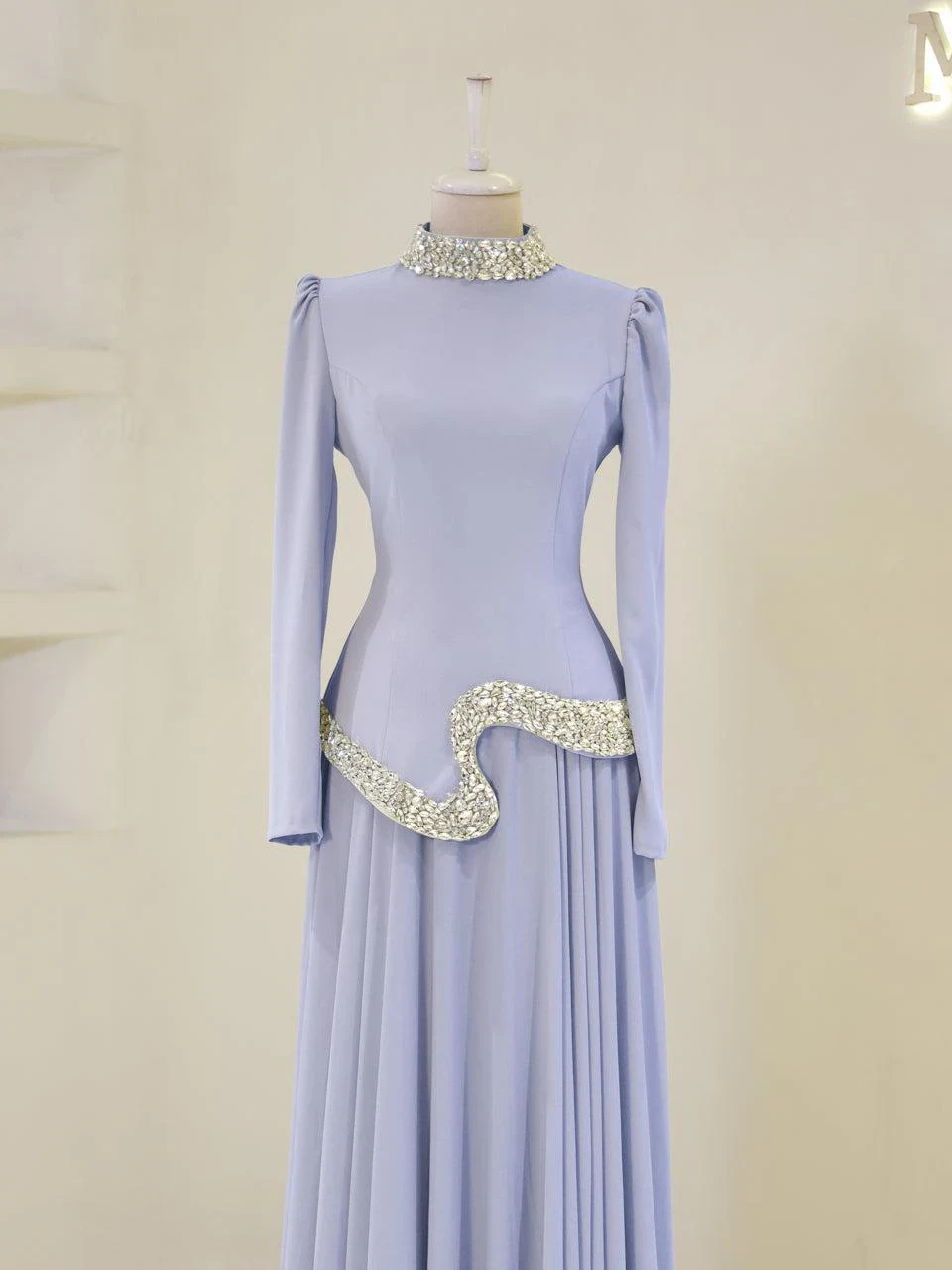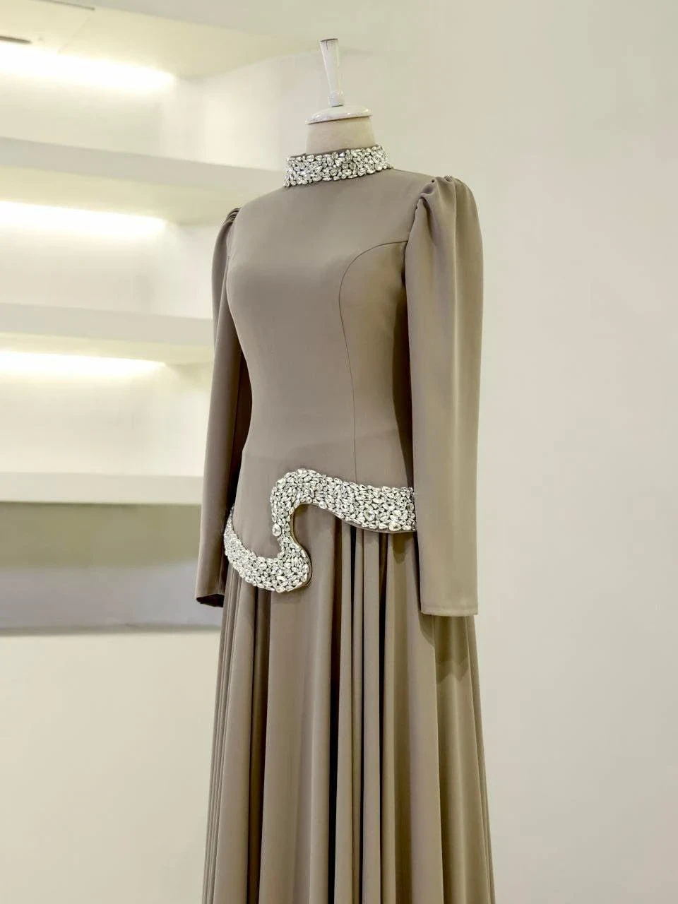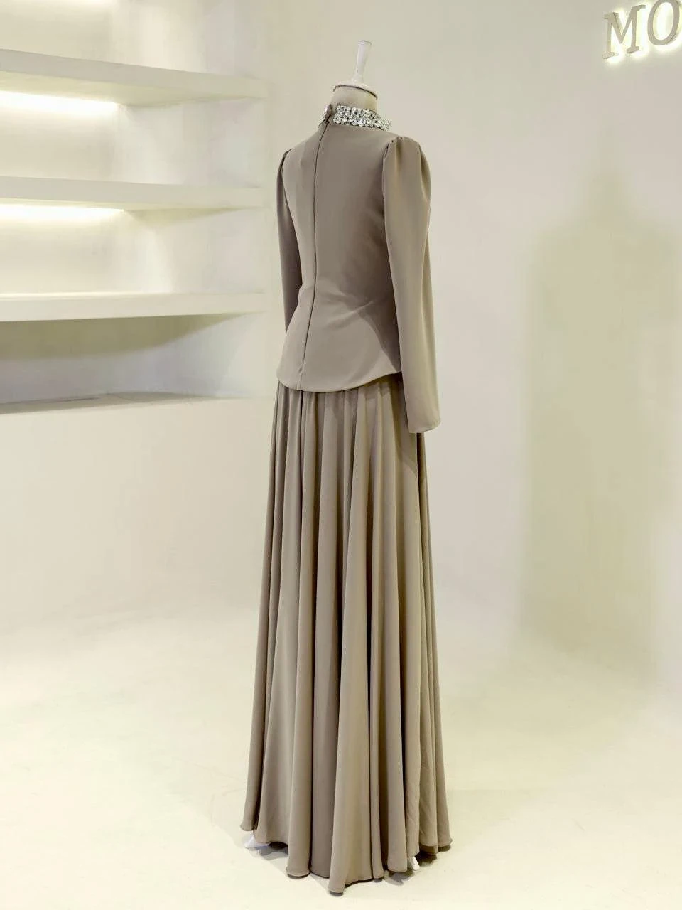 The Tarde Modest Evening Dress is designed for elegance and comfort. It features a crepe top and a chiffon skirt, providing a sophisticated look. The dress is fully lined and includes a back zipper for easy wear. It comes with a built-in bust pad for added support. The embellishments are adhered to the fabric, ensuring durability. The dress has a flared skirt design and an average length of 170 cm.