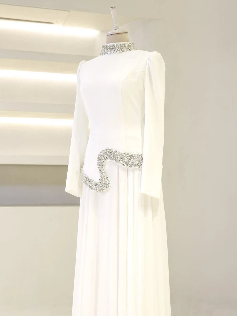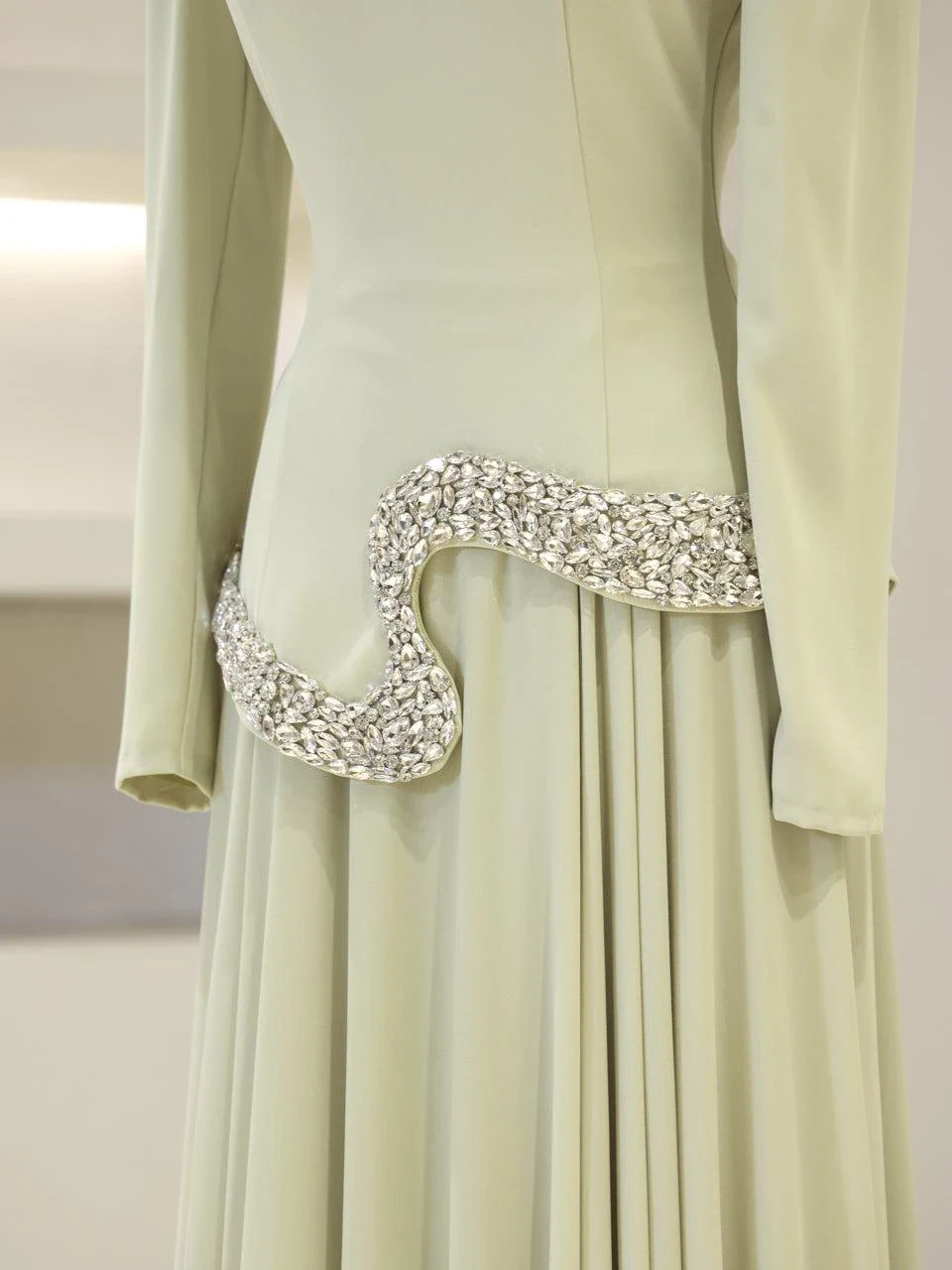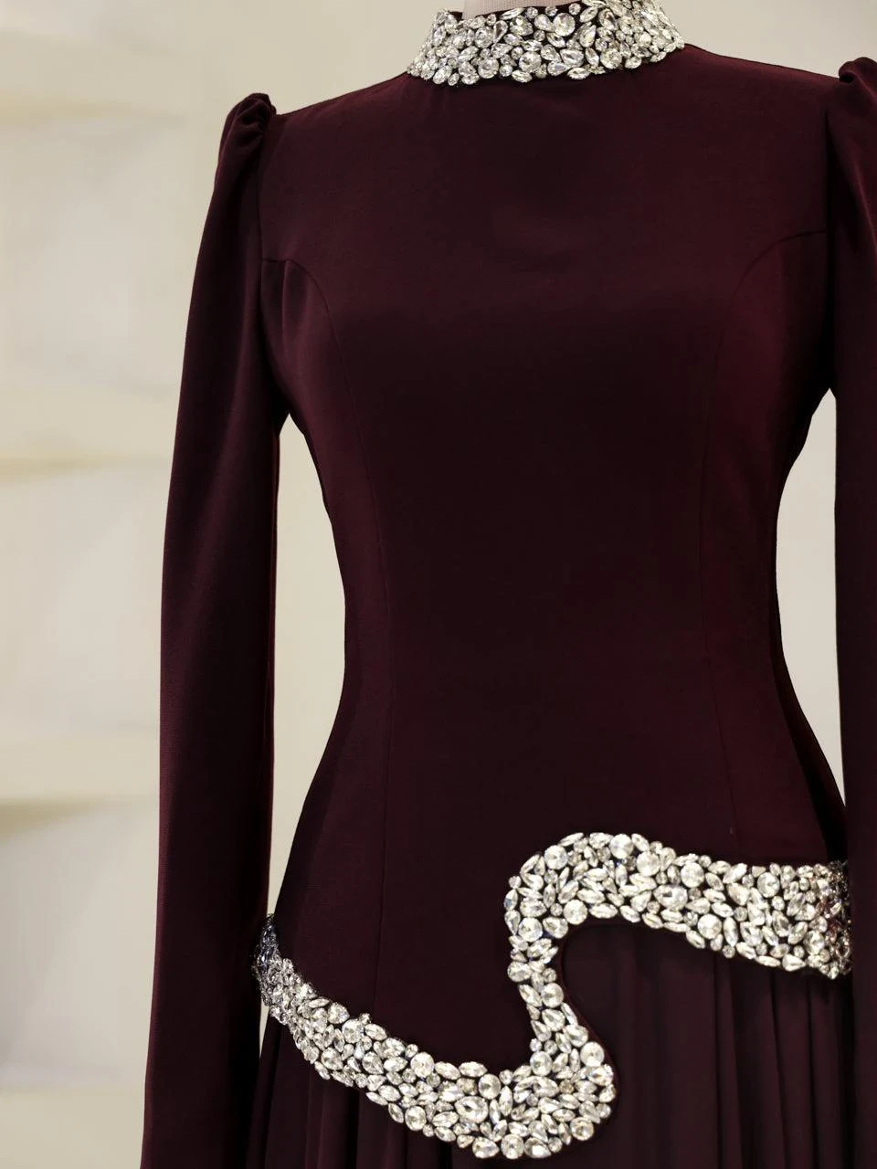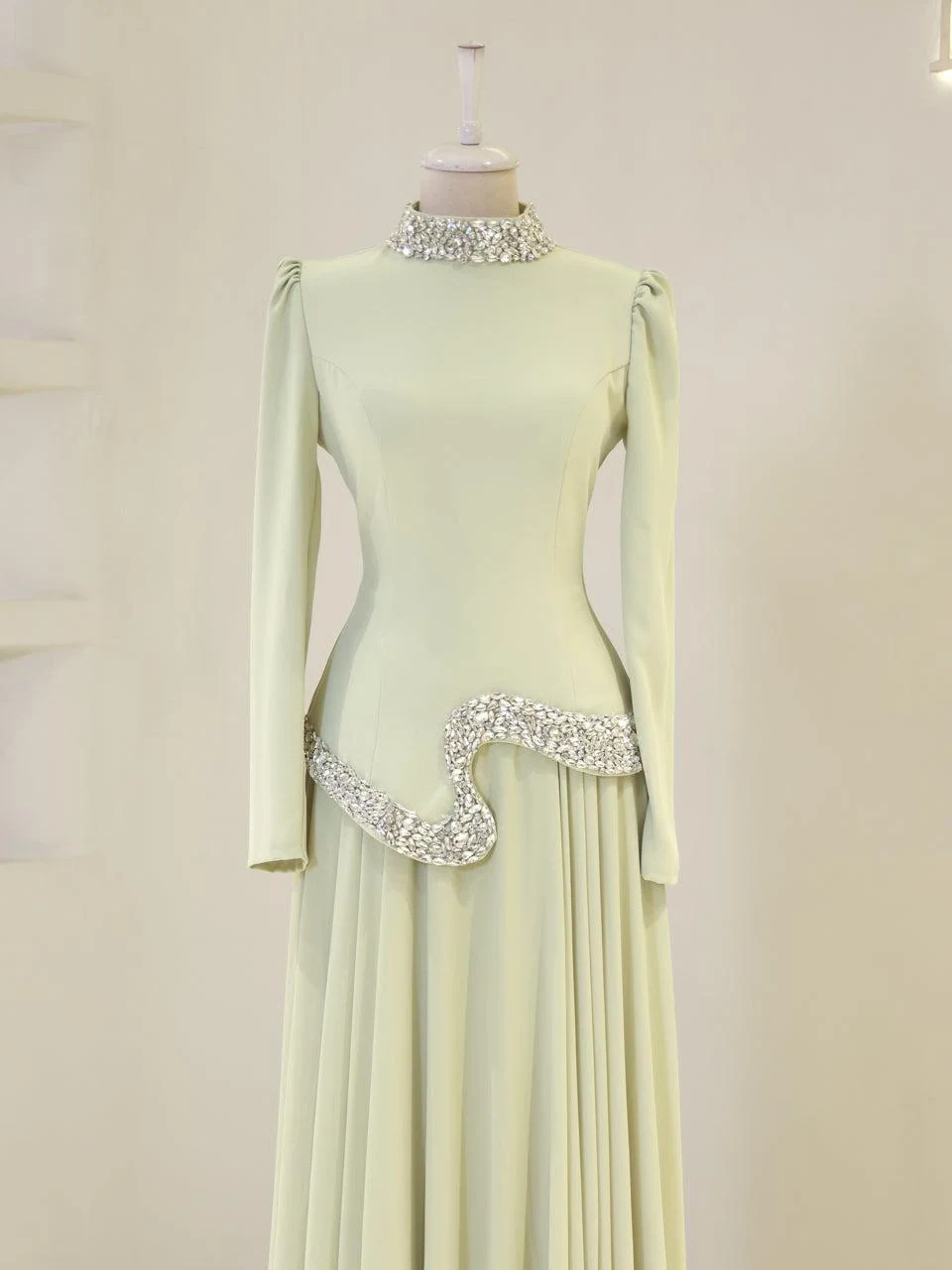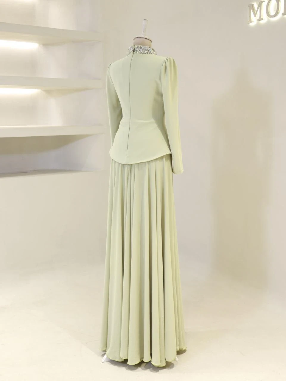 The Tarde Modest Evening Dress is designed for elegance and comfort. It features a crepe top and a chiffon skirt, providing a sophisticated look. The dress is fully lined and includes a back zipper for easy wear. It comes with a built-in bust pad for added support. The embellishments are adhered to the fabric, ensuring durability. The dress has a flared skirt design and an average length of 170 cm.