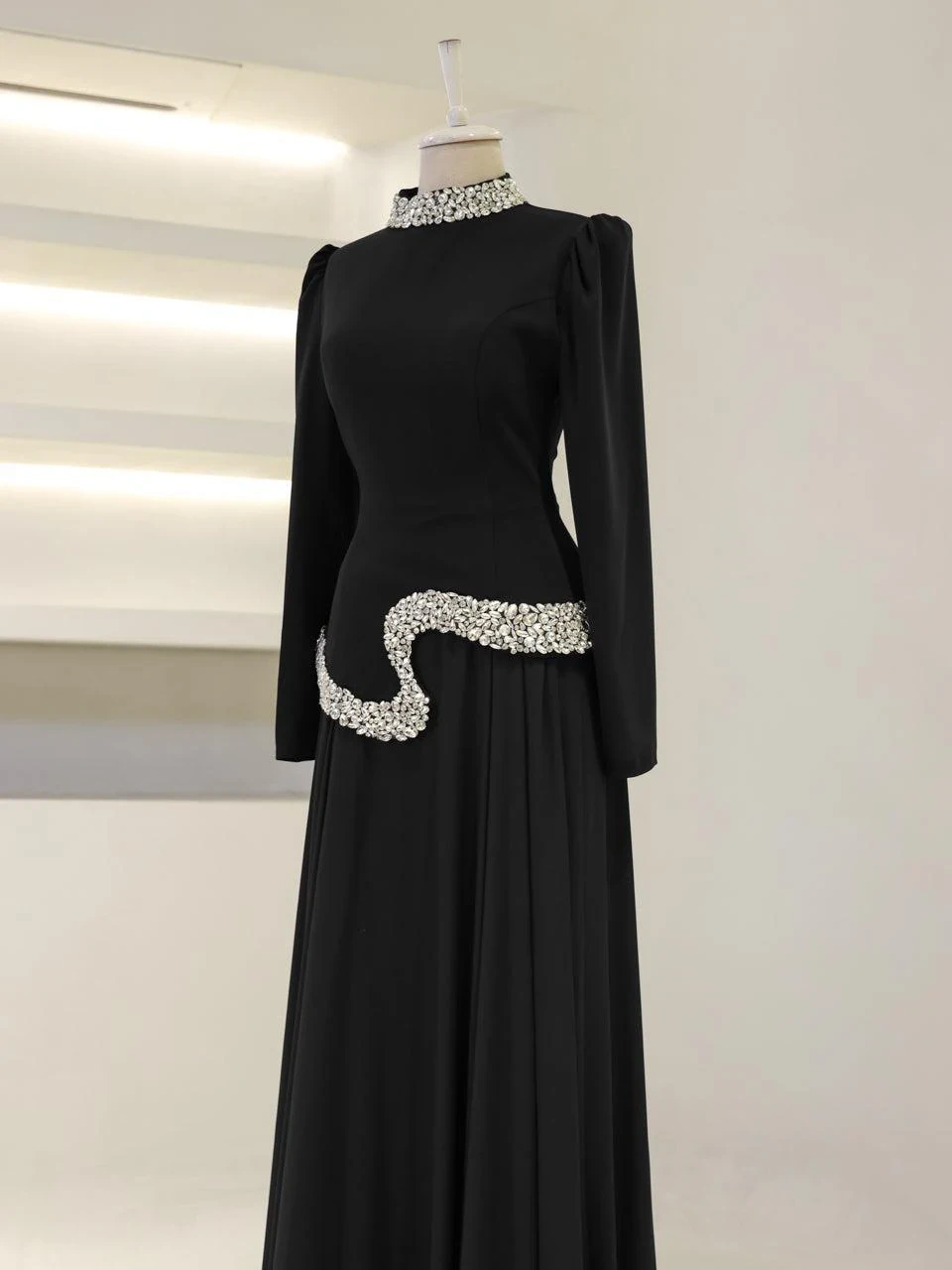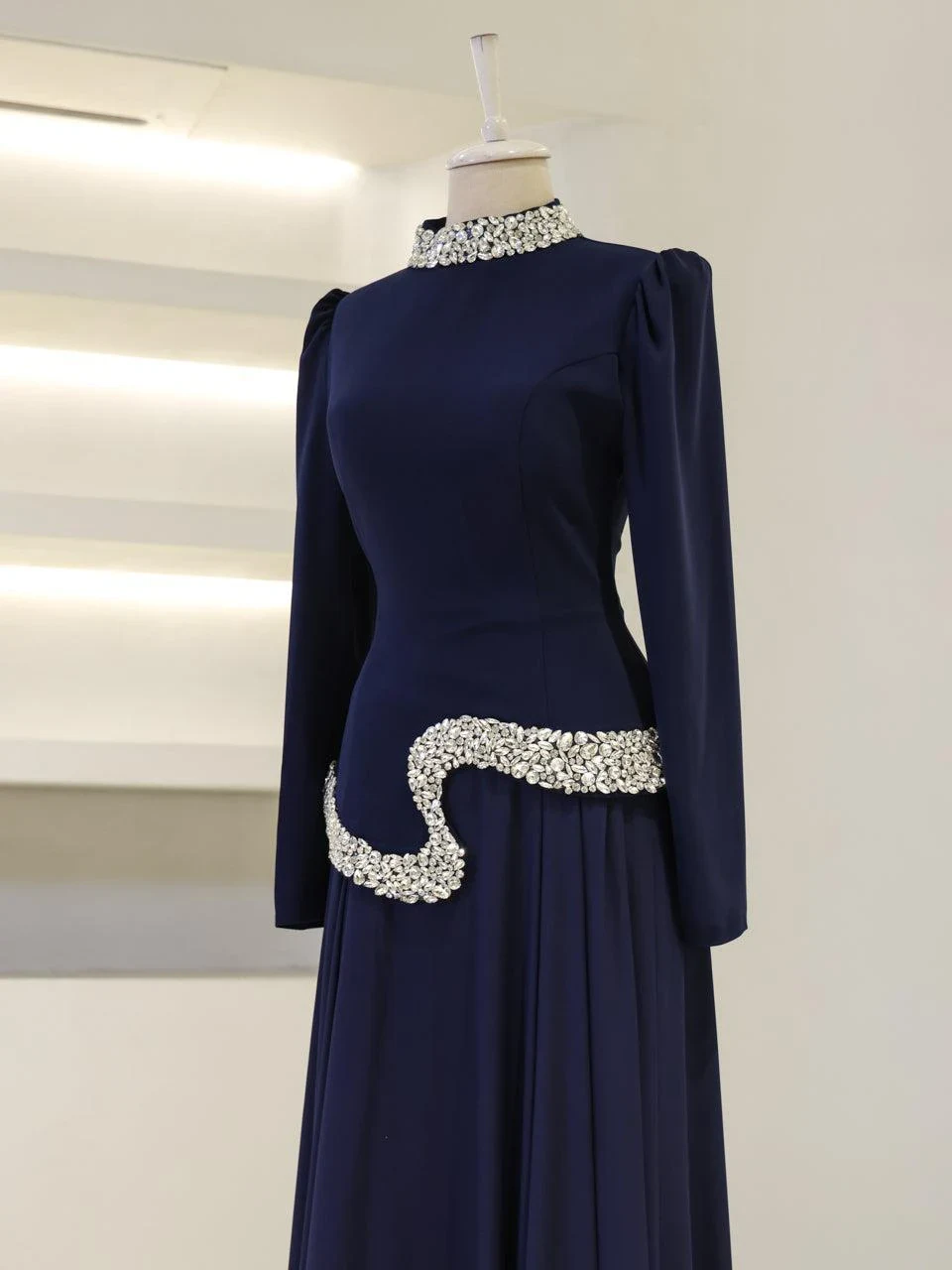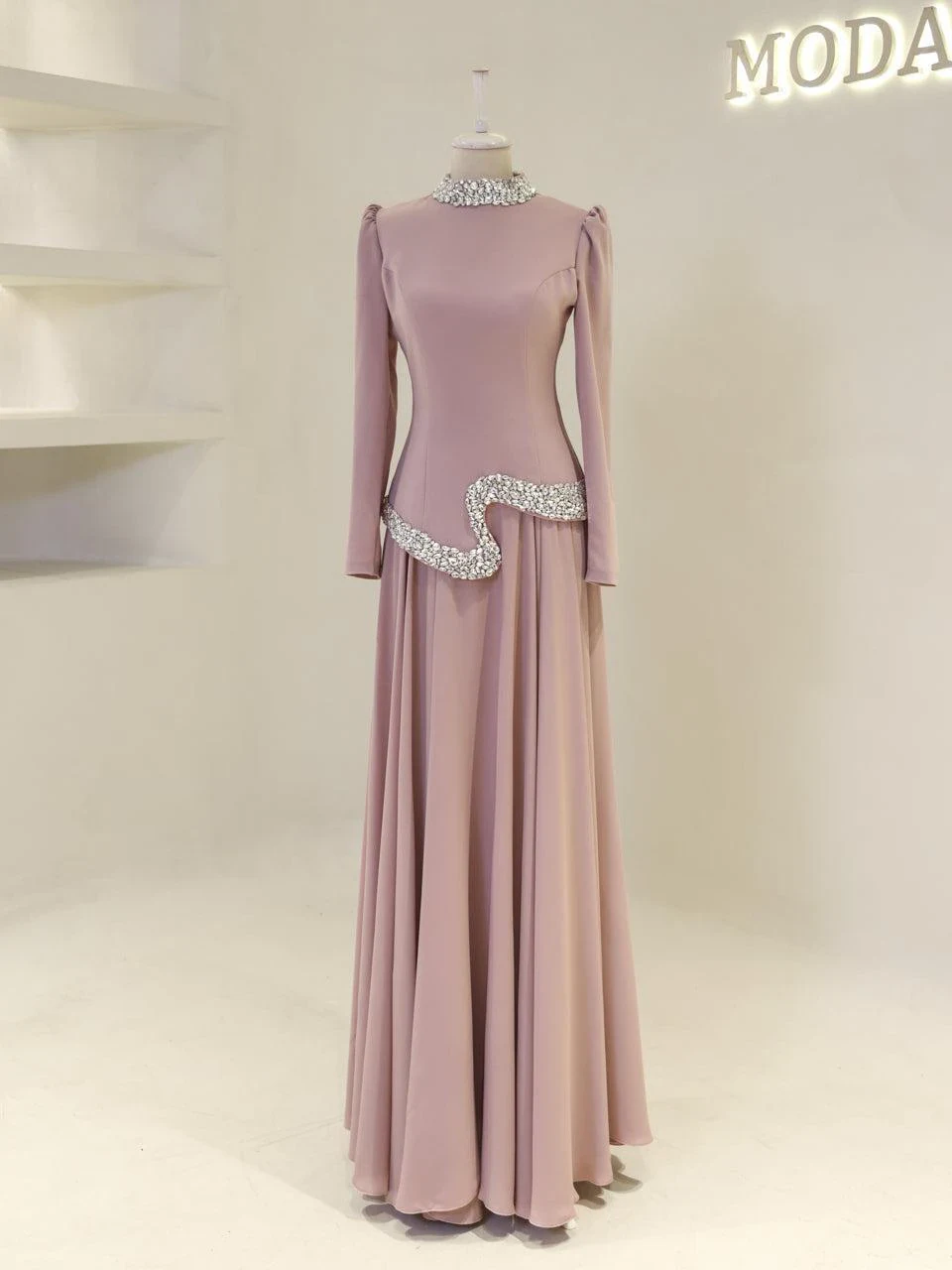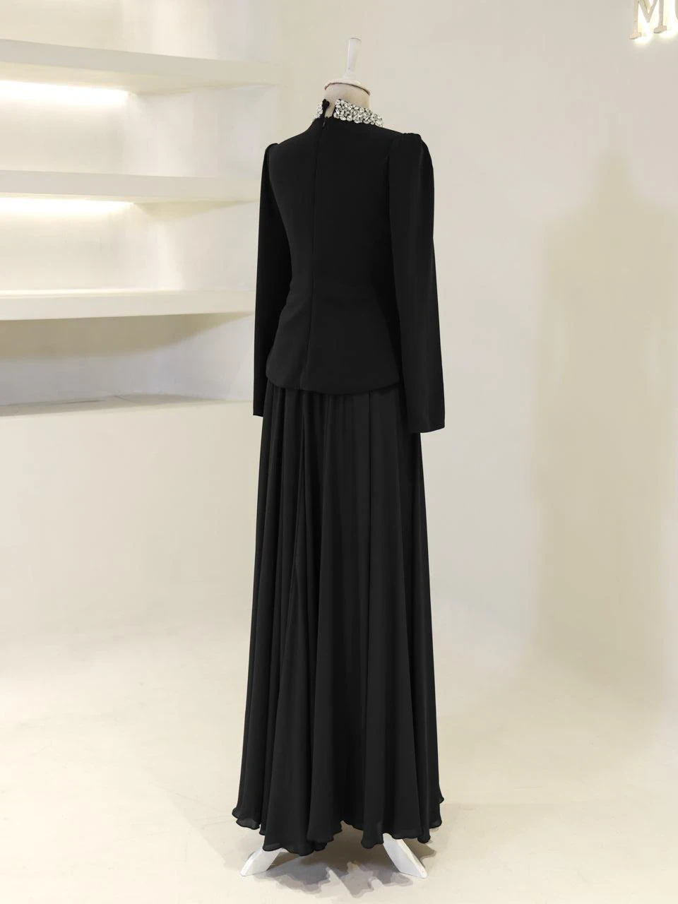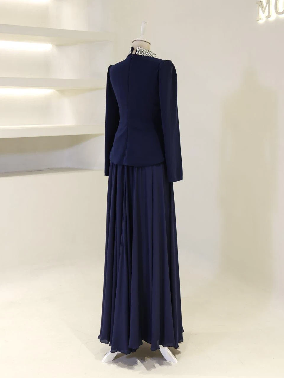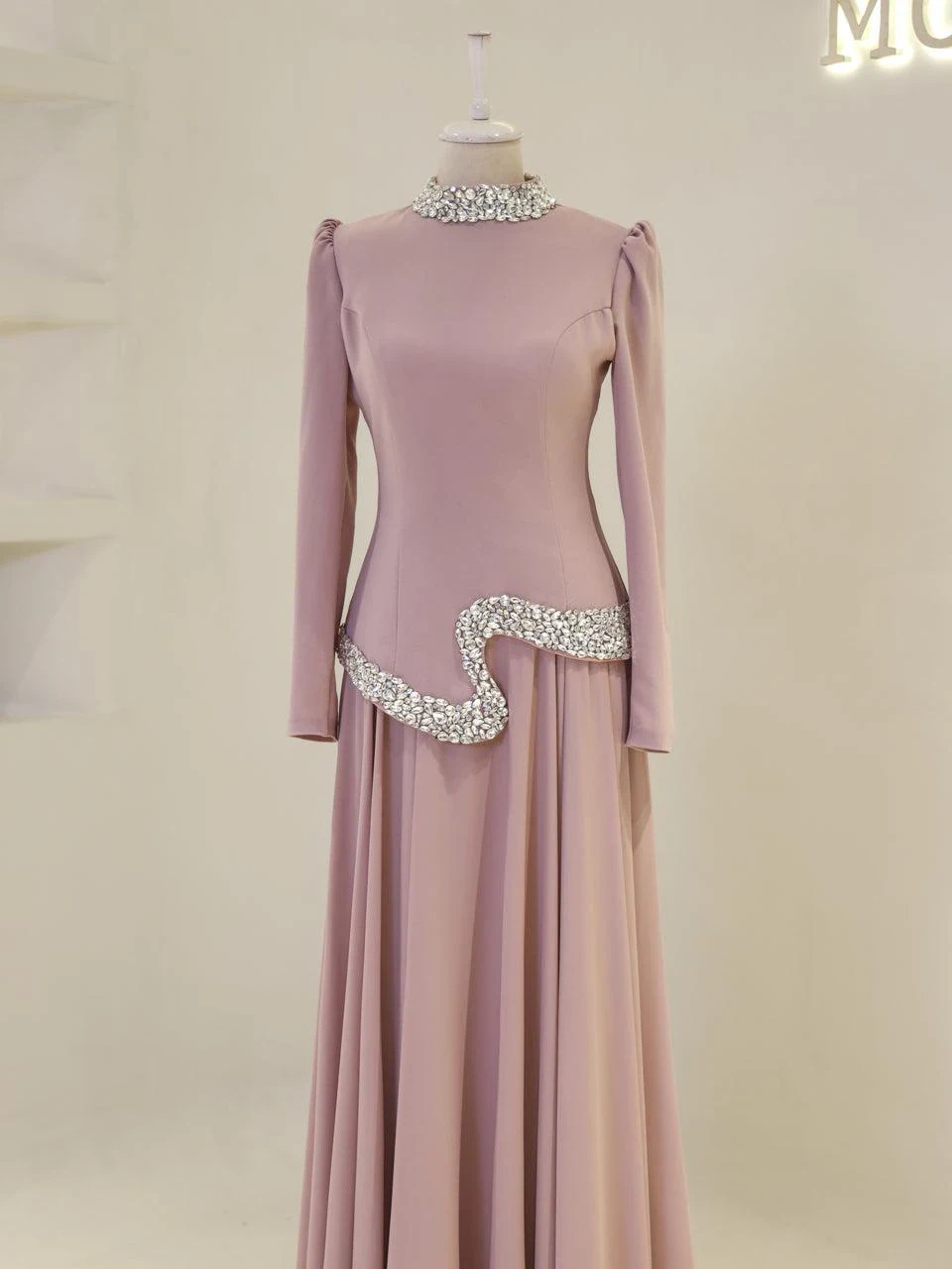 The Tarde Modest Evening Dress is designed for elegance and comfort. It features a crepe top and a chiffon skirt, providing a sophisticated look. The dress is fully lined and includes a back zipper for easy wear. It comes with a built-in bust pad for added support. The embellishments are adhered to the fabric, ensuring durability. The dress has a flared skirt design and an average length of 170 cm.
