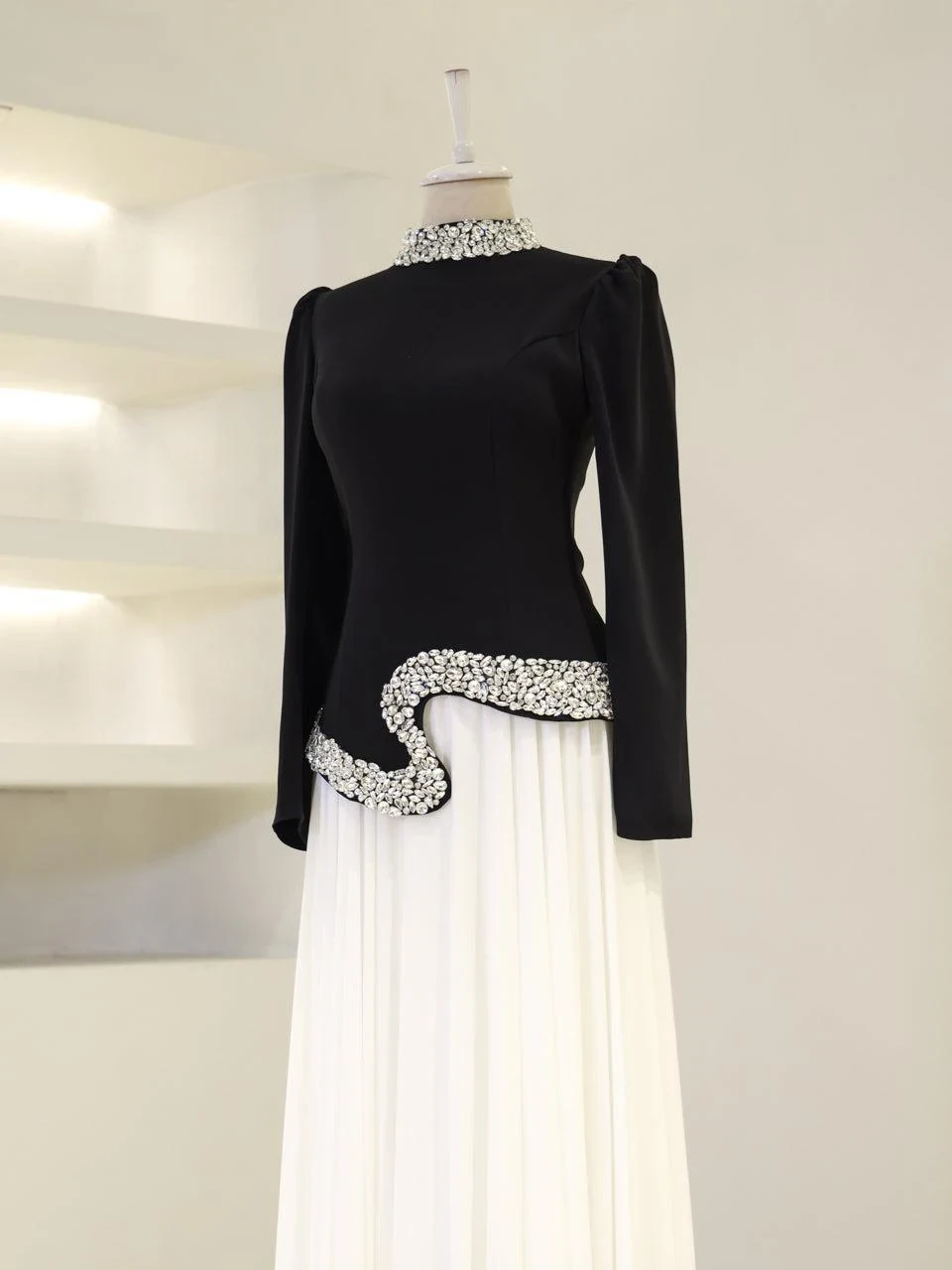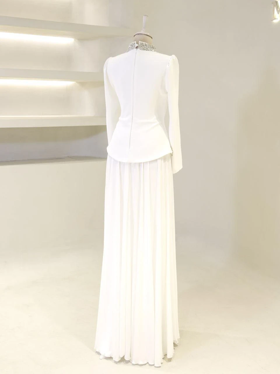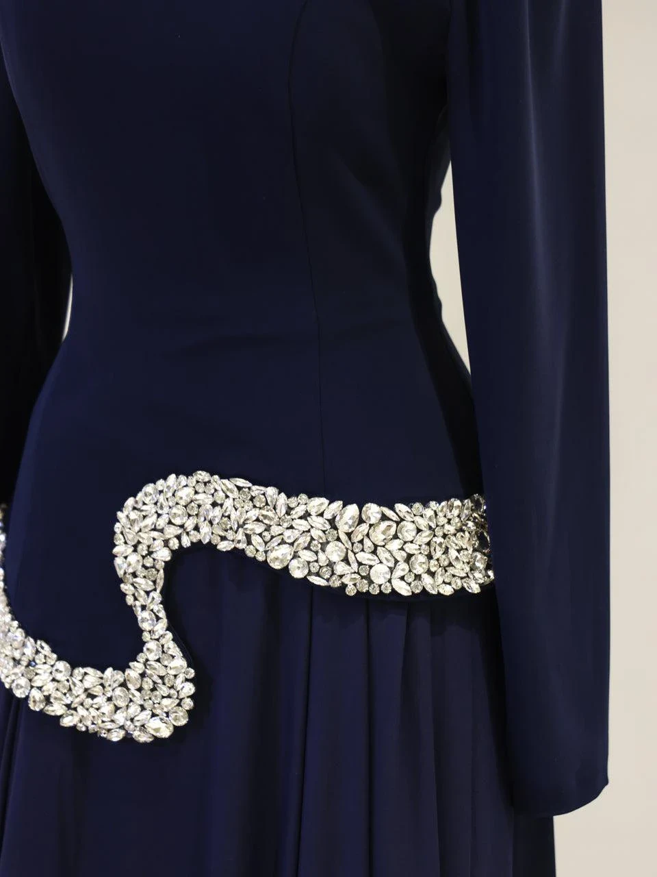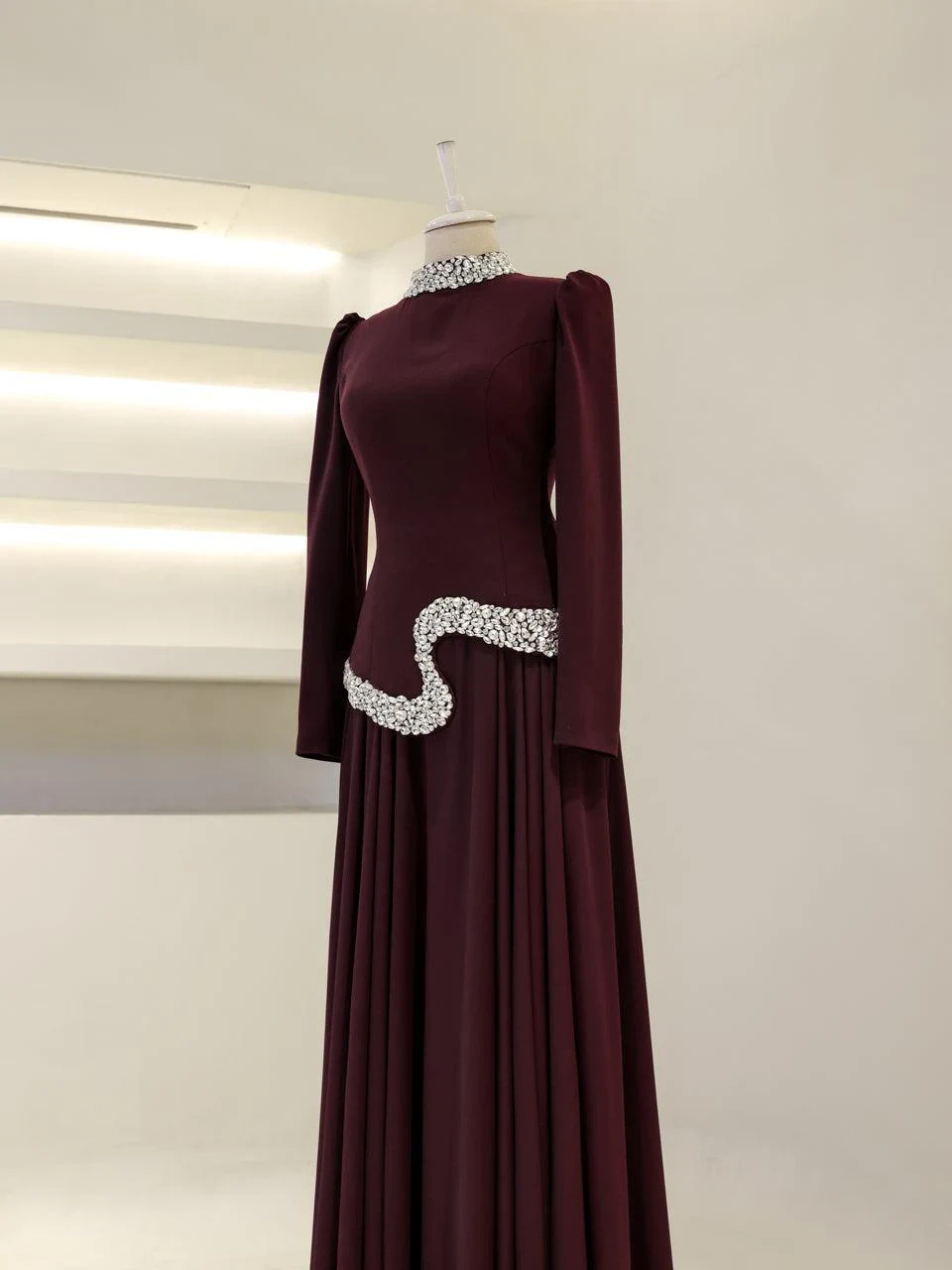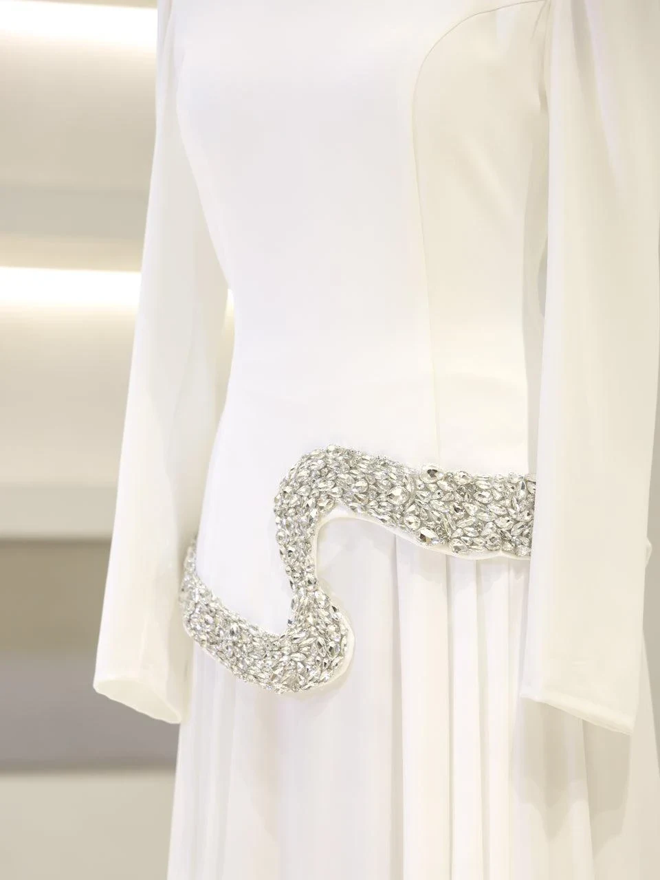 The Tarde Modest Evening Dress is designed for elegance and comfort. It features a crepe top and a chiffon skirt, providing a sophisticated look. The dress is fully lined and includes a back zipper for easy wear. It comes with a built-in bust pad for added support. The embellishments are adhered to the fabric, ensuring durability. The dress has a flared skirt design and an average length of 170 cm.