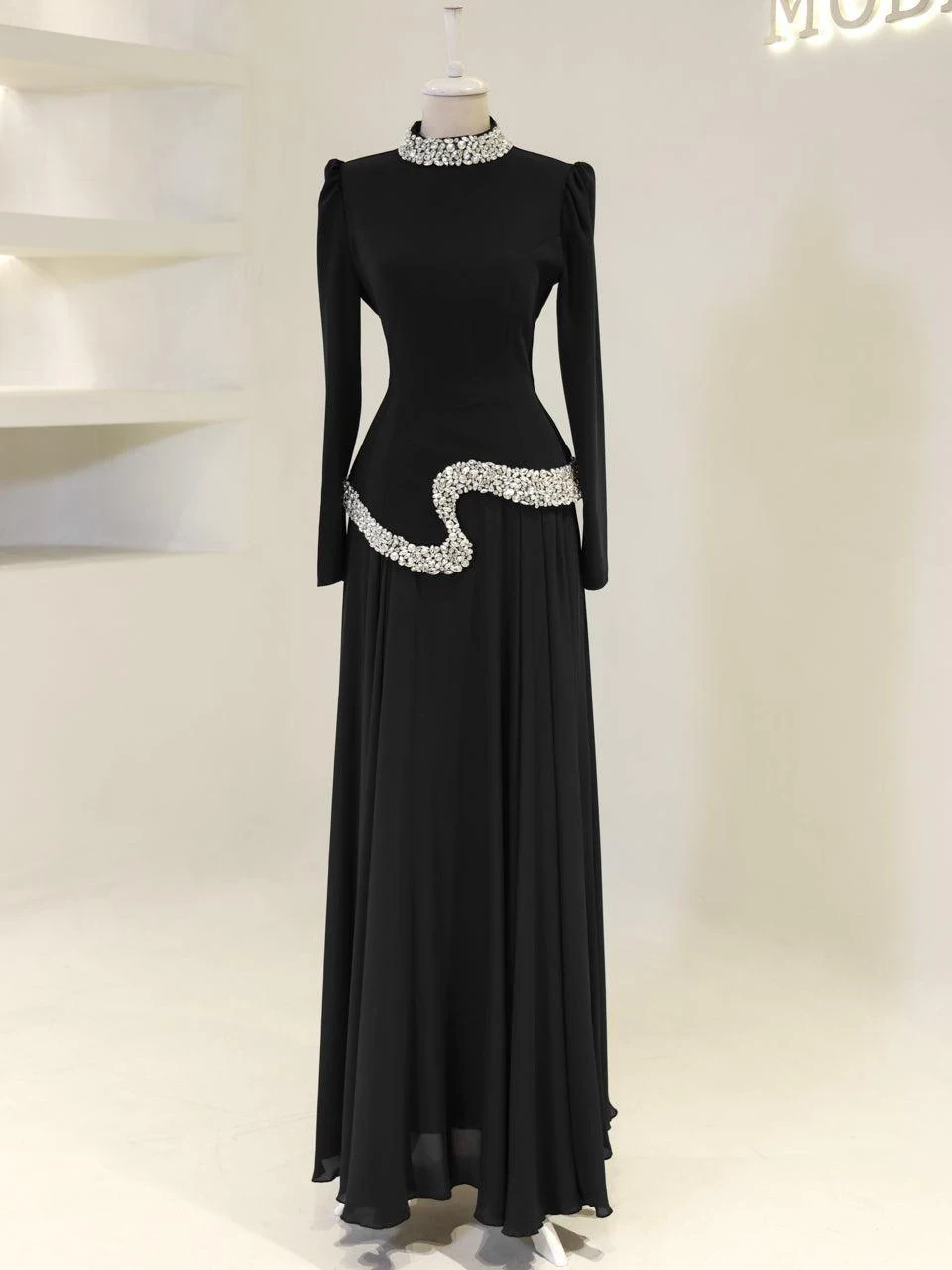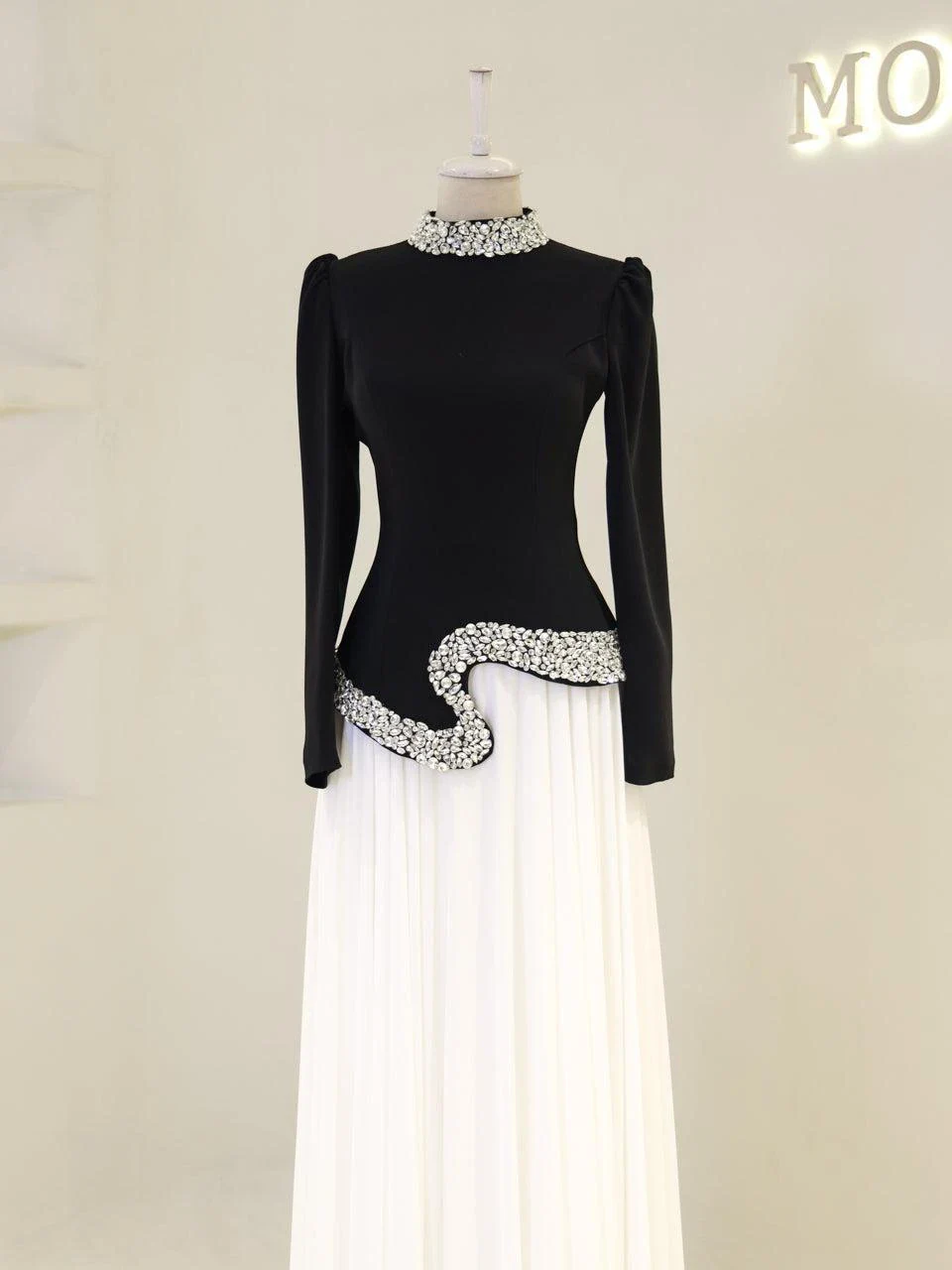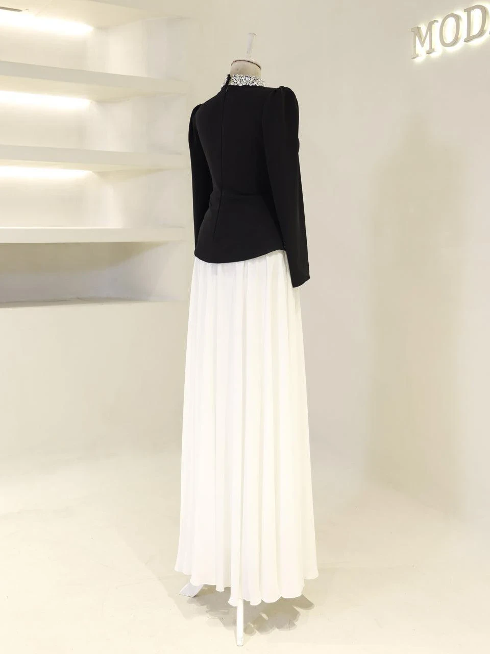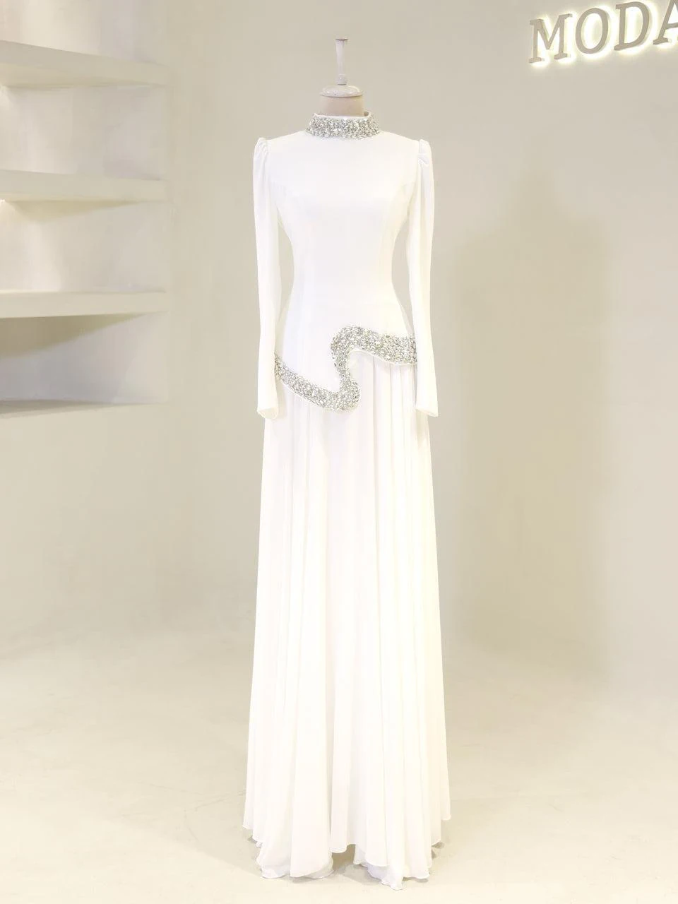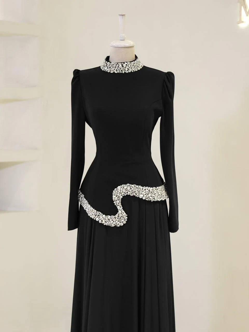The Tarde Modest Evening Dress is designed for elegance and comfort. It features a crepe top and a chiffon skirt, providing a sophisticated look. The dress is fully lined and includes a back zipper for easy wear. It comes with a built-in bust pad for added support. The embellishments are adhered to the fabric, ensuring durability. The dress has a flared skirt design and an average length of 170 cm.
