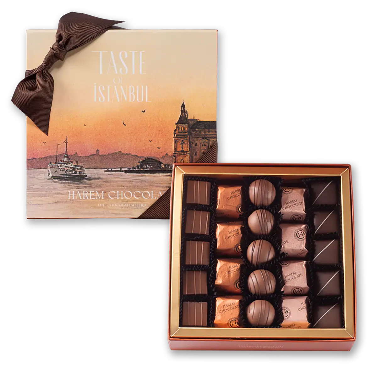The Taste of Istanbul Premium Selection Box is a special creation by Harem Chocolate to celebrate its 25th anniversary. Designed by Ayşe Türemiş, this box offers a journey through the enchanting atmosphere of Istanbul with every bite. The collection includes five unique flavors: Crunch Praline, Cara Almond, Hazelnut Truffle, Cara Cherry, and Bitter Chocolate Covered Salted Caramel. Each piece is crafted to bring the mystique of Istanbul to your palate.