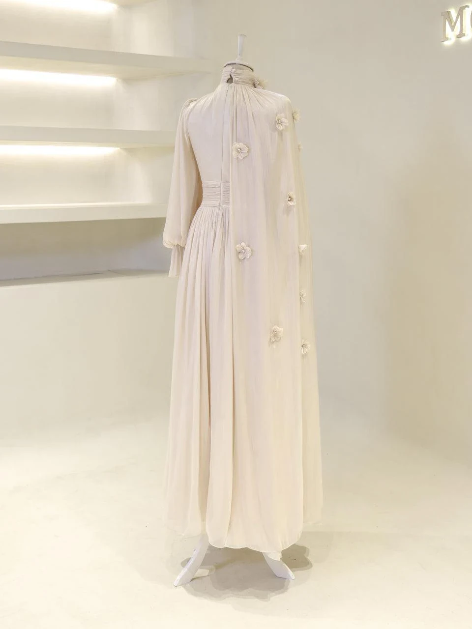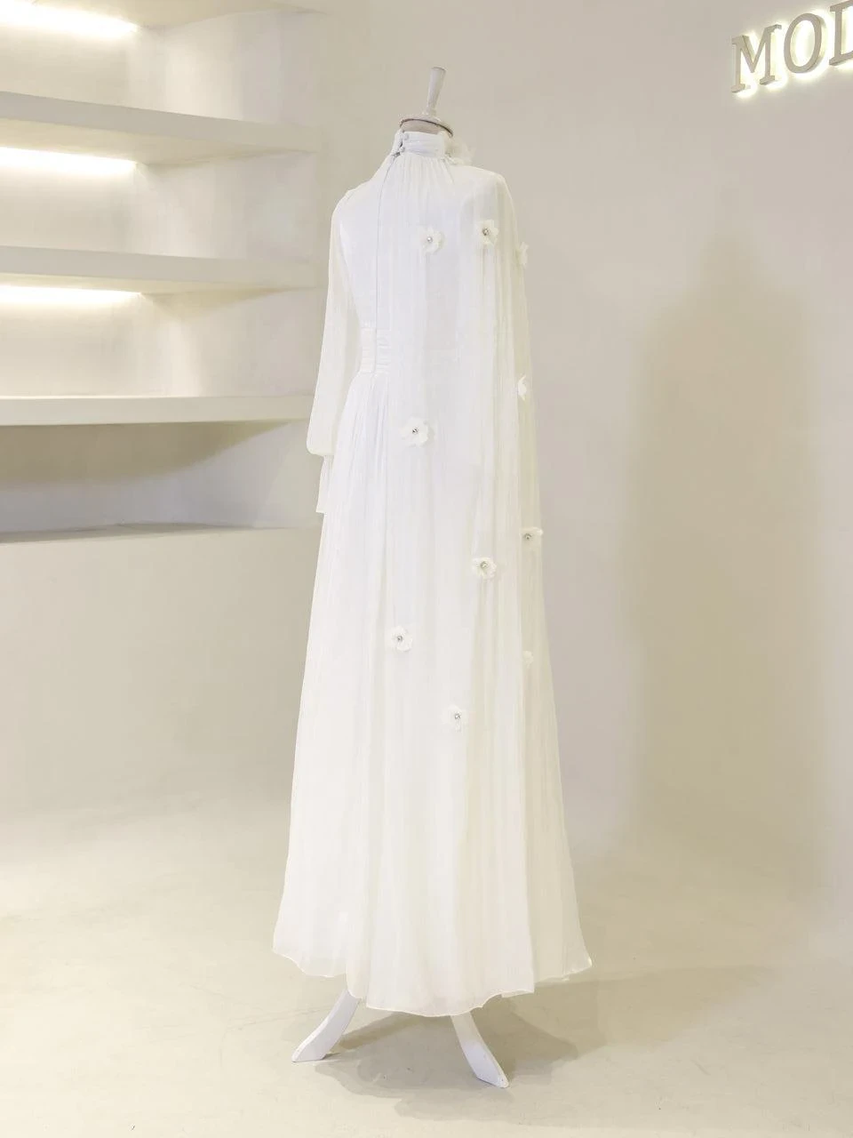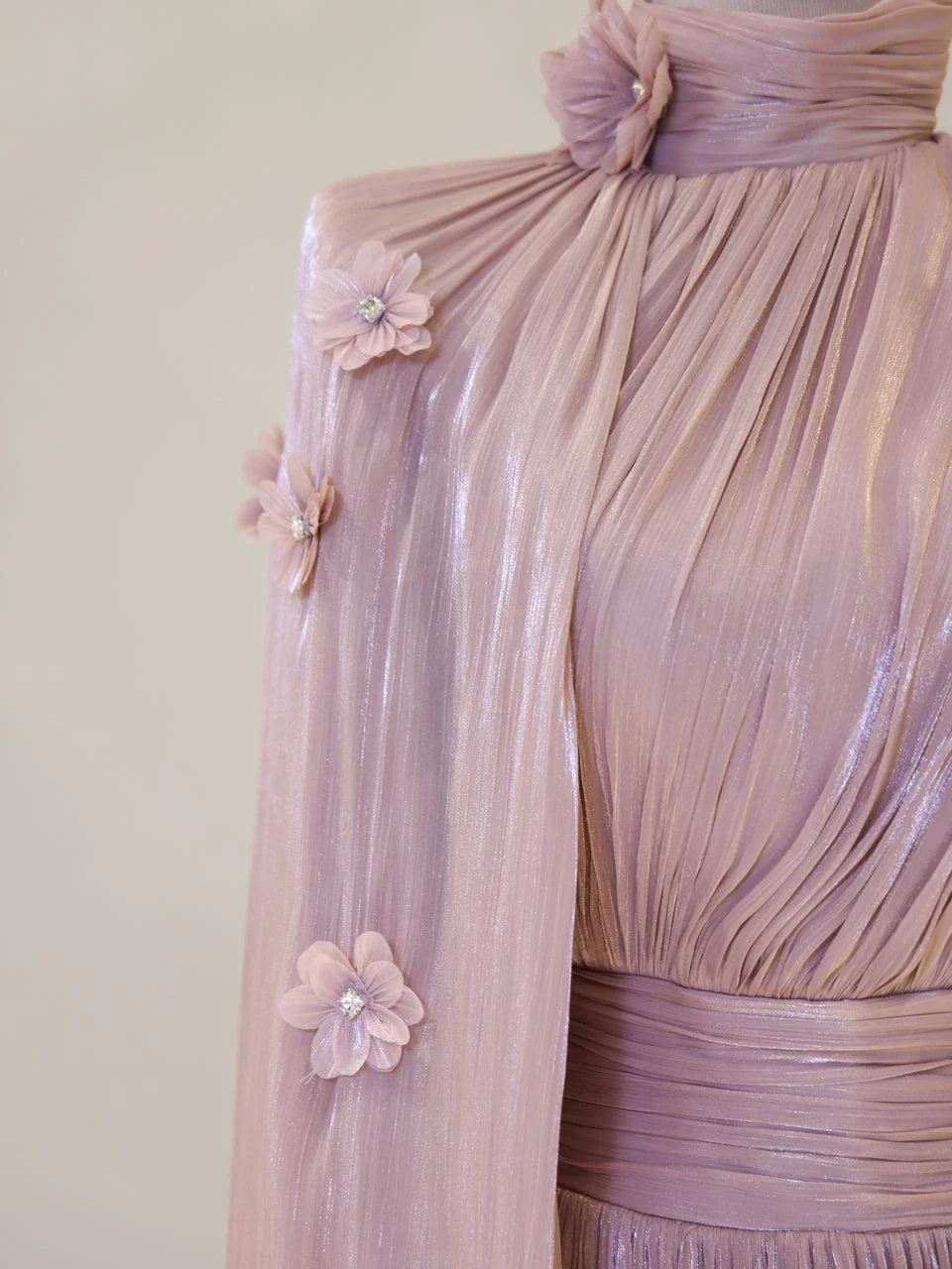 The Tenzin Modest Evening Dress is designed for those who appreciate elegance and modesty. Made from orchid fabric, this dress is fully lined and features a back zipper for easy wear. It includes a bust pad for added comfort and support. The dress has a straight skirt form and is approximately 150 cm in length. A distinctive cape detail extends from the right shoulder to the hem, adding a touch of sophistication. The embellishments are securely attached, ensuring durability.