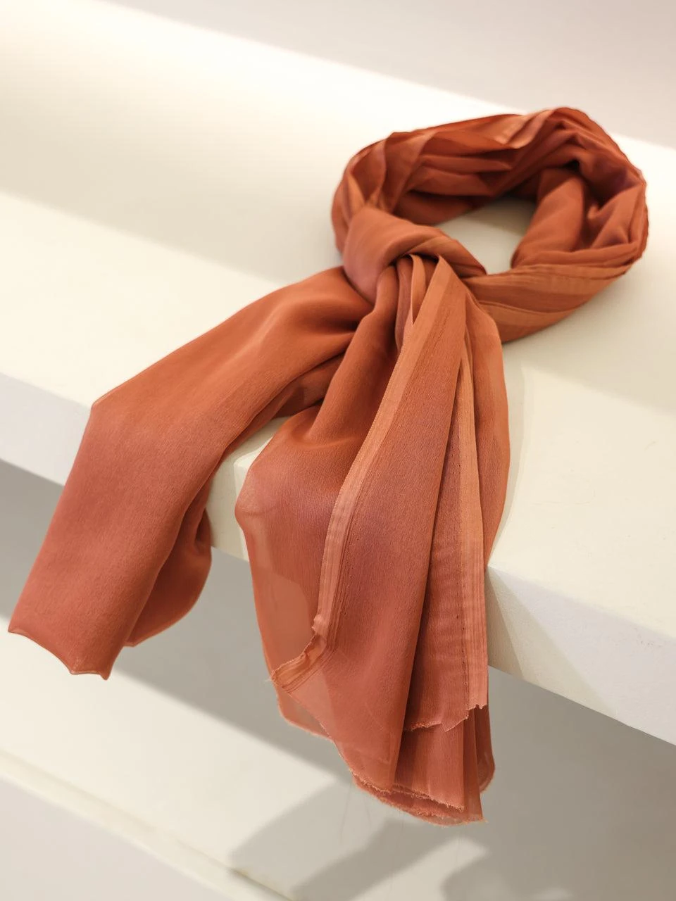 This fabric is made from janjan chiffon and comes in a terracotta color. The fabric width is 1.50 meters and it is sold by the meter. A standard shawl length is 2 meters. Please select your desired dimensions for different options. Note: Returns and exchanges are not accepted.