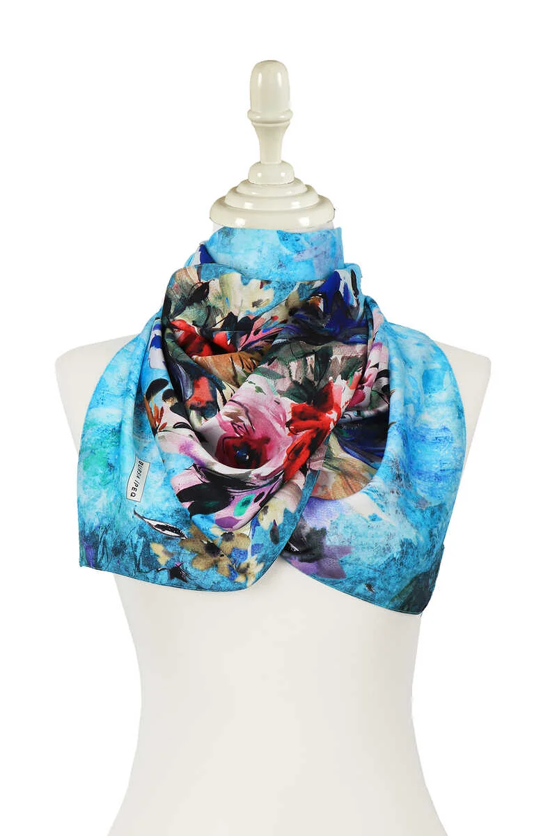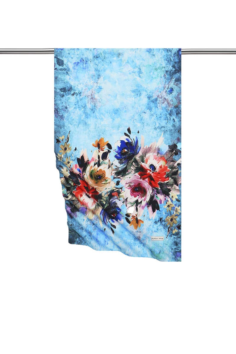 The Turkuaz Flower İpeksi Fular combines vibrant floral patterns with a silky rayon fabric. It measures 45 x 160 cm and is made in Bursa, Turkey.