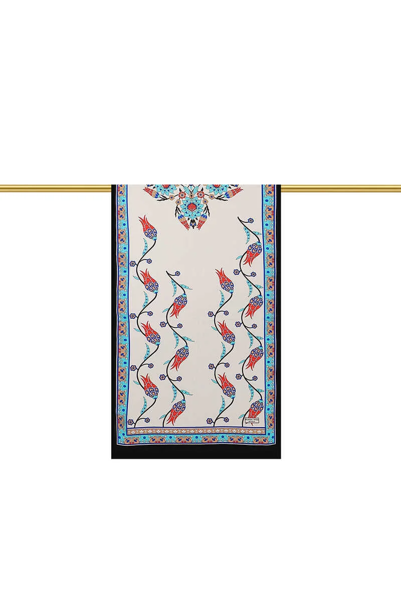 The Turkuaz Siyah Sıra Lale İpek Fular is a 100% silk scarf featuring eye-catching patterns in turquoise and black. It measures 55×160 cm and originates from Bursa, Turkey.