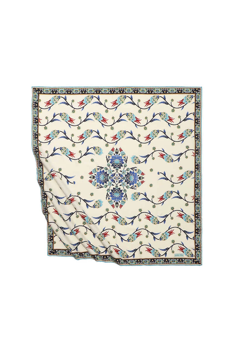 The Turkuaz Sıra Lale Desen İpeksi Eşarp is made from 100% silky rayon fabric and measures 90×90 cm. It features a vibrant tulip pattern and originates from Bursa, Turkey.