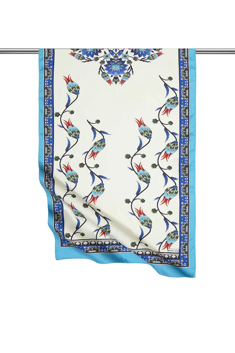 This wide scarf features a classic tulip pattern in bright and vibrant turquoise colors. Crafted from 100% silky rayon, it measures 55×160 cm, offering ease of use and style. Originating from Bursa, Turkey, this scarf combines traditional design with modern flair.