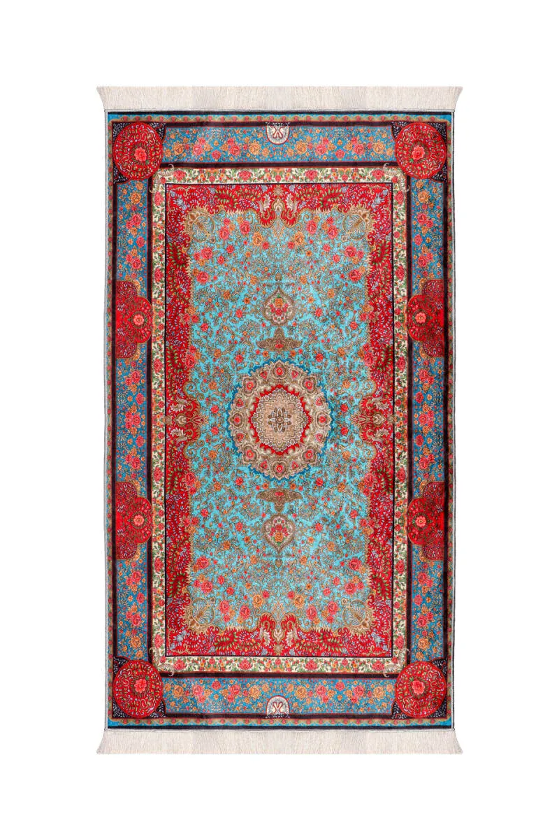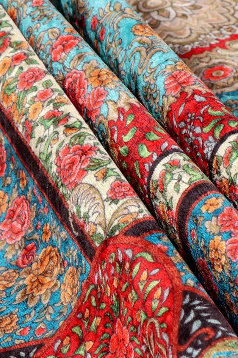 The Turkuaz Kadife Halı Seccade features a silky texture and eye-catching colors, designed for decorative appeal. It measures 65 x 115 cm and is made in Bursa, Turkey.