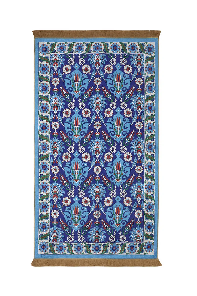 The Saks Kadife Halı Seccade is a prayer rug featuring Turkish motifs and ceramic patterns, designed for decorative appeal. It measures 65x115cm and is made with a velvet texture for comfortable use.