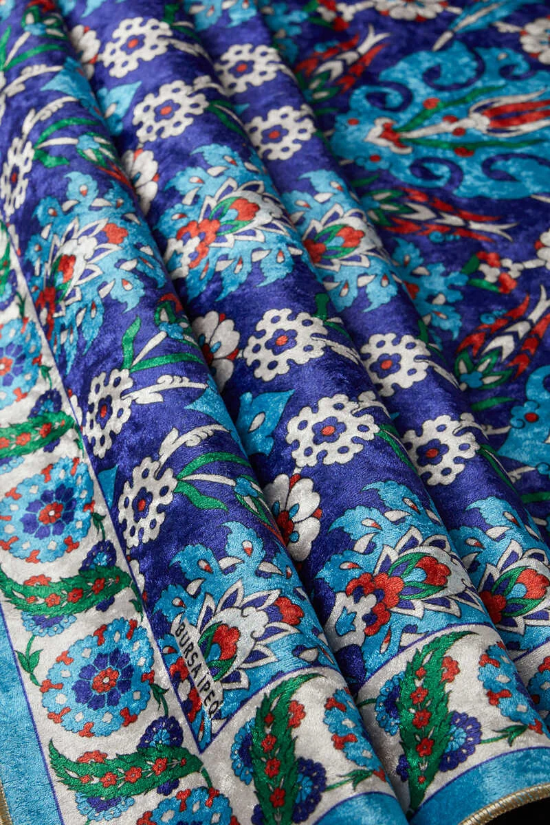 This velvet prayer rug combines traditional Turkish motifs with intricate tile patterns, offering a decorative appearance. Measuring 65×115 cm, it is designed to provide comfort during use. Originating from Bursa, Turkey, this rug is crafted to enhance your space with its eye-catching design.
