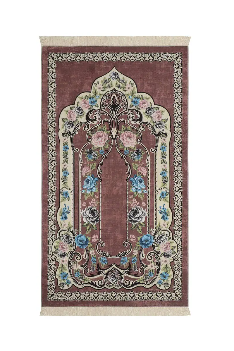 The "Gül Kurusu Kadife Halı Seccade" is a velvet prayer rug featuring Turkish motifs and Chinese patterns, designed for decorative appeal. It measures 65×115 cm and originates from Bursa, Turkey.