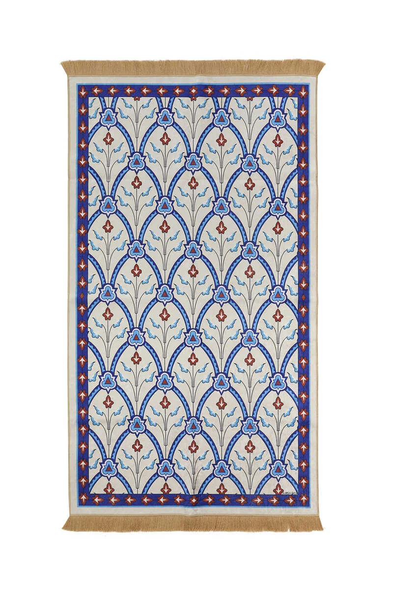 This velvet prayer rug showcases traditional Turkish motifs and intricate tile patterns. Designed in Bursa, Turkey, it combines decorative appeal with practicality. The rug measures 65×115 cm, providing ample space for comfortable use.