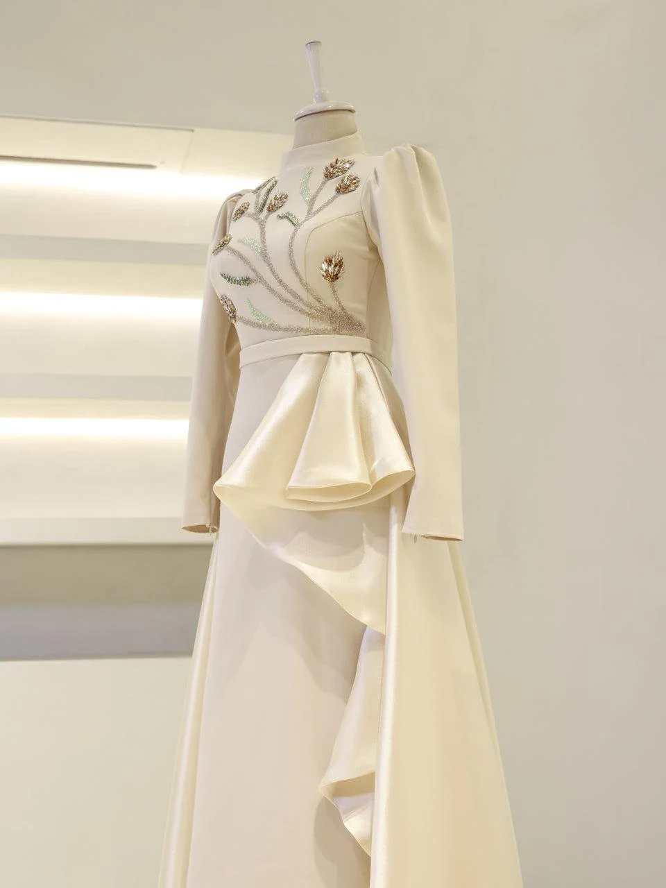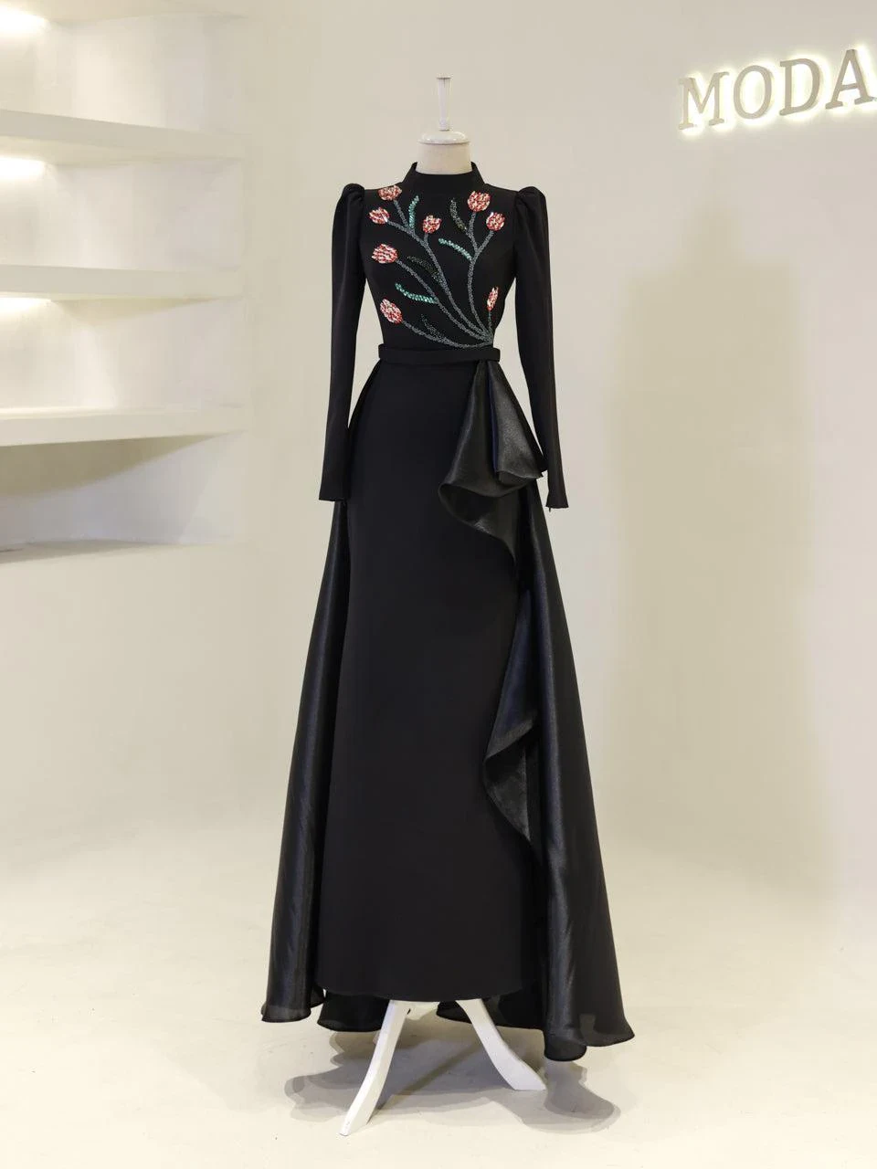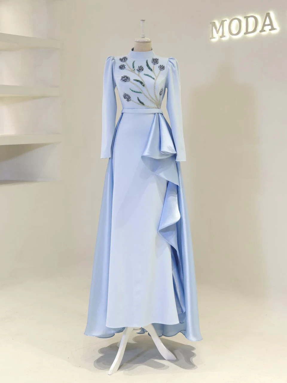 The Veylin Modest Evening Dress is designed with a precise fit, measuring 160 cm in length, with an additional 15 cm for the cape. The dress is crafted from crepe fabric, while the cape is made from taffeta. Both the cape and belt details are non-detachable, ensuring a seamless look. The dress features a flared skirt with a cascading detail from the waist to the hem, and is equipped with a back zipper for easy wear. It is fully lined and includes a chest pad for added comfort. The embellishments are adhered to the fabric, providing a sophisticated appearance.