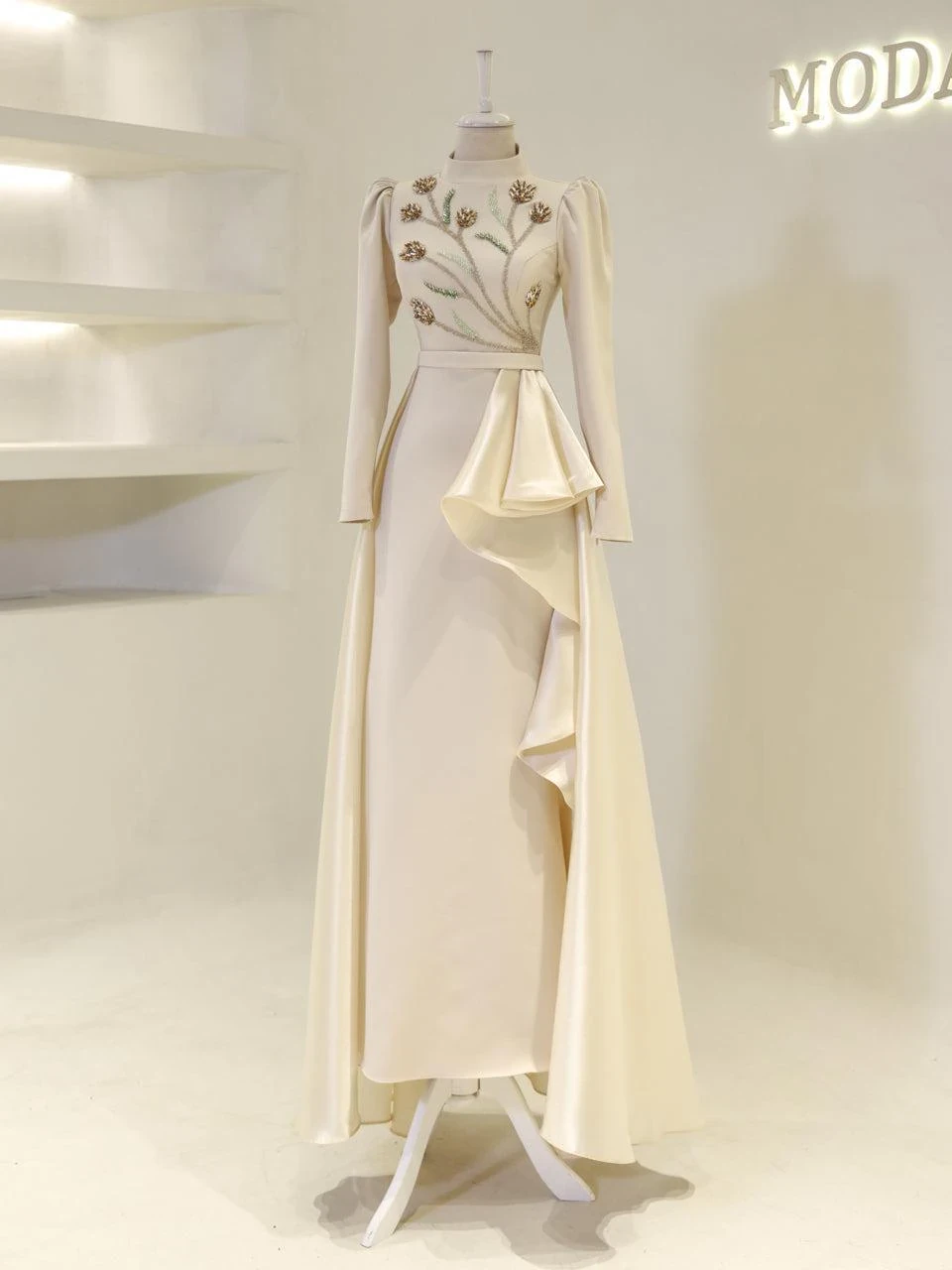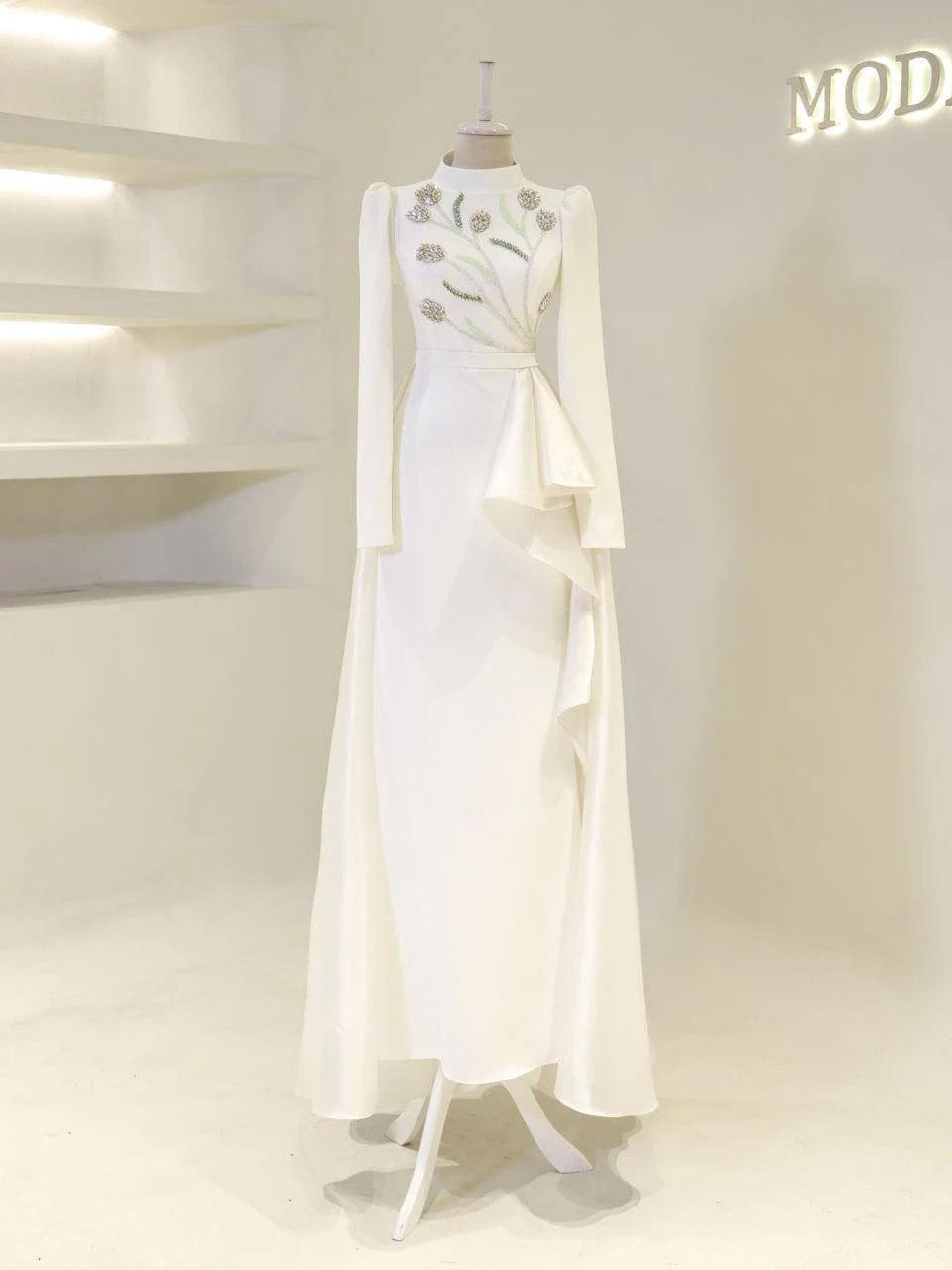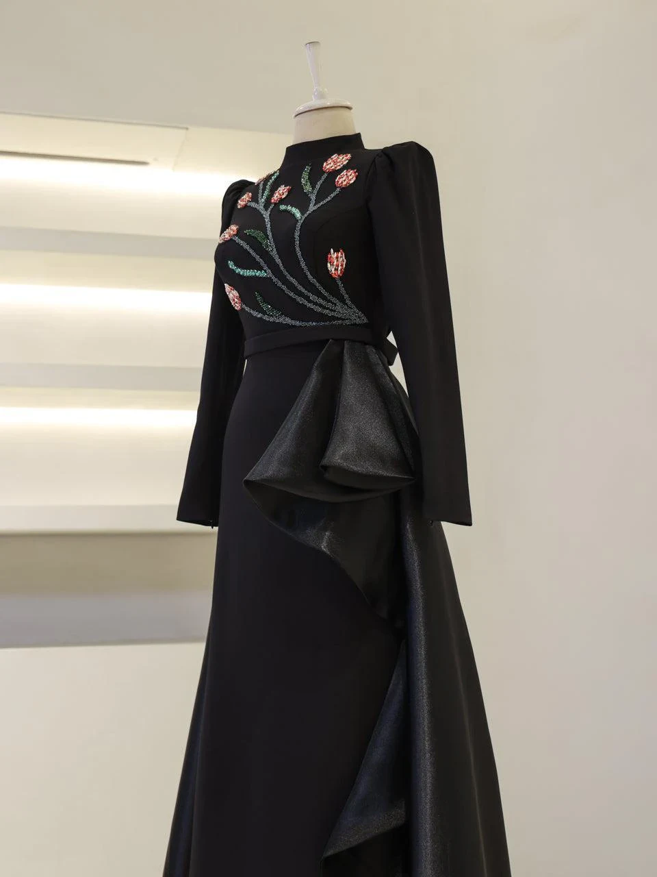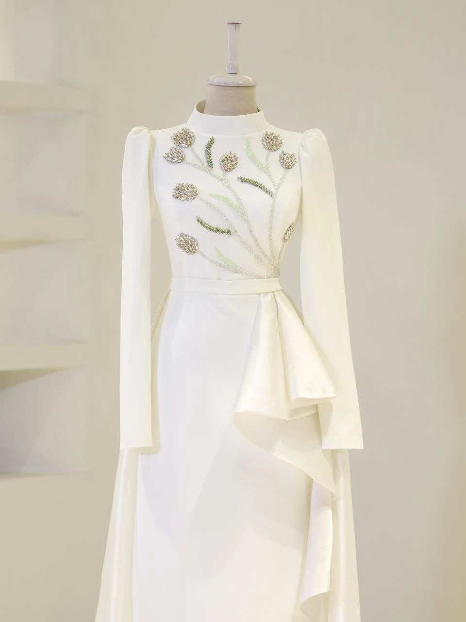 The Veylin Modest Evening Dress is designed with a precise fit, measuring 160 cm in length, with an additional 15 cm for the cape. The dress is crafted from crepe fabric, while the cape is made from taffeta. Both the cape and belt details are non-detachable, ensuring a seamless look. The dress features a flared skirt with a cascading detail from the waist to the hem, and is equipped with a back zipper for easy wear. It is fully lined and includes a chest pad for added comfort. The embellishments are adhered to the fabric, providing a sophisticated appearance.