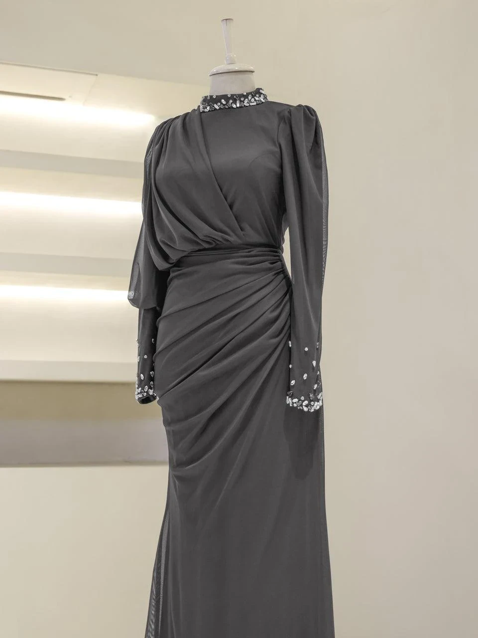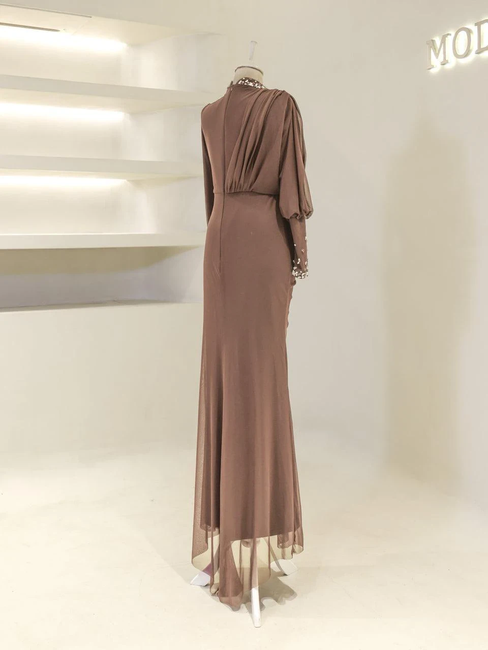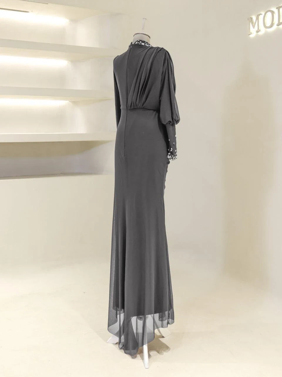The Viera Modest Evening Dress offers a sophisticated look with its full-length design. The front length is approximately 160 cm, while the back length is about 185 cm. Made from tulle fabric, this dress includes a lining for comfort and coverage. It features a back zipper closure and built-in bust pads for support. The embellishments are securely attached, and the dress has a puff sleeve design with a zipper detail on the sleeve. The right shoulder features a drape detail, and the skirt has a flared silhouette.