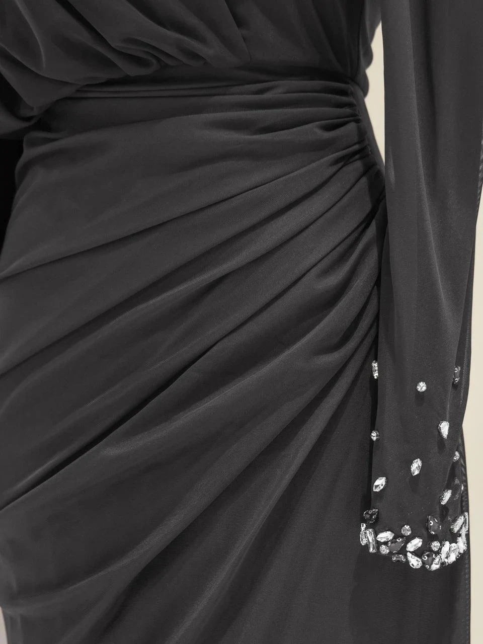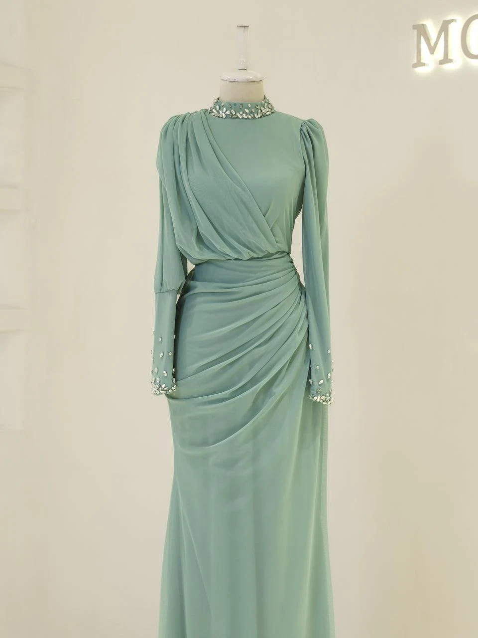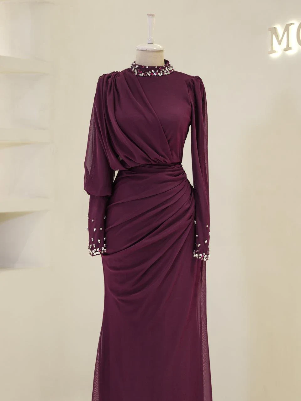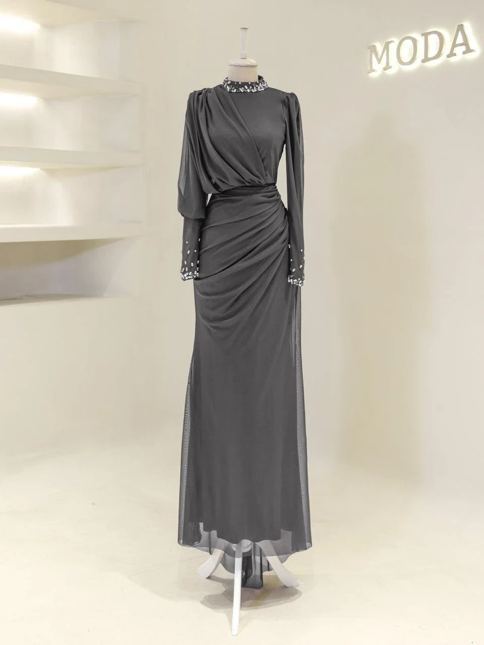 The Viera Modest Evening Dress offers a sophisticated look with its full-length design. The front length is approximately 160 cm, while the back length is about 185 cm. Made from tulle fabric, this dress includes a lining for comfort and coverage. It features a back zipper closure and built-in bust pads for support. The embellishments are securely attached, and the dress has a puff sleeve design with a zipper detail on the sleeve. The right shoulder features a drape detail, and the skirt has a flared silhouette.