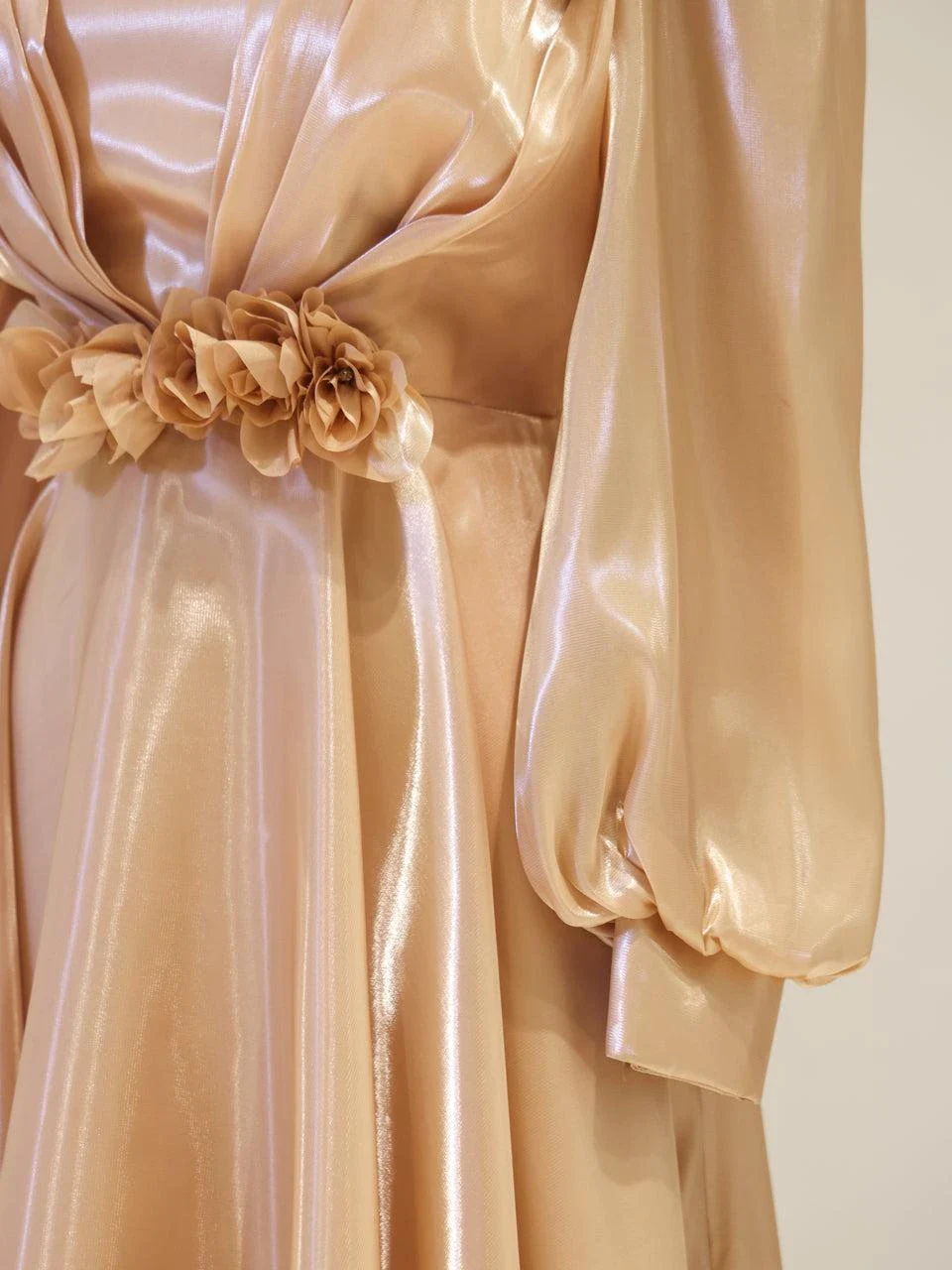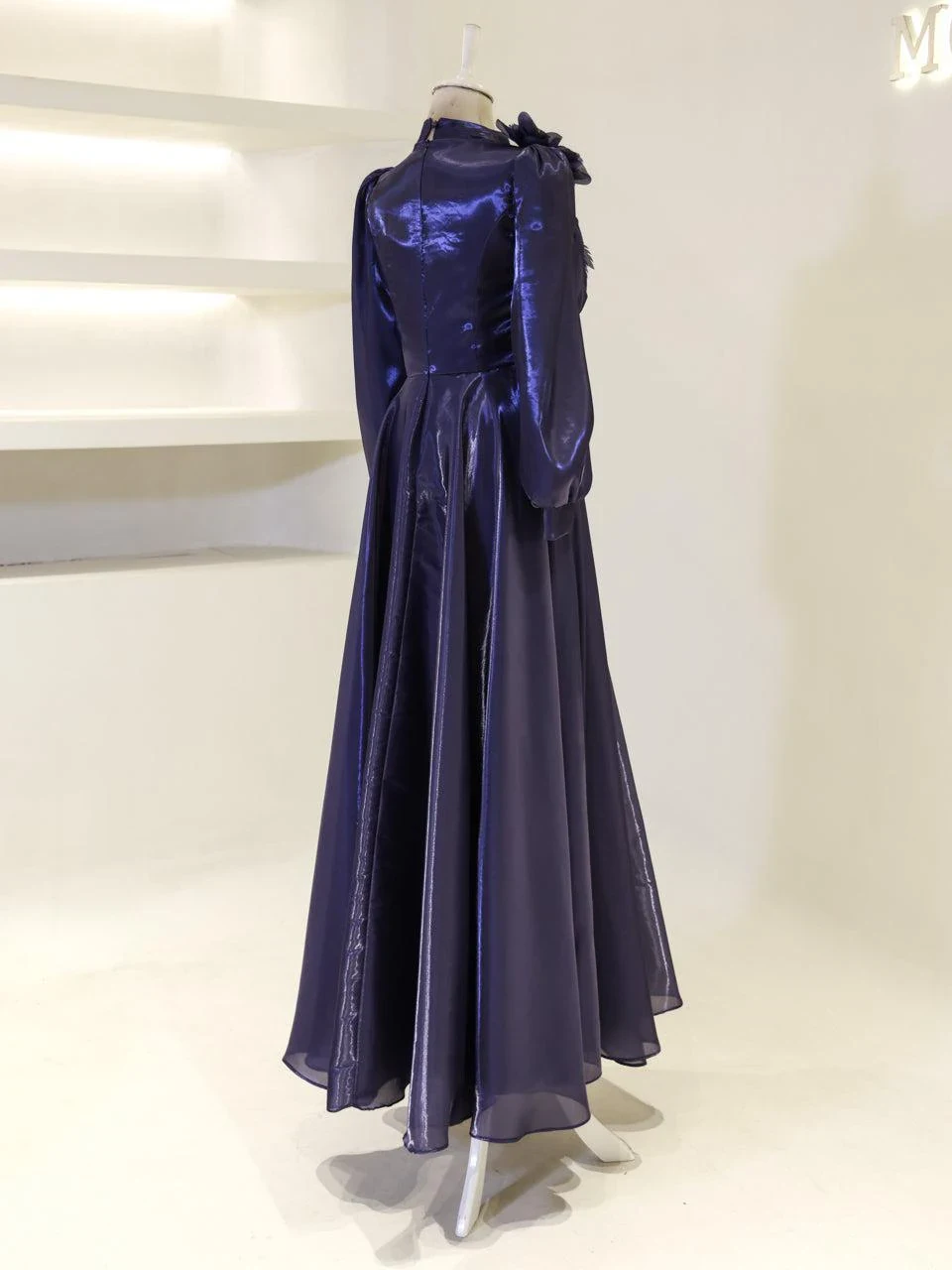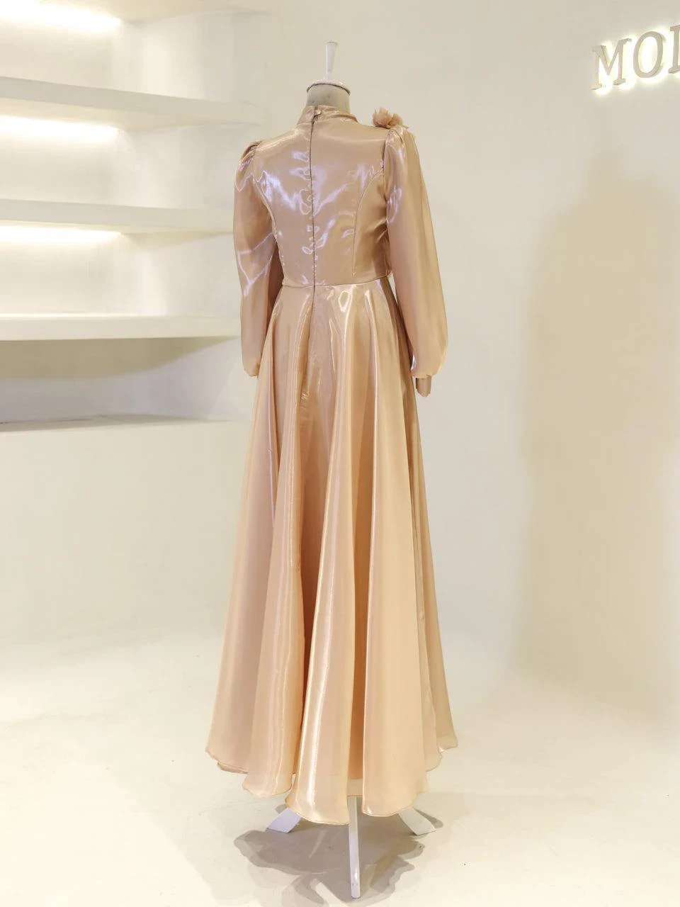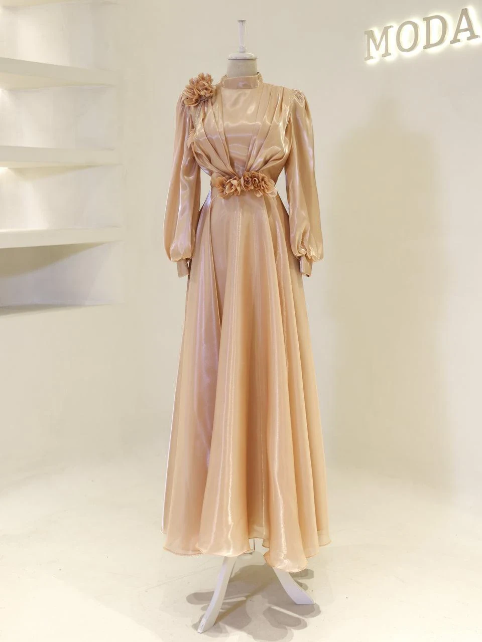 The Vionella Modest Evening Dress is designed with a full fit, ensuring a comfortable and elegant appearance. The dress is 160 cm long and crafted from high-quality orchid fabric, providing a luxurious feel. It features balloon sleeves and is equipped with a back zipper for easy wear. The dress includes a chest pad for added comfort and support. The brooch details on the shoulder and waist are detachable, allowing for versatile styling. The dress is designed with a flared skirt, adding a touch of sophistication.