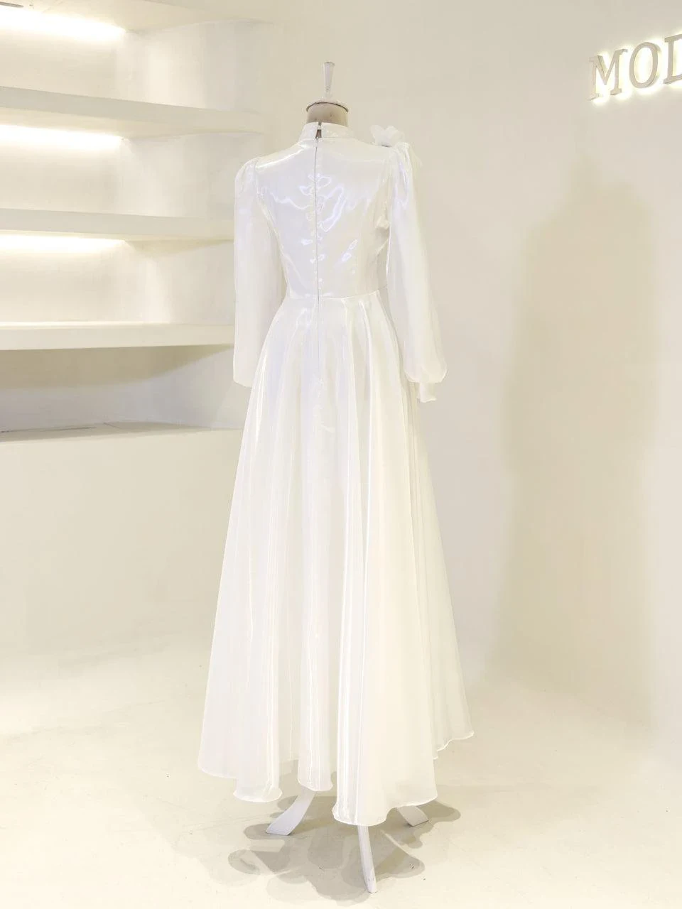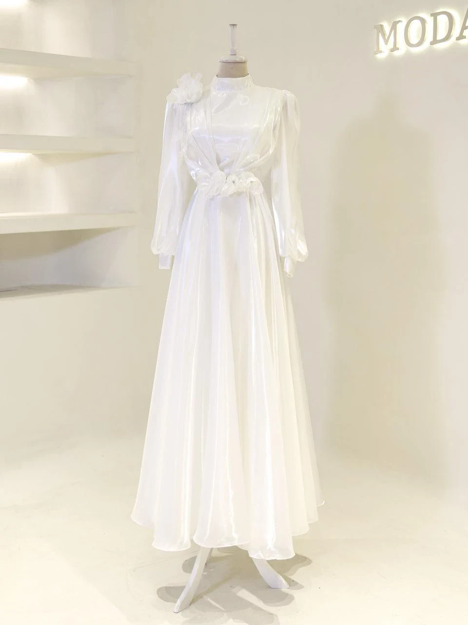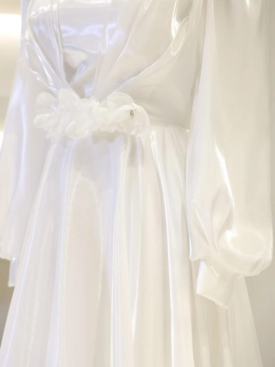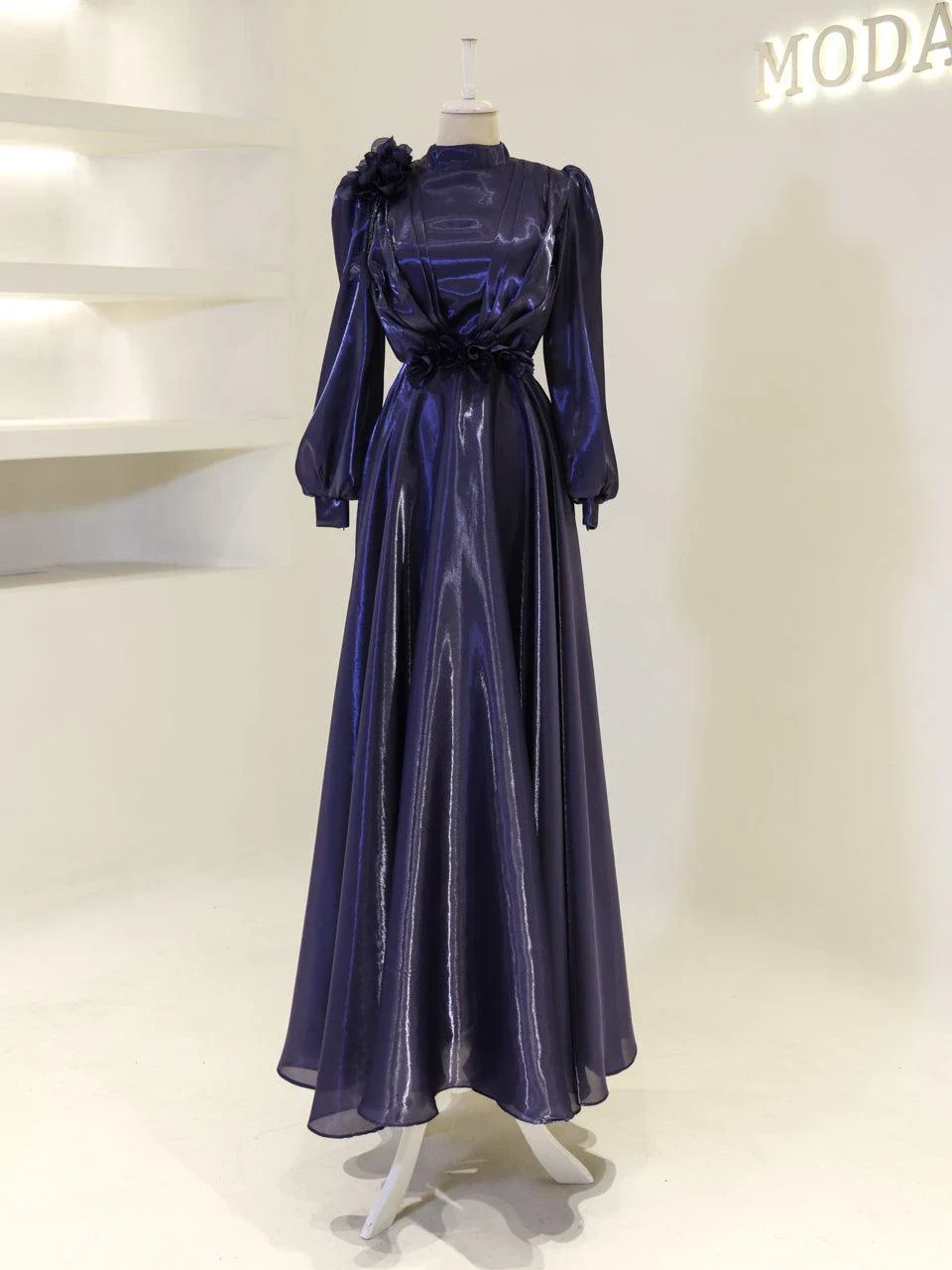 The Vionella Modest Evening Dress is designed with a full fit, ensuring a comfortable and elegant appearance. The dress is 160 cm long and crafted from high-quality orchid fabric, providing a luxurious feel. It features balloon sleeves and is equipped with a back zipper for easy wear. The dress includes a chest pad for added comfort and support. The brooch details on the shoulder and waist are detachable, allowing for versatile styling. The dress is designed with a flared skirt, adding a touch of sophistication.