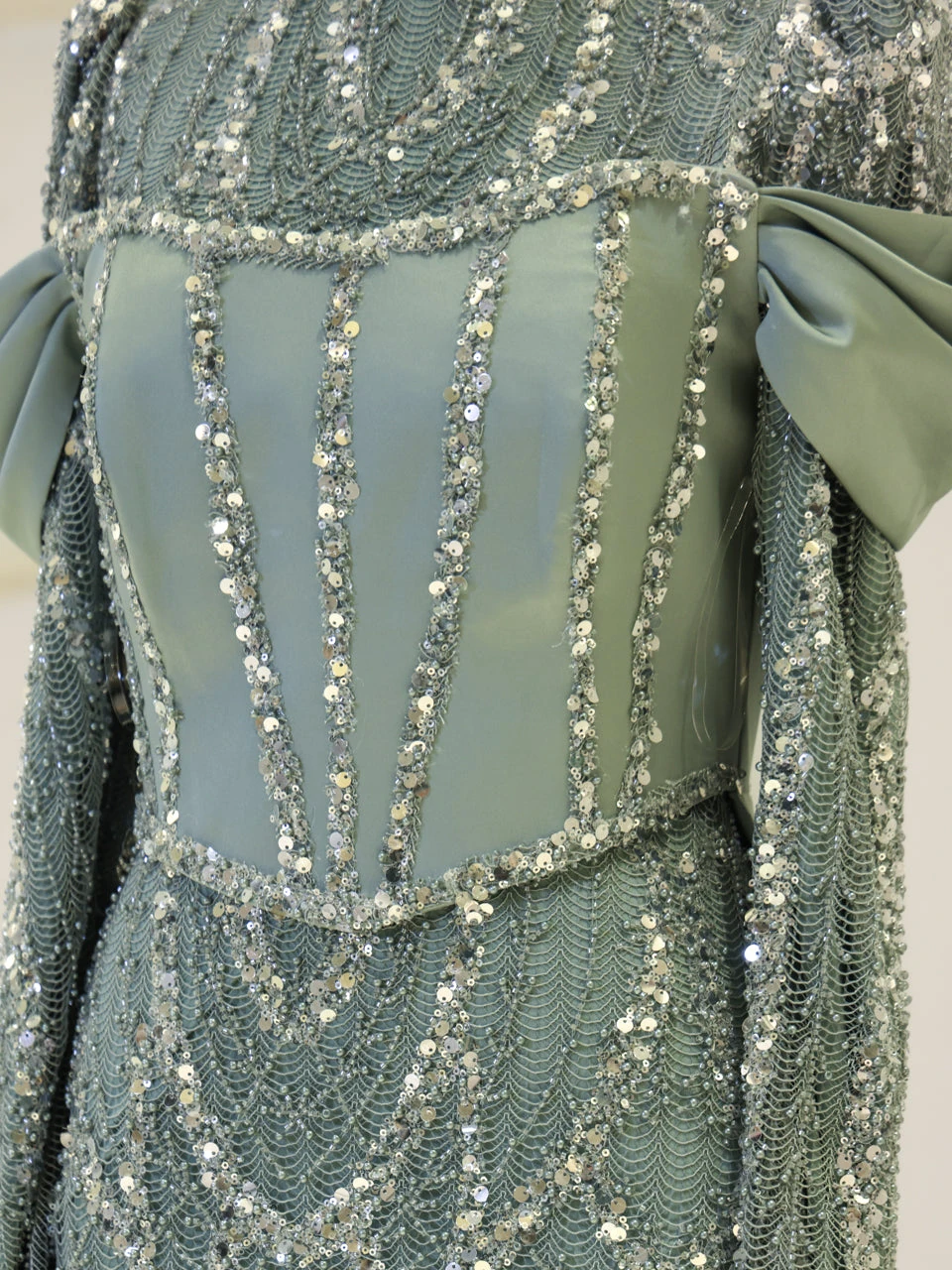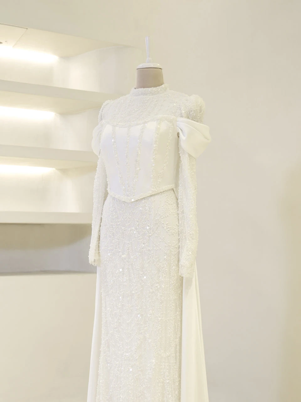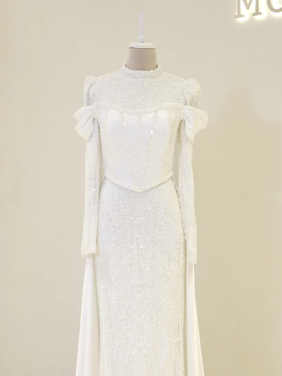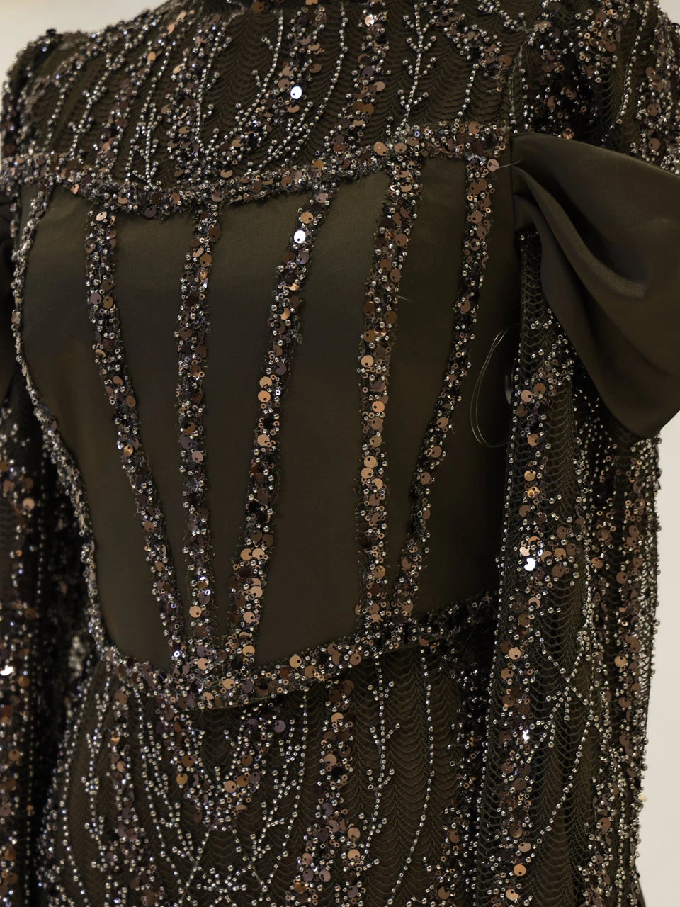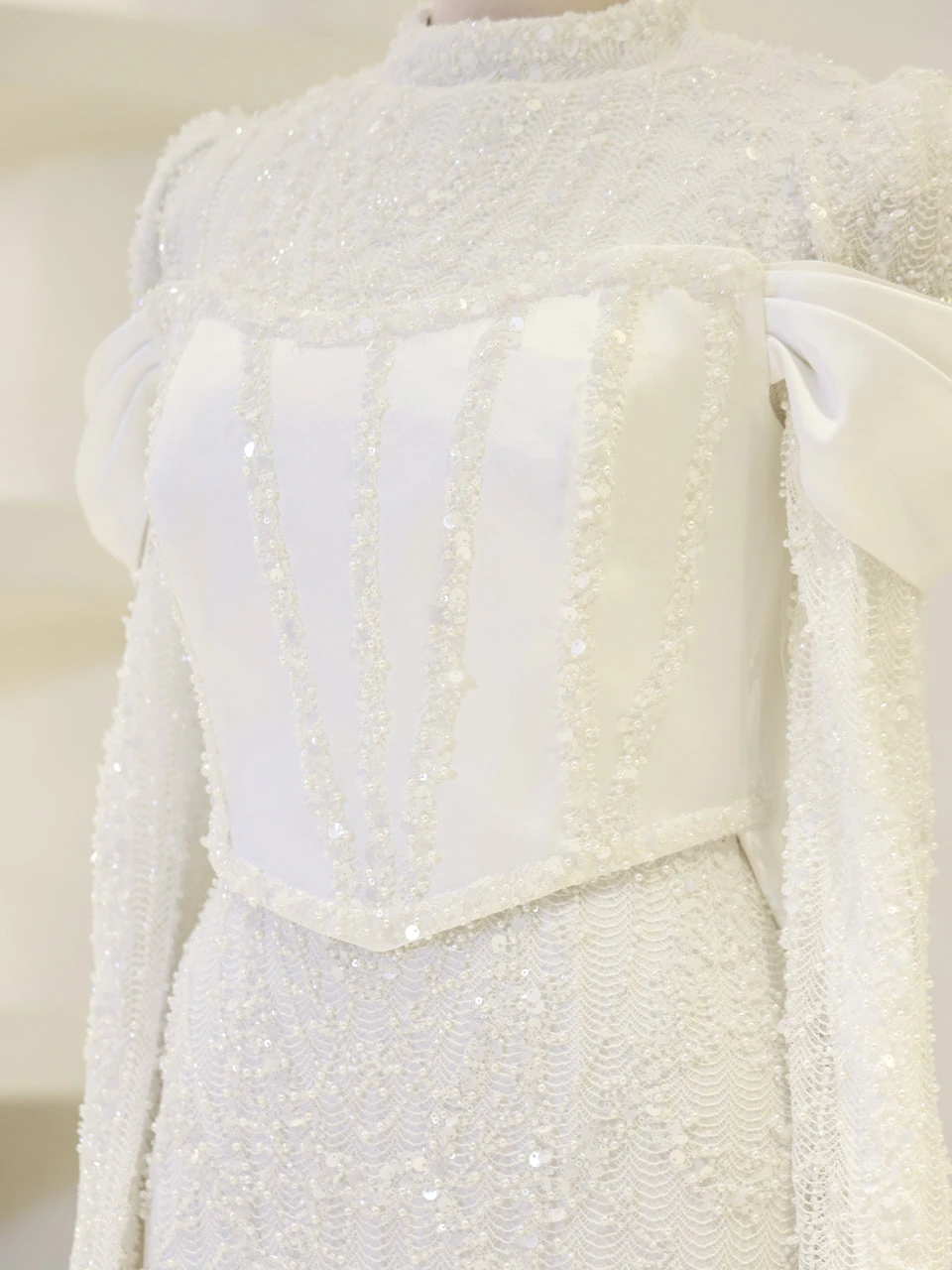 The Vionne Modest Evening Dress offers a true-to-size fit with an average length of 165 cm. It features an embroidered fabric with a detachable corset and satin cape. The dress is designed with a back zipper and includes a built-in chest pad. It is fully lined and showcases both sewn and glued embellishments. The skirt has a straight form, providing a classic silhouette.