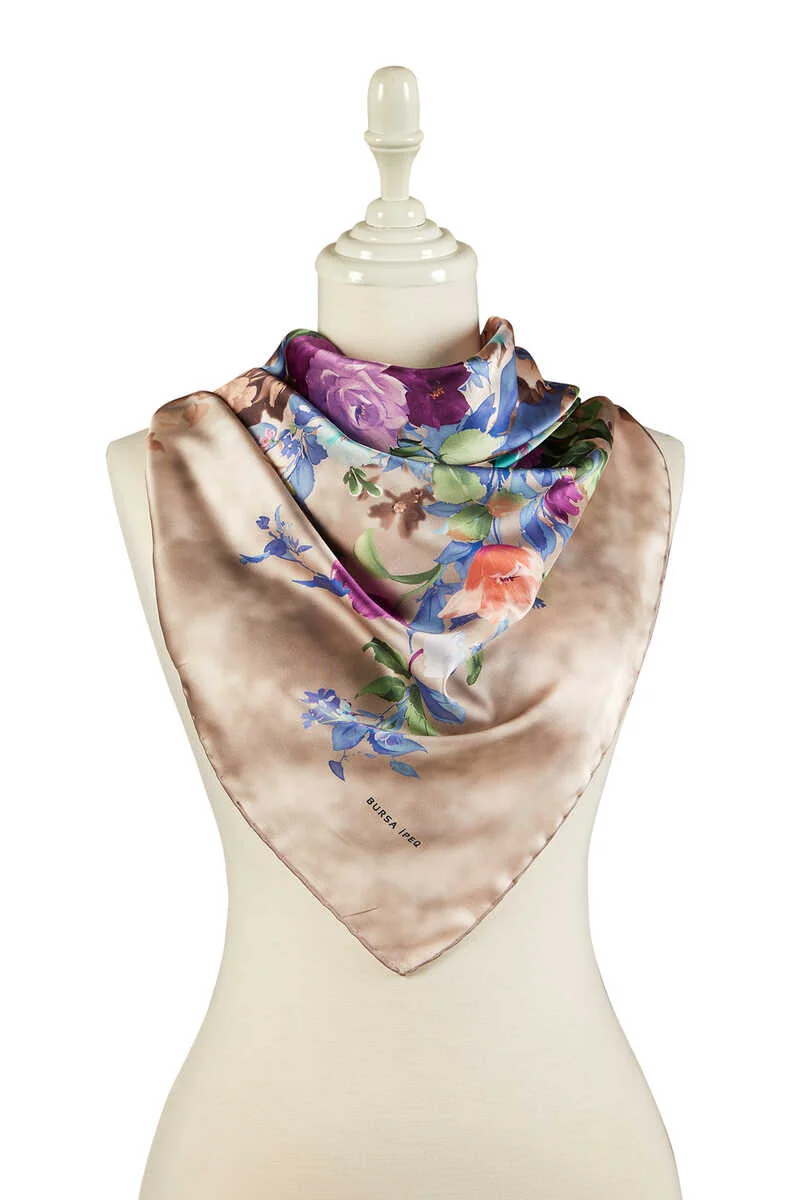 The Vizon Buket Desen İpeksi Eşarp features a floral pattern on silky rayon fabric, combining vibrant colors with a classic design. It measures 90×90 cm and is made in Bursa, Turkey.