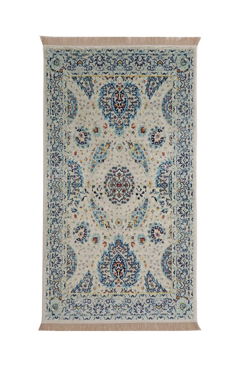 This prayer rug features Turkish motifs and tile patterns, offering a decorative look. Made from bamboo, it measures 67×115 cm, providing a comfortable experience. Originating from Bursa, Turkey, this rug combines traditional design with modern materials.