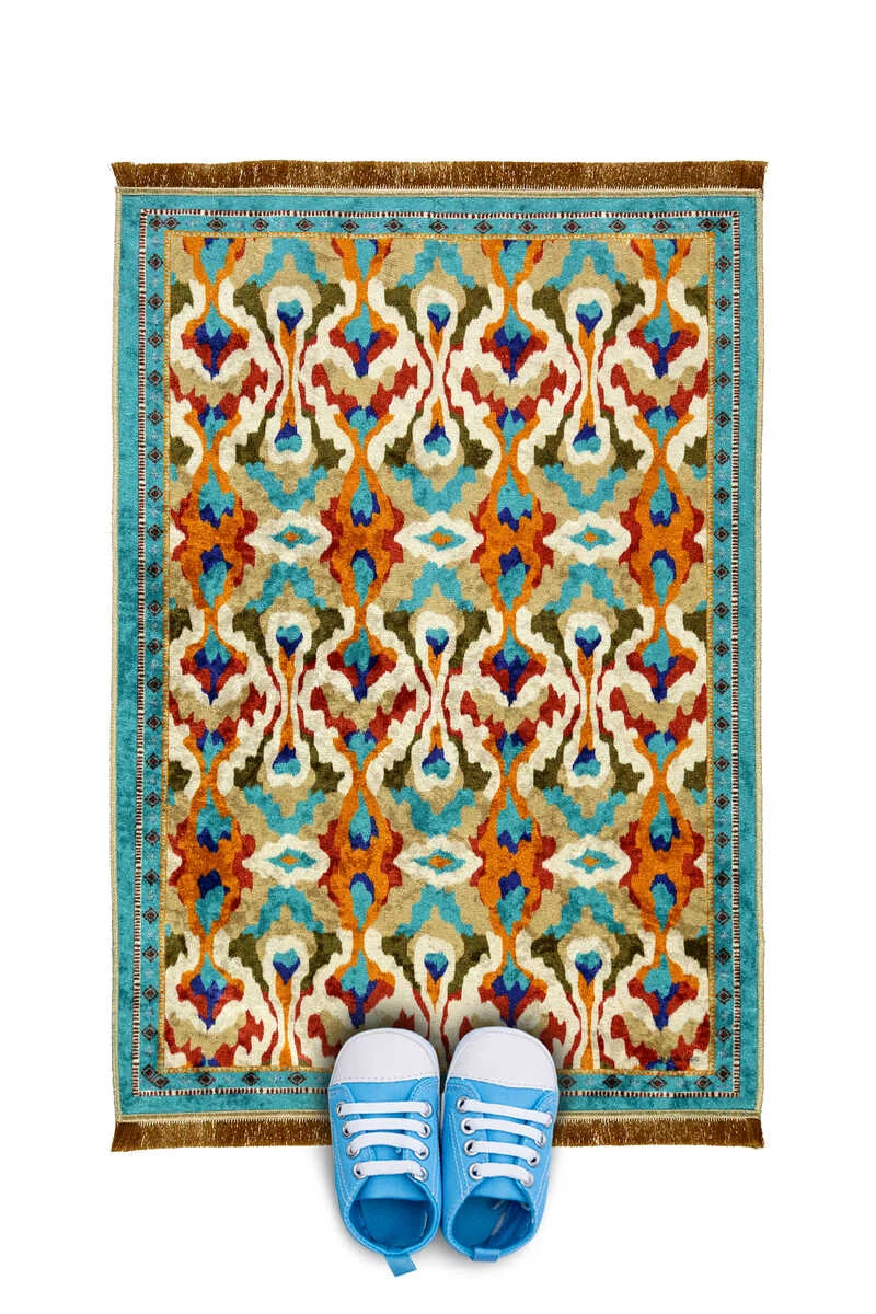 This velvet children's prayer rug features eye-catching colors and patterns, making it an inviting choice for young users. Its dimensions of 45x80cm ensure comfortable use. Originating from Bursa, Turkey, this product combines traditional craftsmanship with child-friendly design.