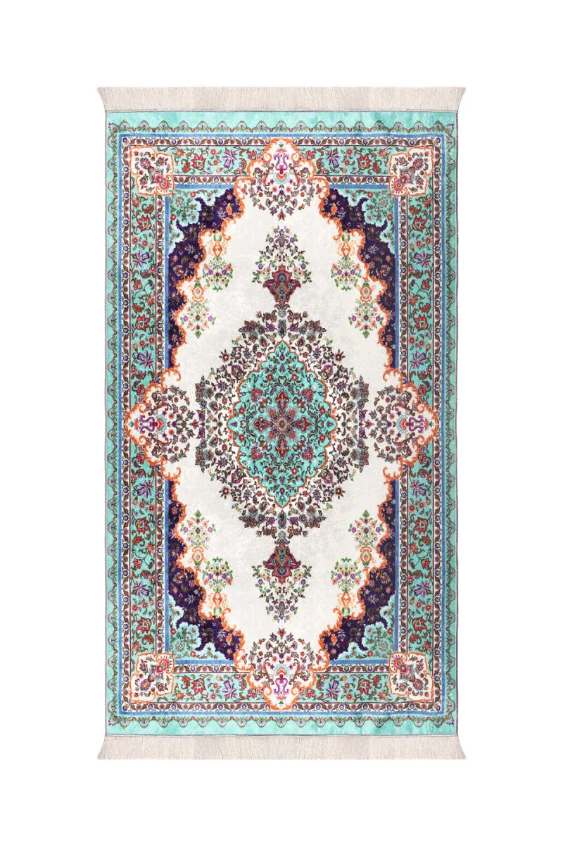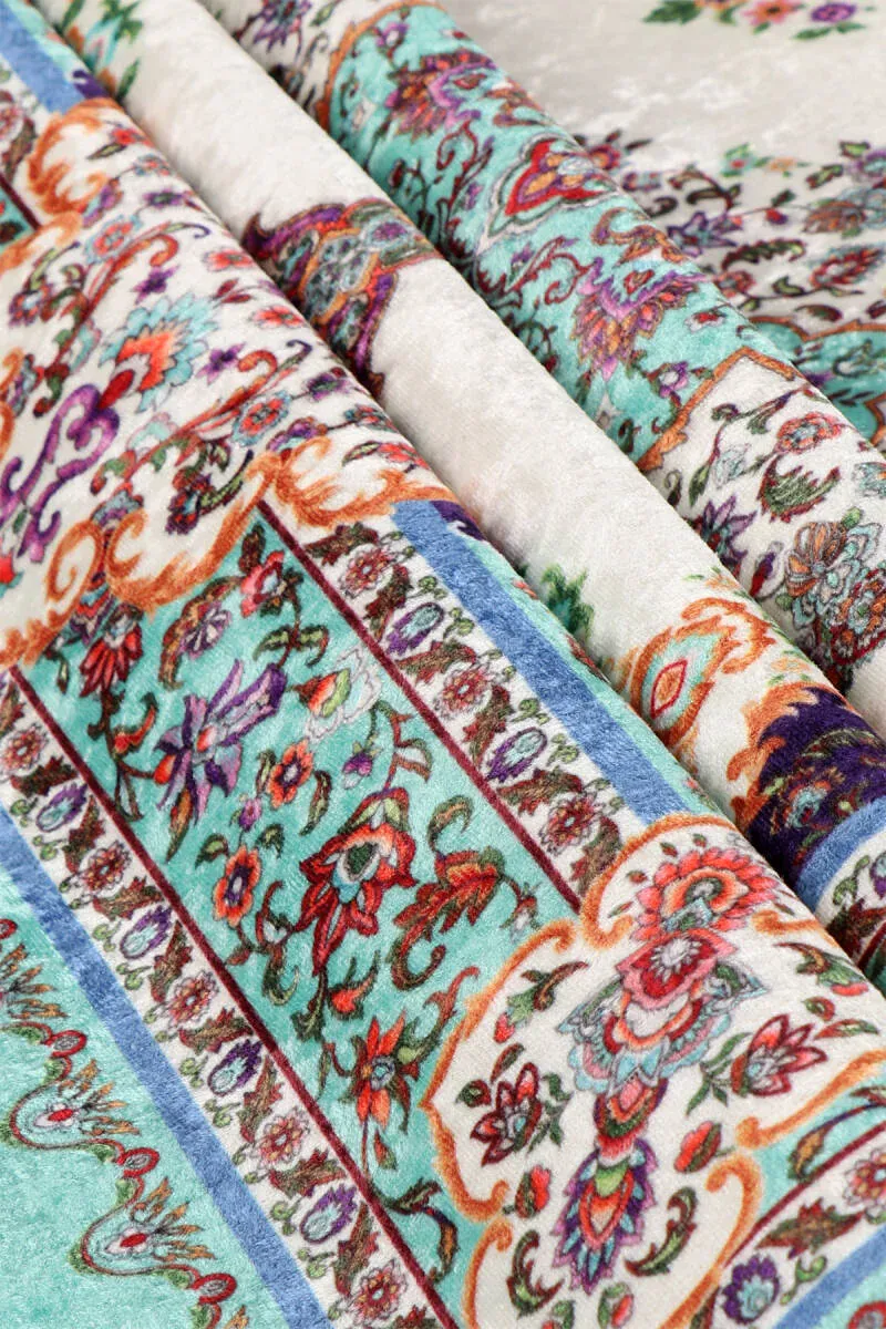 The Su Yeşil Kadife Halı Seccade features a silky texture and vibrant colors, designed for decorative appeal. It measures 65 x 115 cm and is made in Bursa, Turkey.