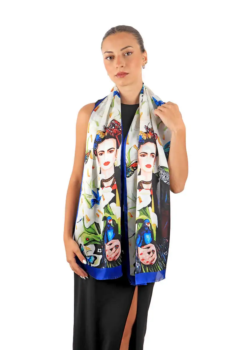 The Beyaz Frida İpek Tablo Fular is a white silk scarf with eye-catching patterns, measuring 45×165 cm. Made from 100% silk, it originates from Bursa, Turkey and complements both formal and artistic settings.