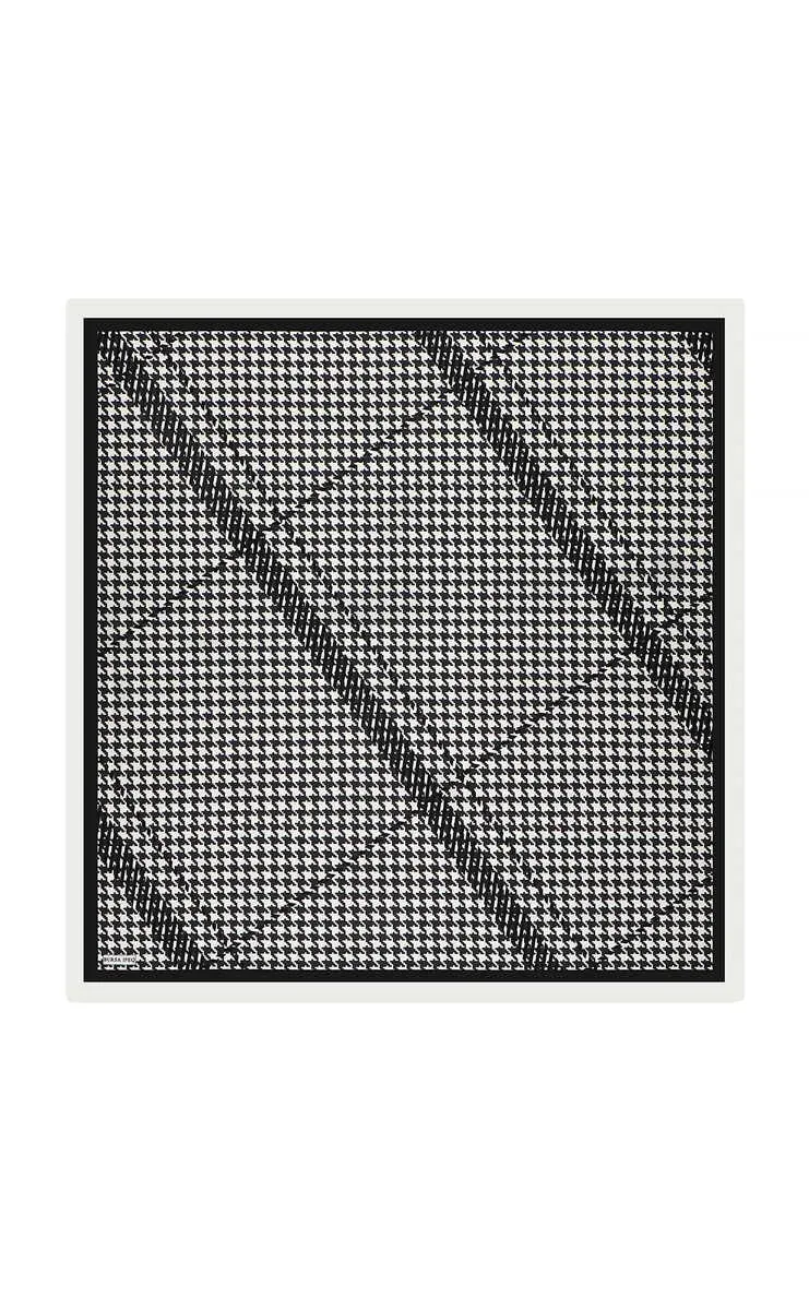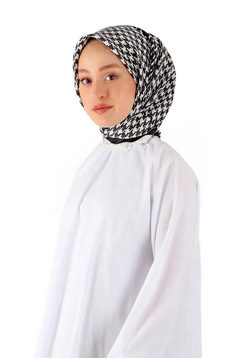 The Beyaz Çizgi Kazayağı Desen Twill İpek Eşarp is a 100% silk scarf measuring 90×90 cm. It originates from Bursa, Turkey and features a unique houndstooth pattern.